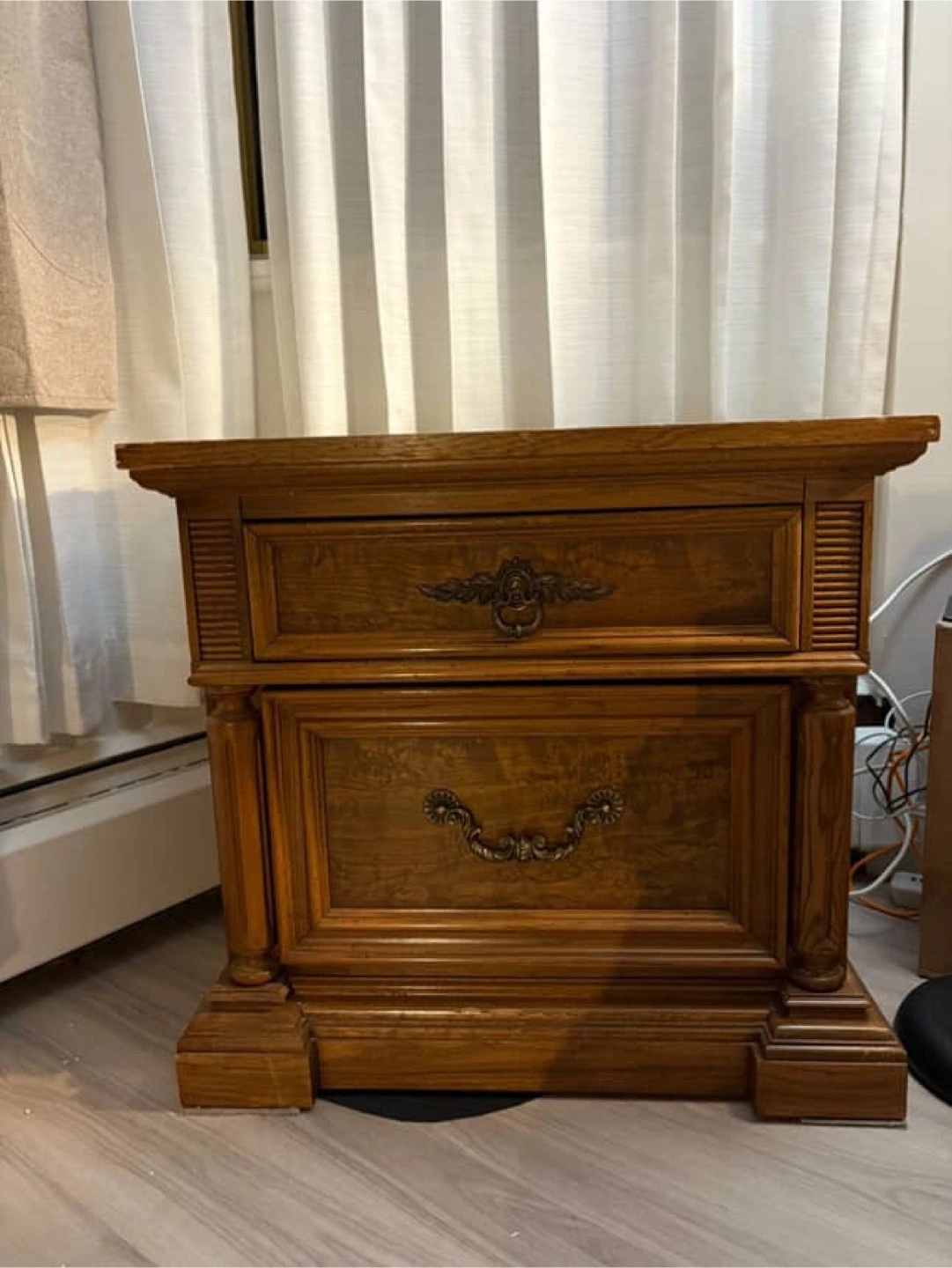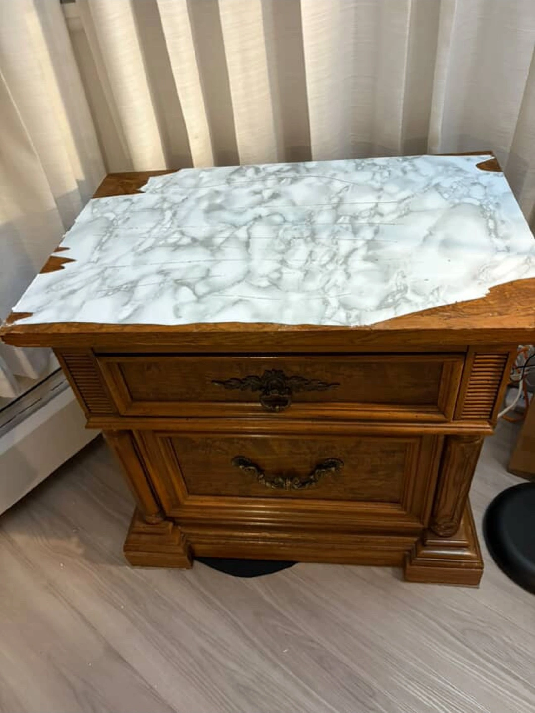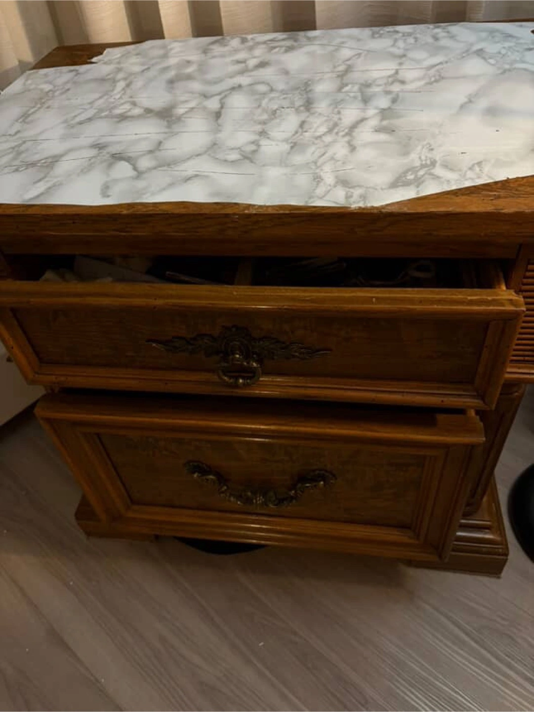 Selling a wooden nightstand with two drawers. It has a classic design with decorative drawer pulls. The top has been covered with a marble-patterned adhesive film.