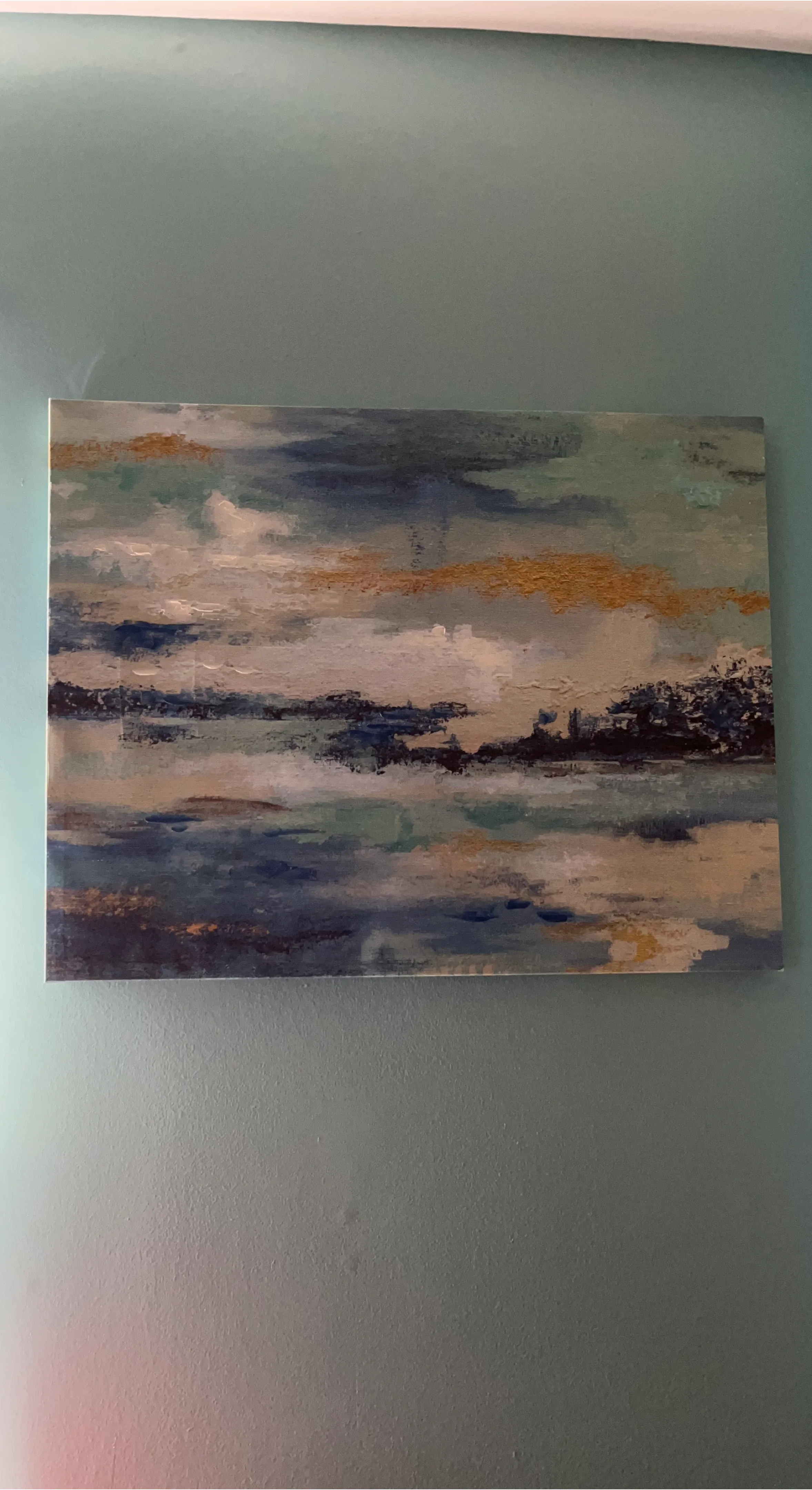This abstract canvas art features a calming landscape with blues, grays, and gold accents. It's ready to hang and adds a touch of modern style to any room. The textured brushstrokes create depth and visual interest. Perfect for a living room or bedroom!
