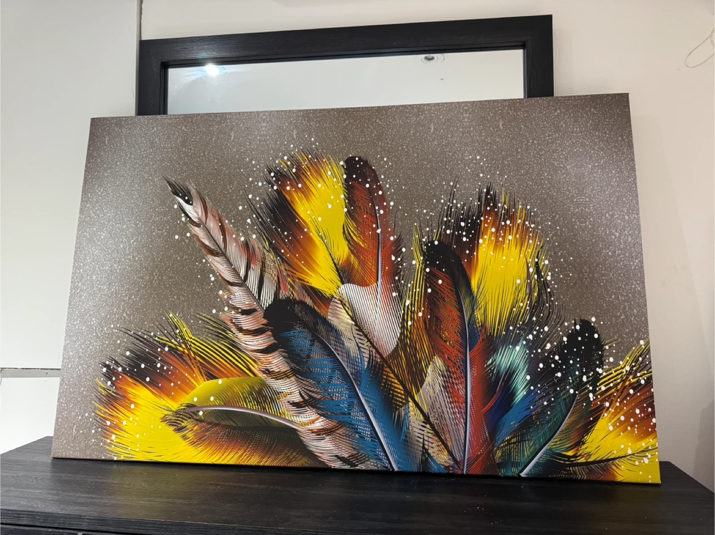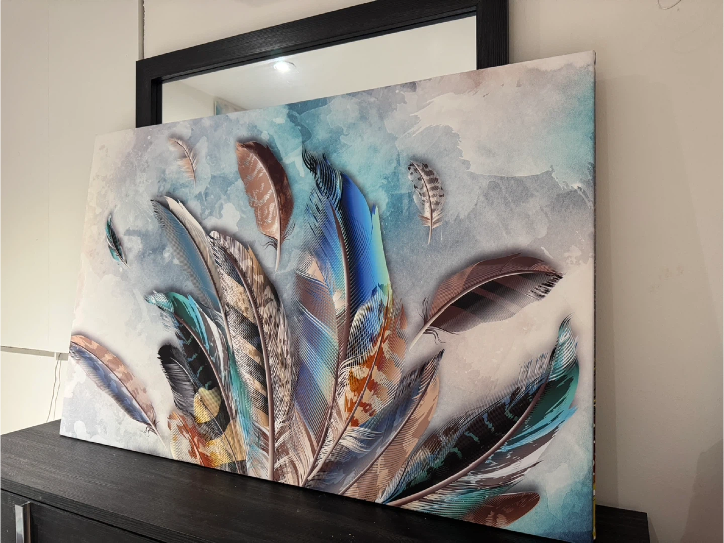 This set includes four canvas wall art pieces, featuring vibrant feather and red poppy floral designs. They're great for adding a pop of colour to any room!