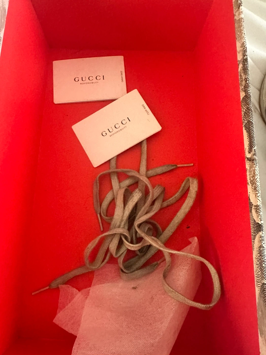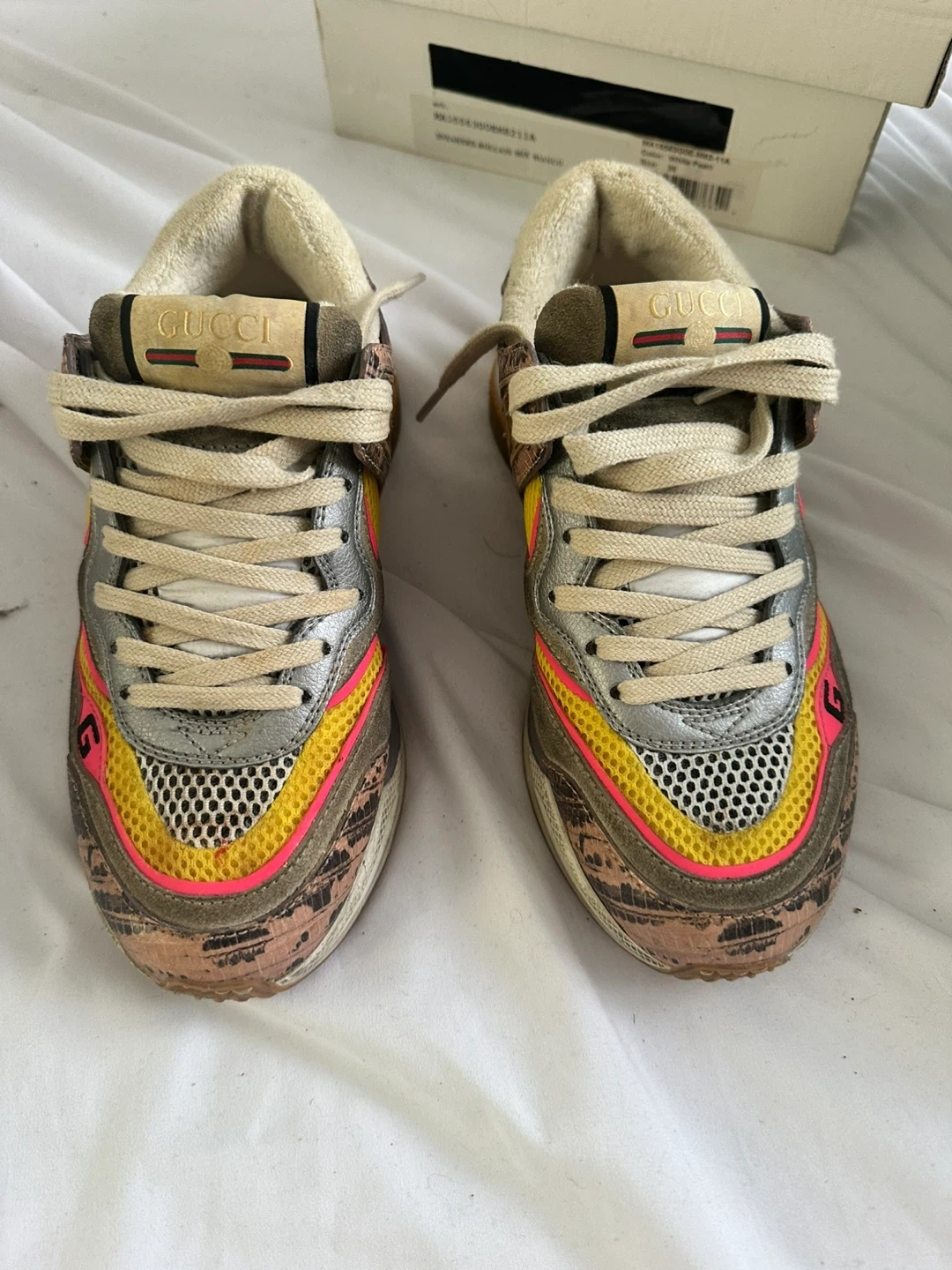 Selling a pair of Gucci Screener sneakers. They come with the original box and all included accessories. These shoes have a unique design with a mix of colors and textures. They are in used condition, so please check the photos for details!
