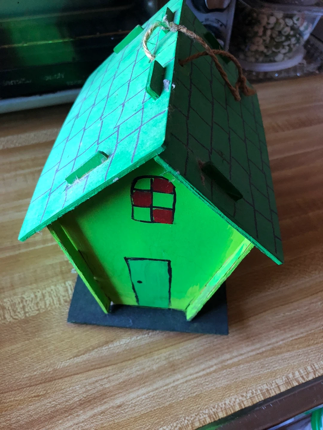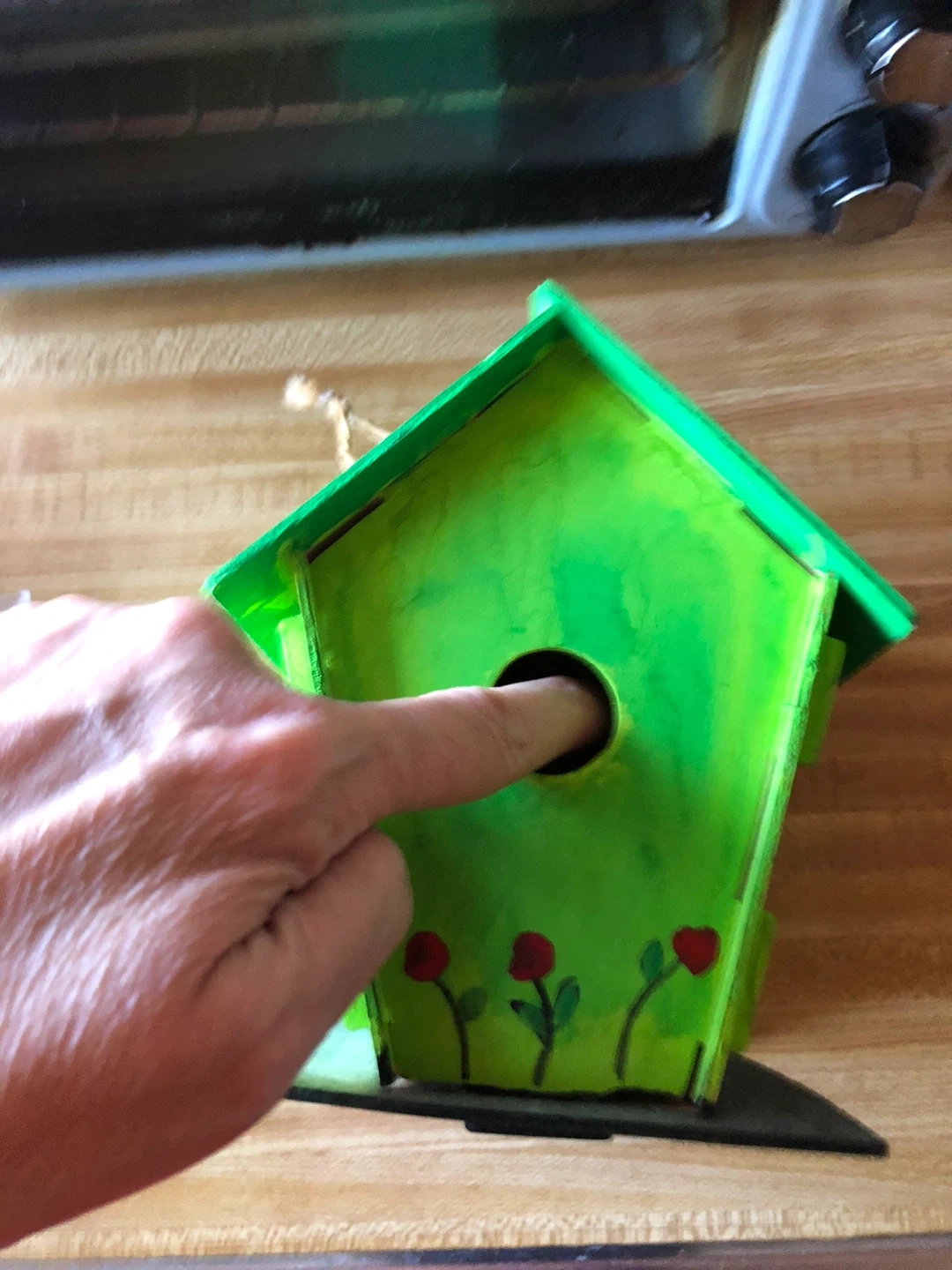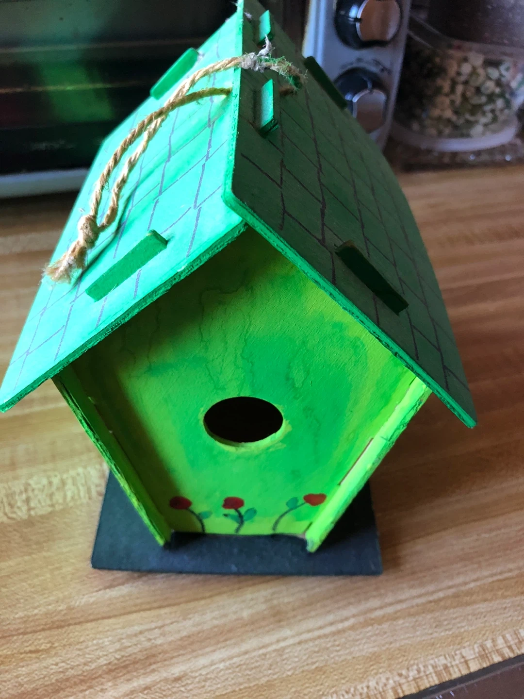 This is a handmade wooden birdhouse. It's painted green and decorated with small flowers and window outlines. It has a hole for birds to enter and a rope for hanging.