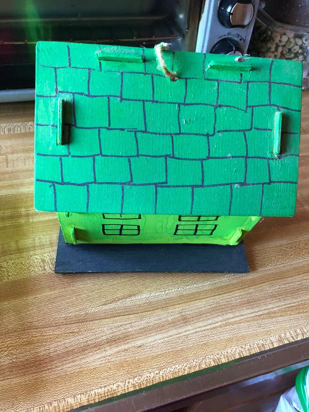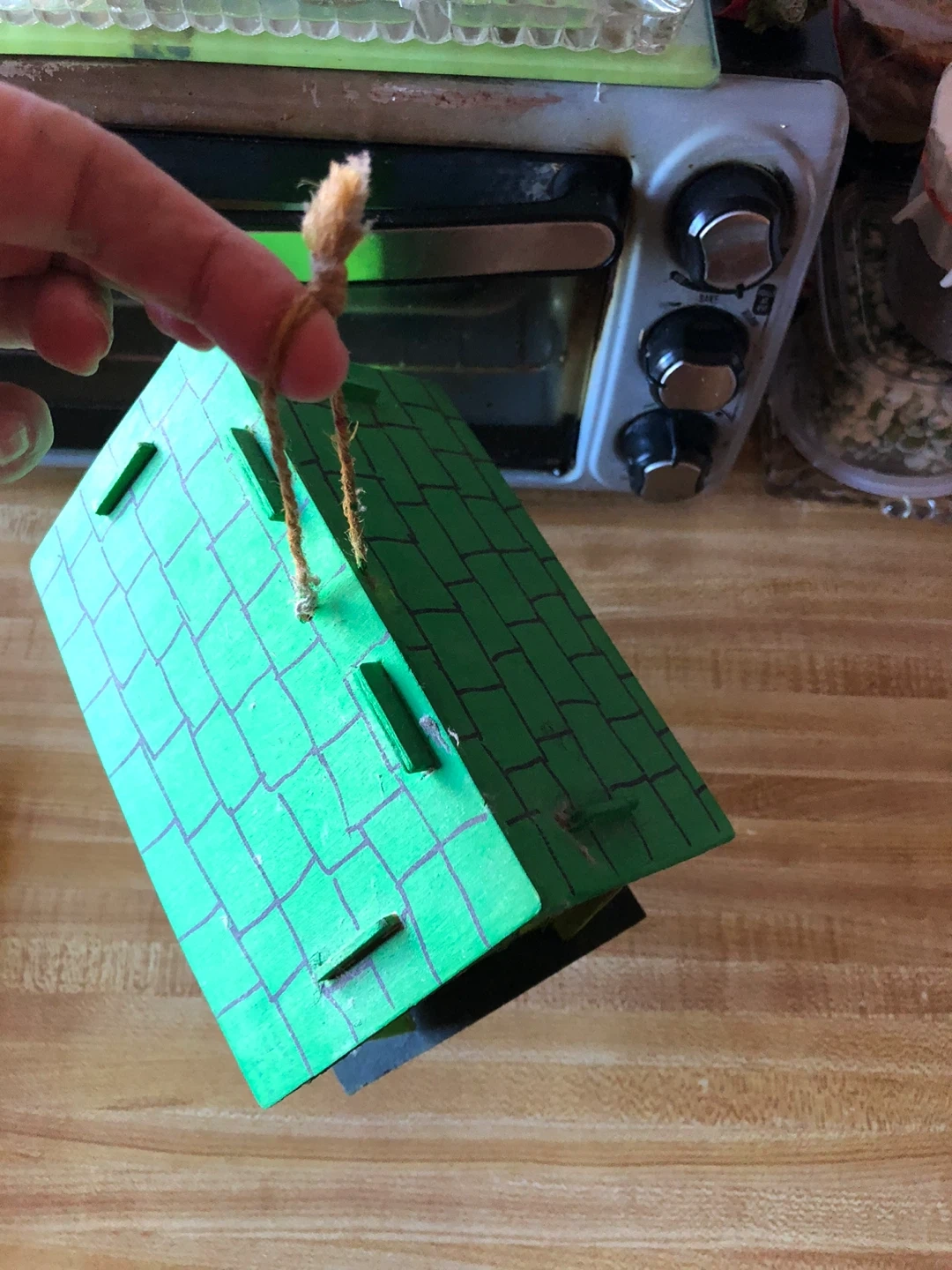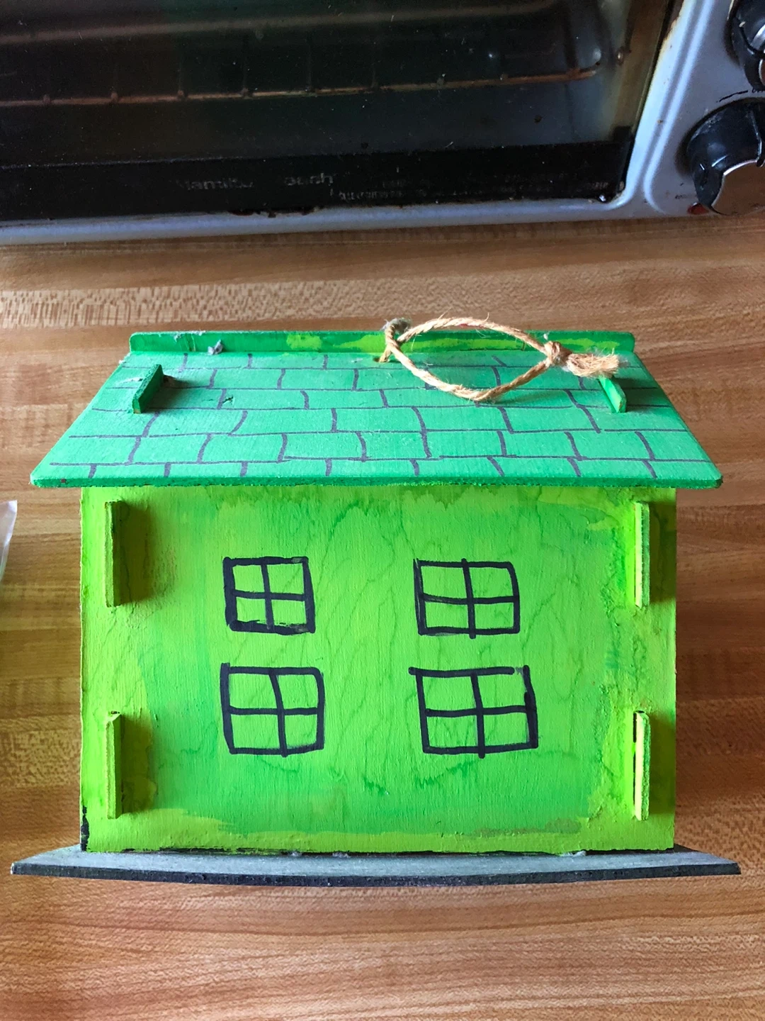 This is a handmade wooden birdhouse. It's painted green and decorated with small flowers and window outlines. It has a hole for birds to enter and a rope for hanging.