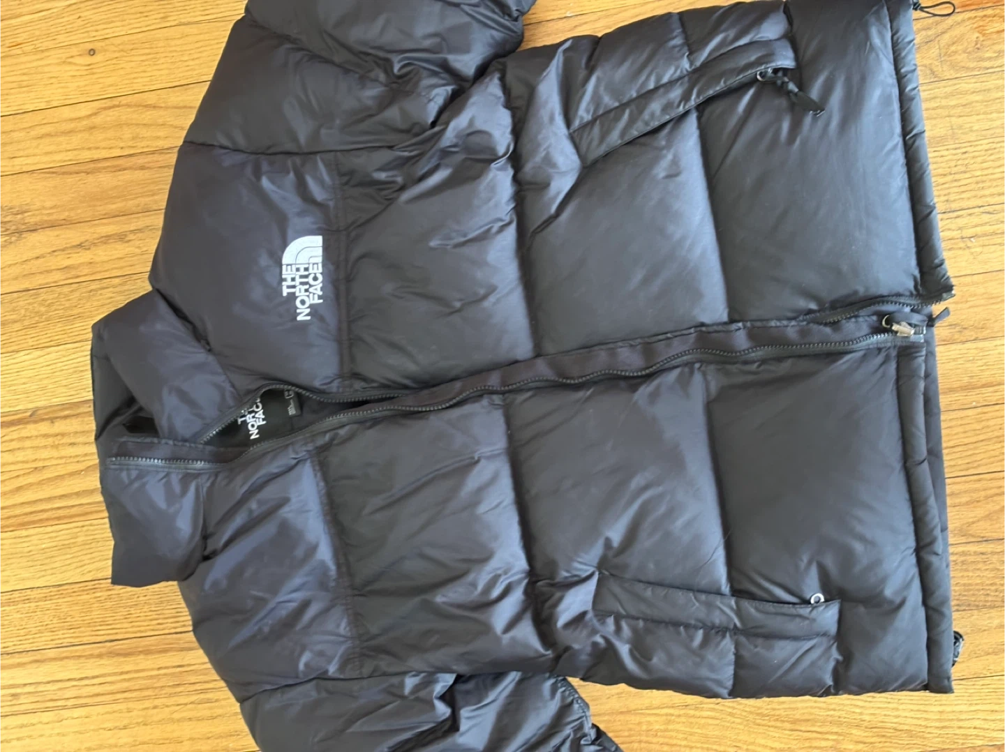 Black puffer jacket from The North Face. Full zip front with pockets. It's a warm and durable outerwear option.