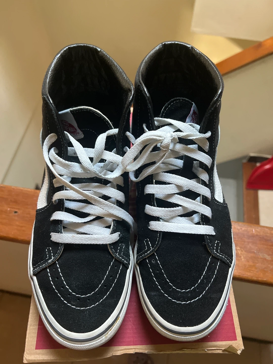 Selling a pair of Vans Sk8-Hi sneakers in black and white! They are a men's size 8 (US). The original box is included!