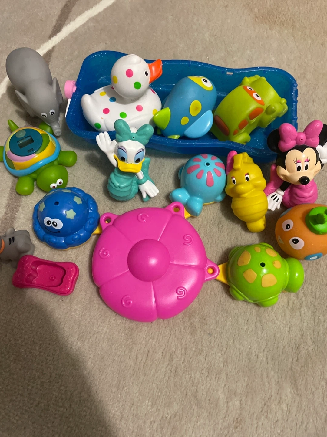 A collection of fun bath toys for little ones. Includes ducks, sea creatures, and character figures. Great for making bath time more enjoyable!