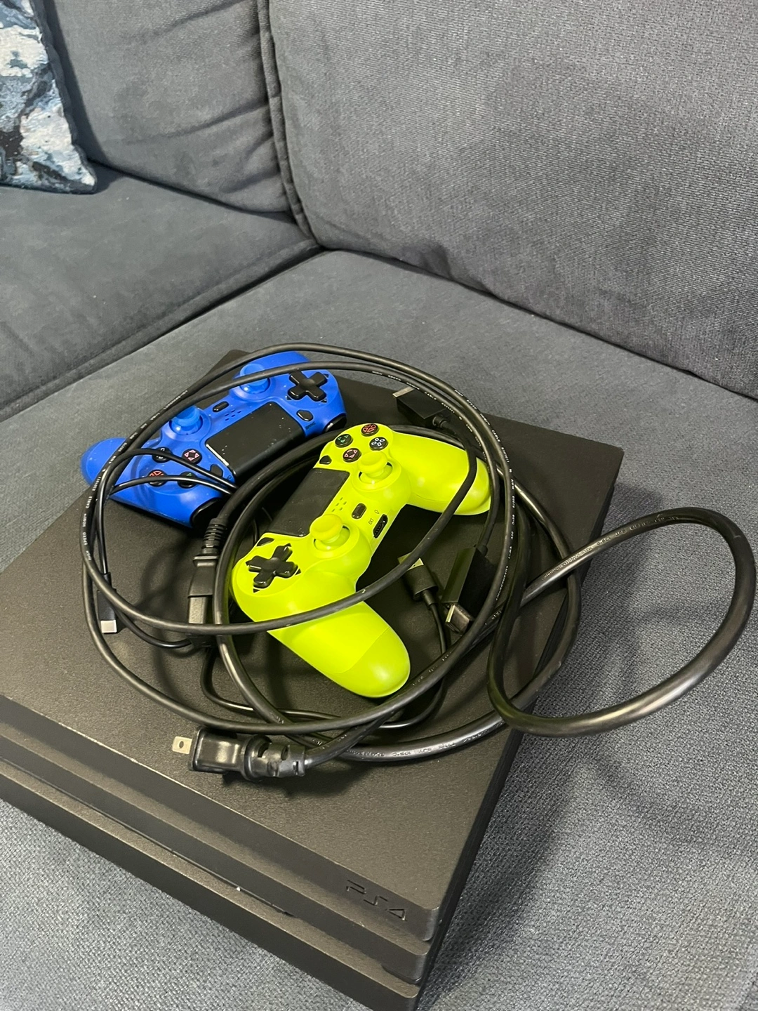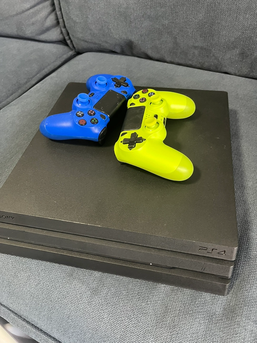 10Selling a PlayStation 4 console with 3 controllers! One controller is blue and the other is a vibrant yellow-green and the third one is black usual don’t have on the picture. Perfect for gaming with friends or family