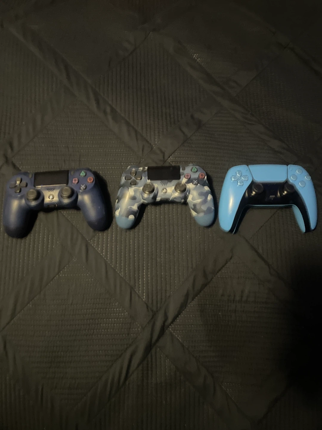 10Selling a few PlayStation controllers! There's a blue PS5 controller and two PS4 controllers, one blue and one blue camo. All in great condition!