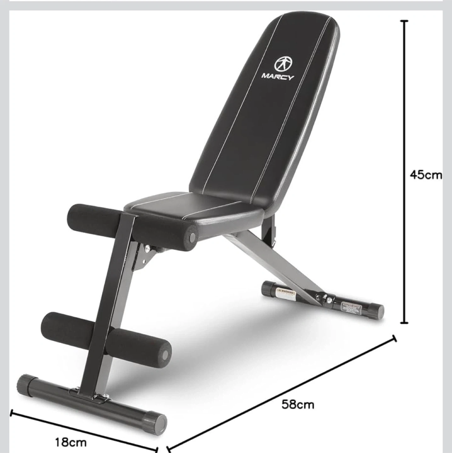 This Marcy weight bench offers a space-saving design that folds for easy storage. It features a 6-position adjustable backrest and 2-inch high-density foam padding. Rated at over 750 lbs according to ASTM standards.
