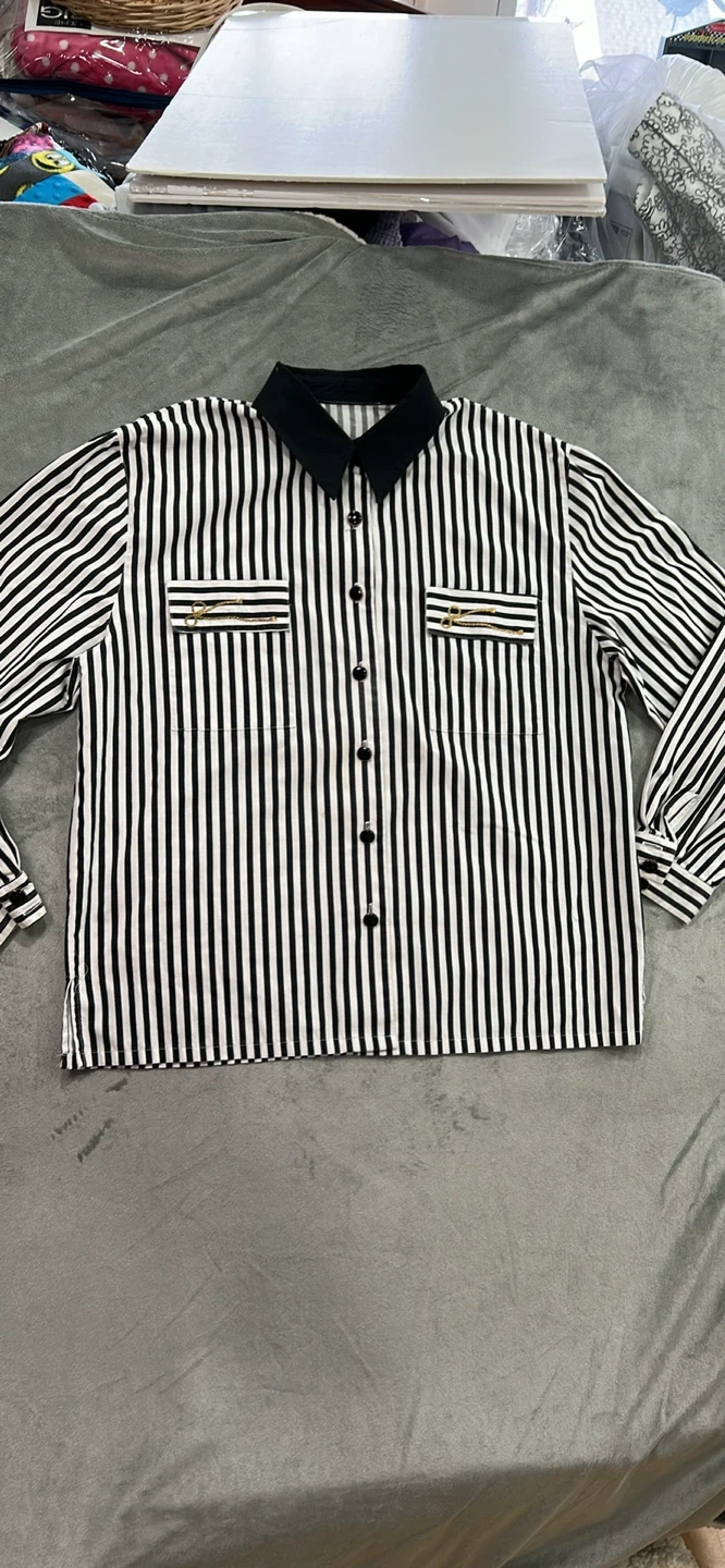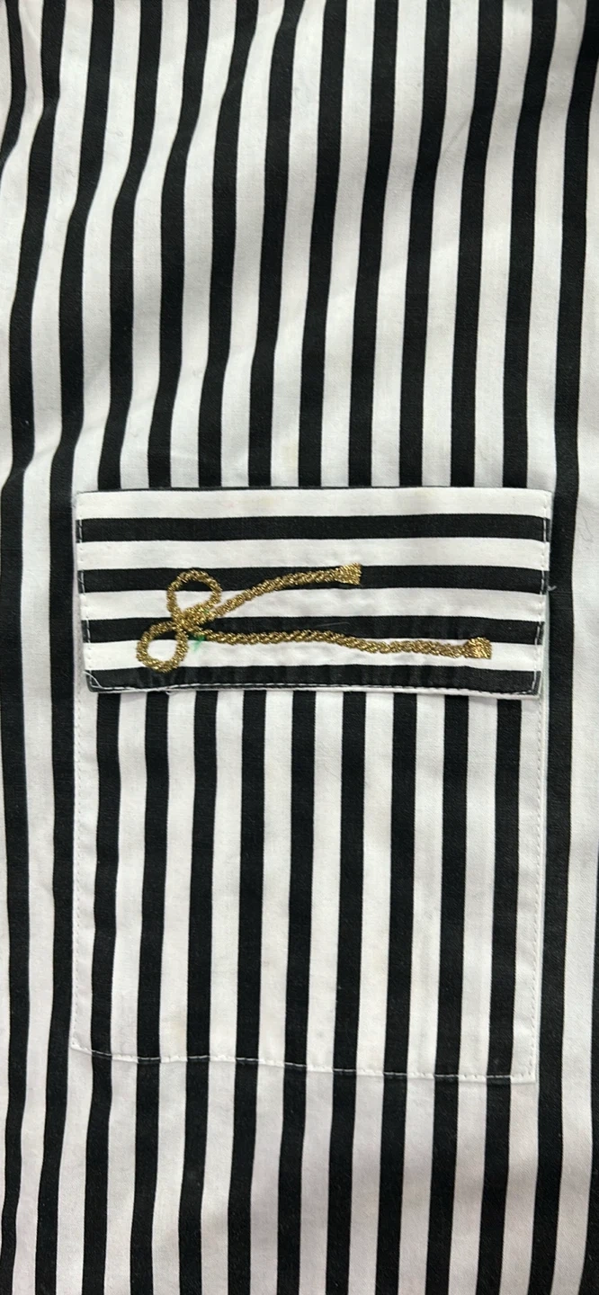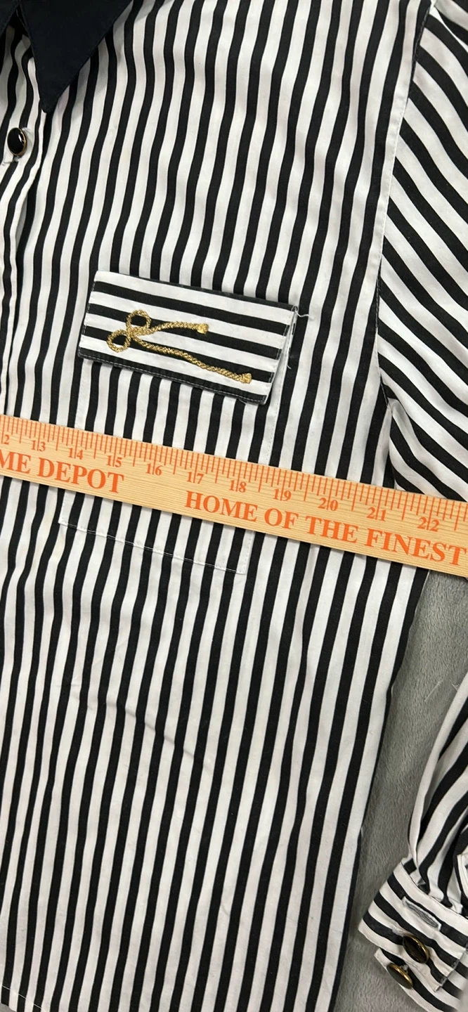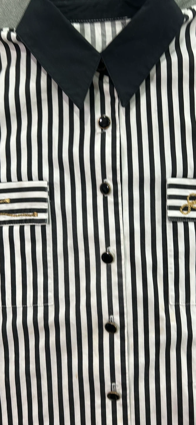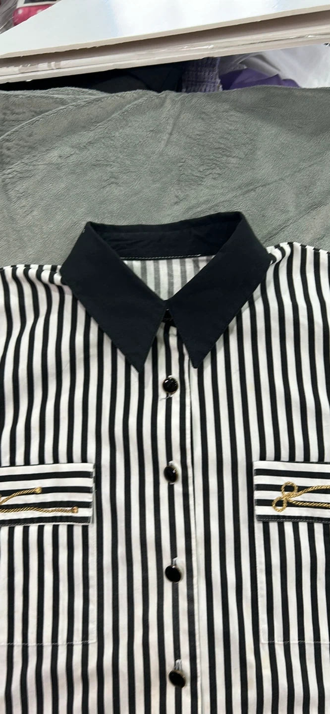 This collared shirt features a classic black and white stripe pattern. It has gold decorative accents on the chest pockets and button-up front. It's a long-sleeved blouse.