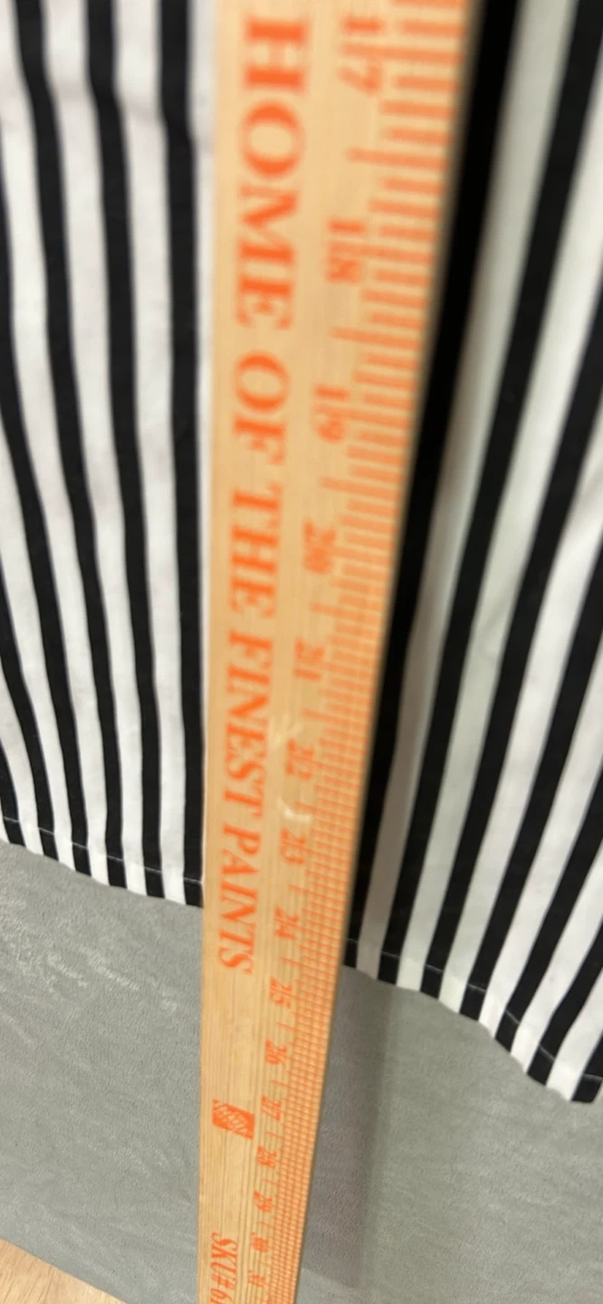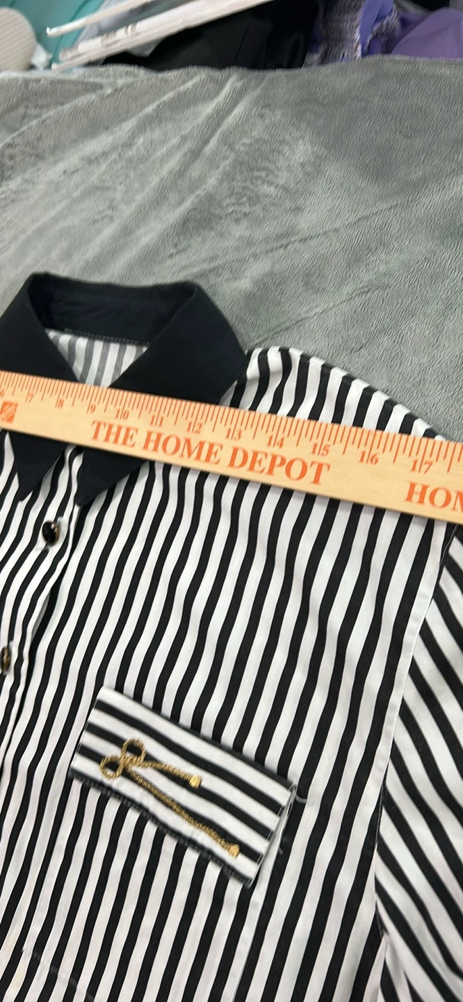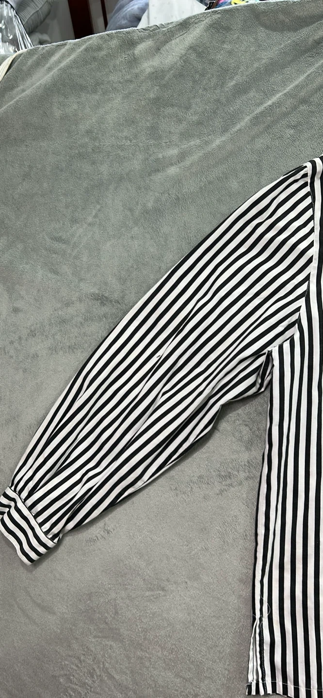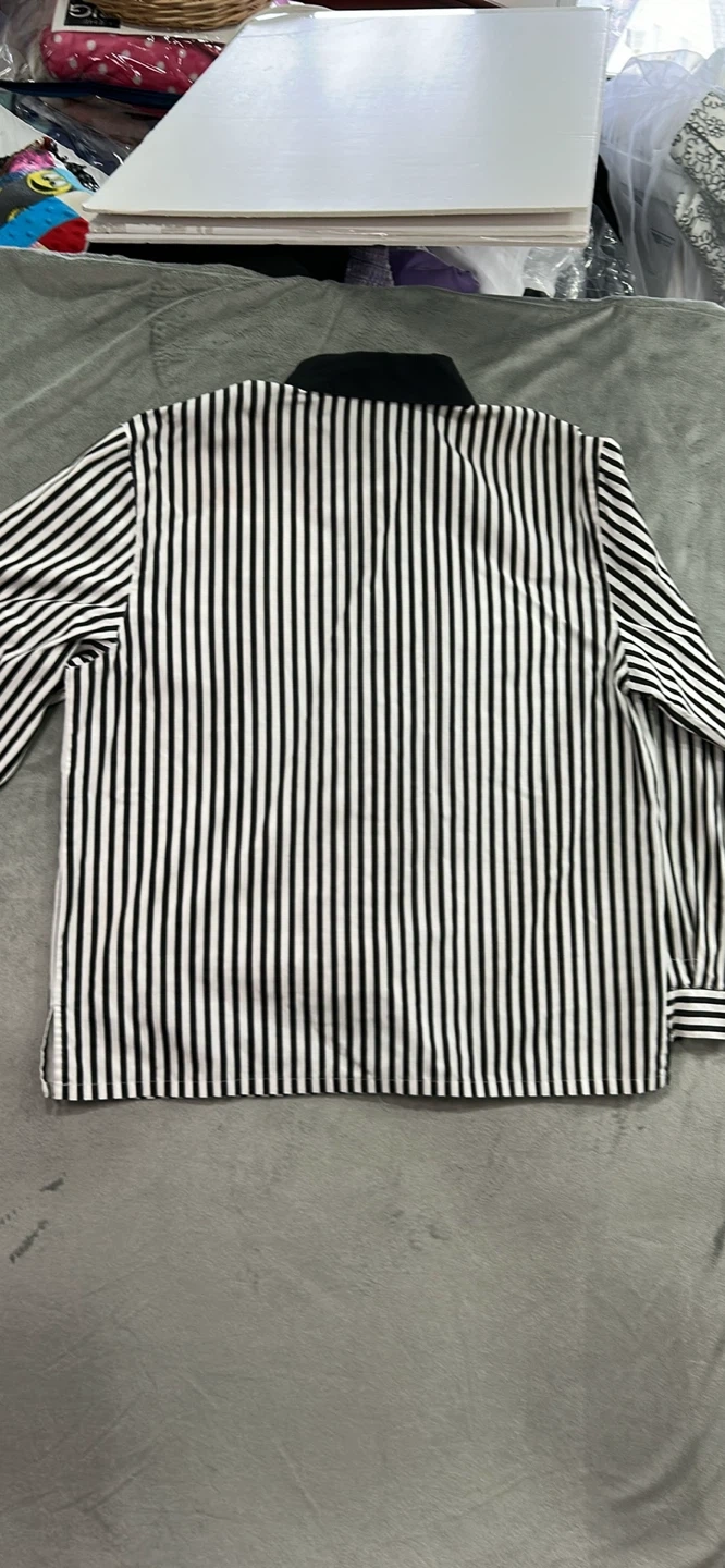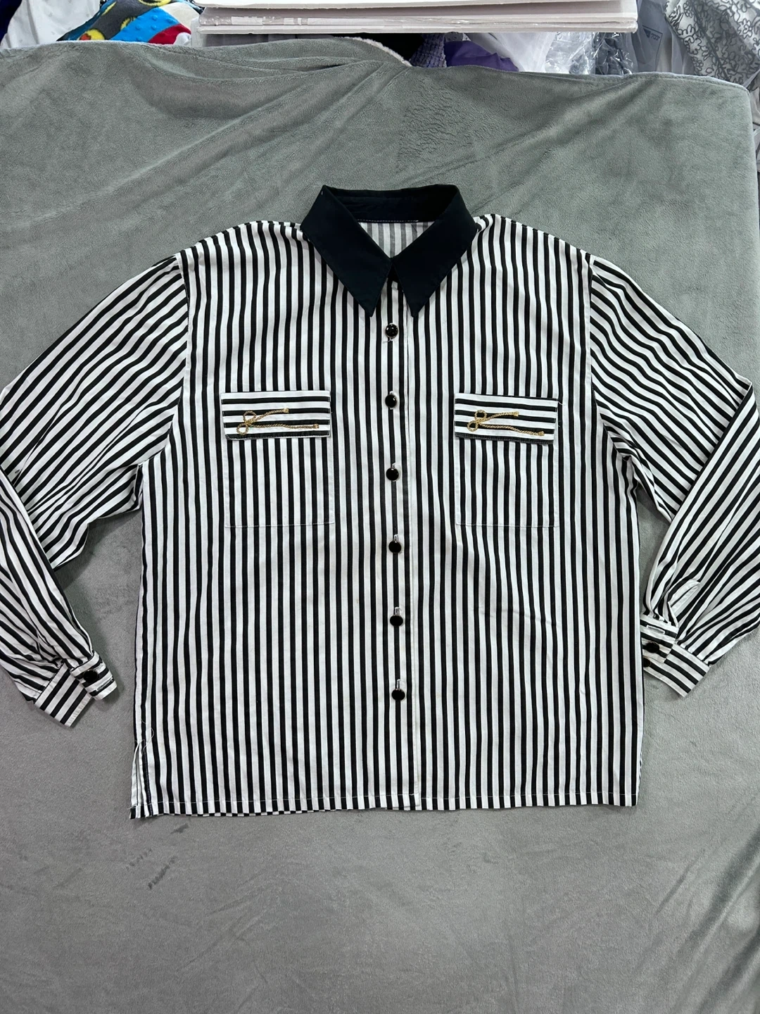This collared shirt features a classic black and white stripe pattern. It has gold decorative accents on the chest pockets and button-up front. It's a long-sleeved blouse.