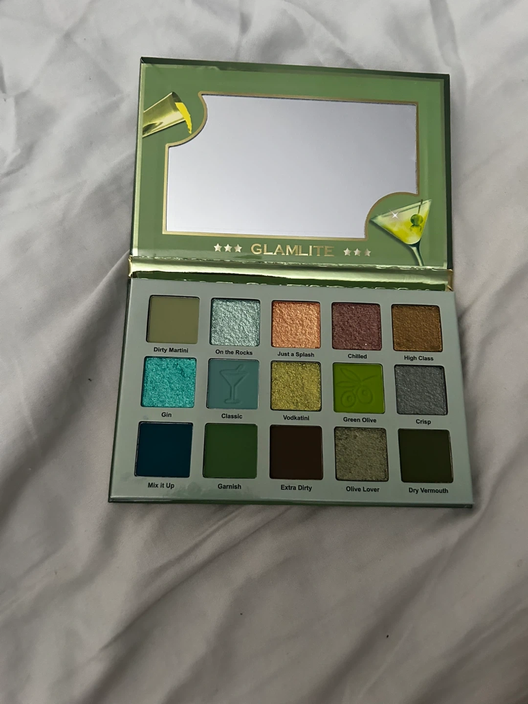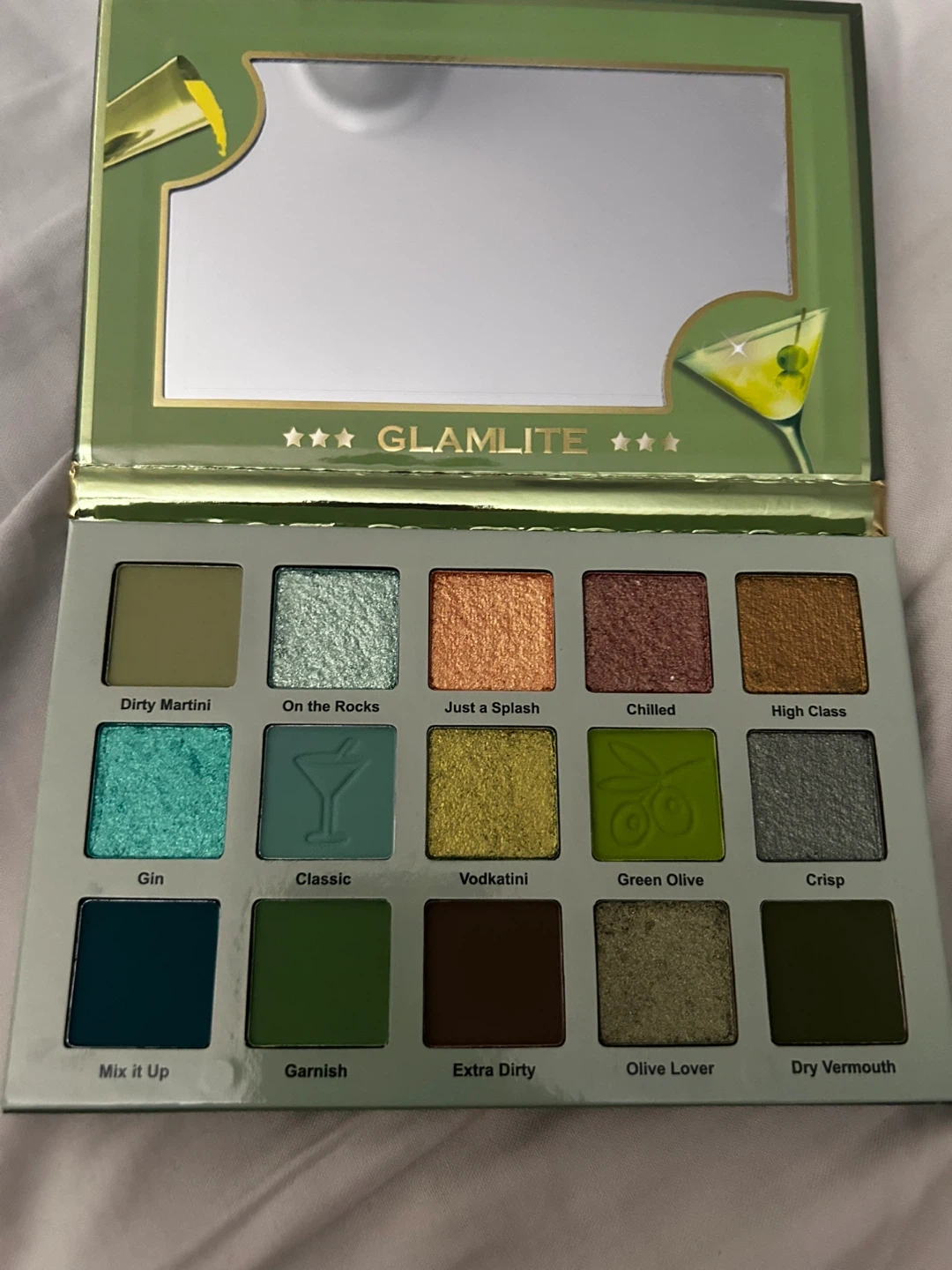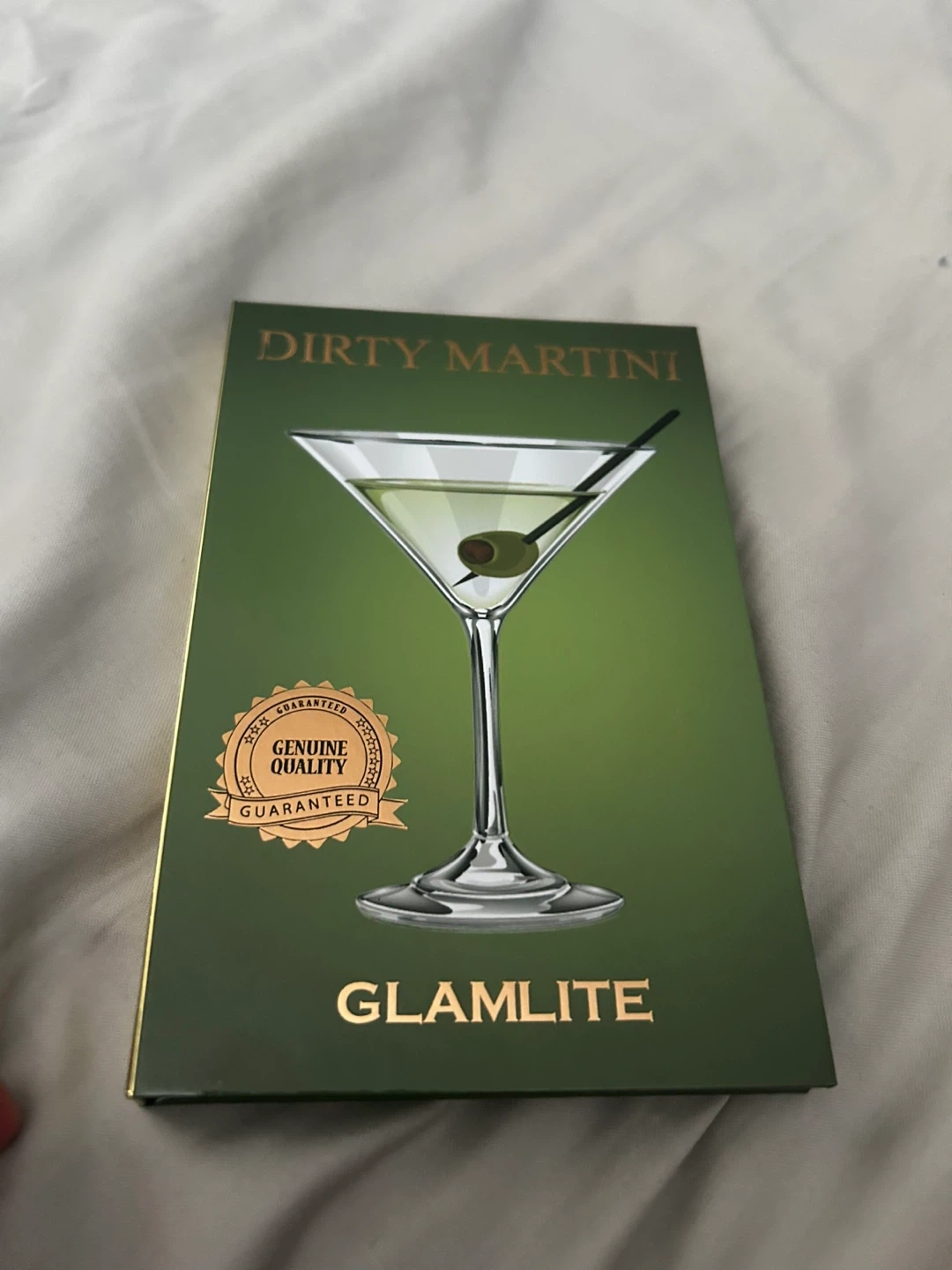 This is the Glamlite Dirty Martini eyeshadow palette. It features 16 shades with a mix of matte and shimmer finishes. The palette has a built-in mirror and a compact, portable design.