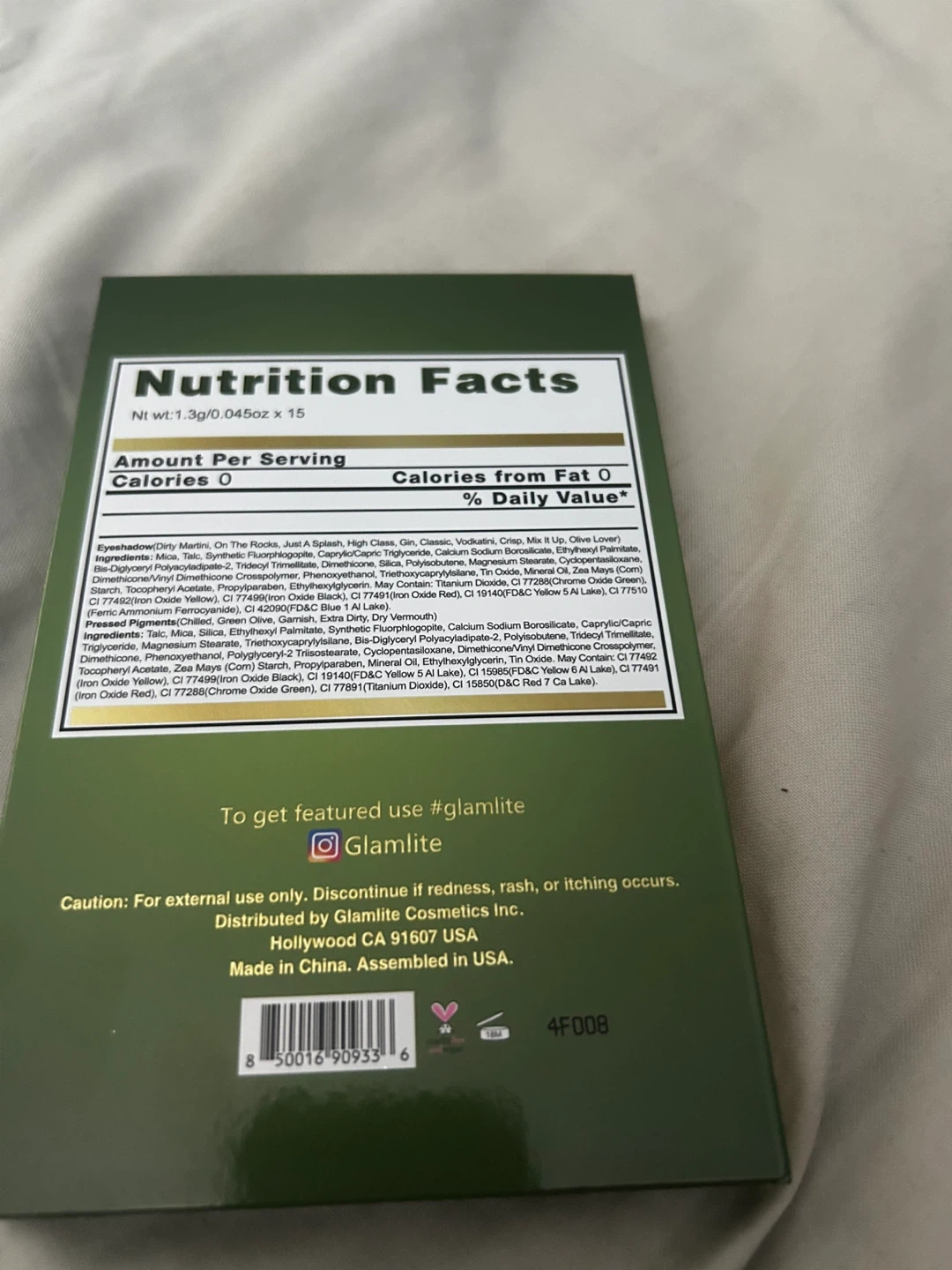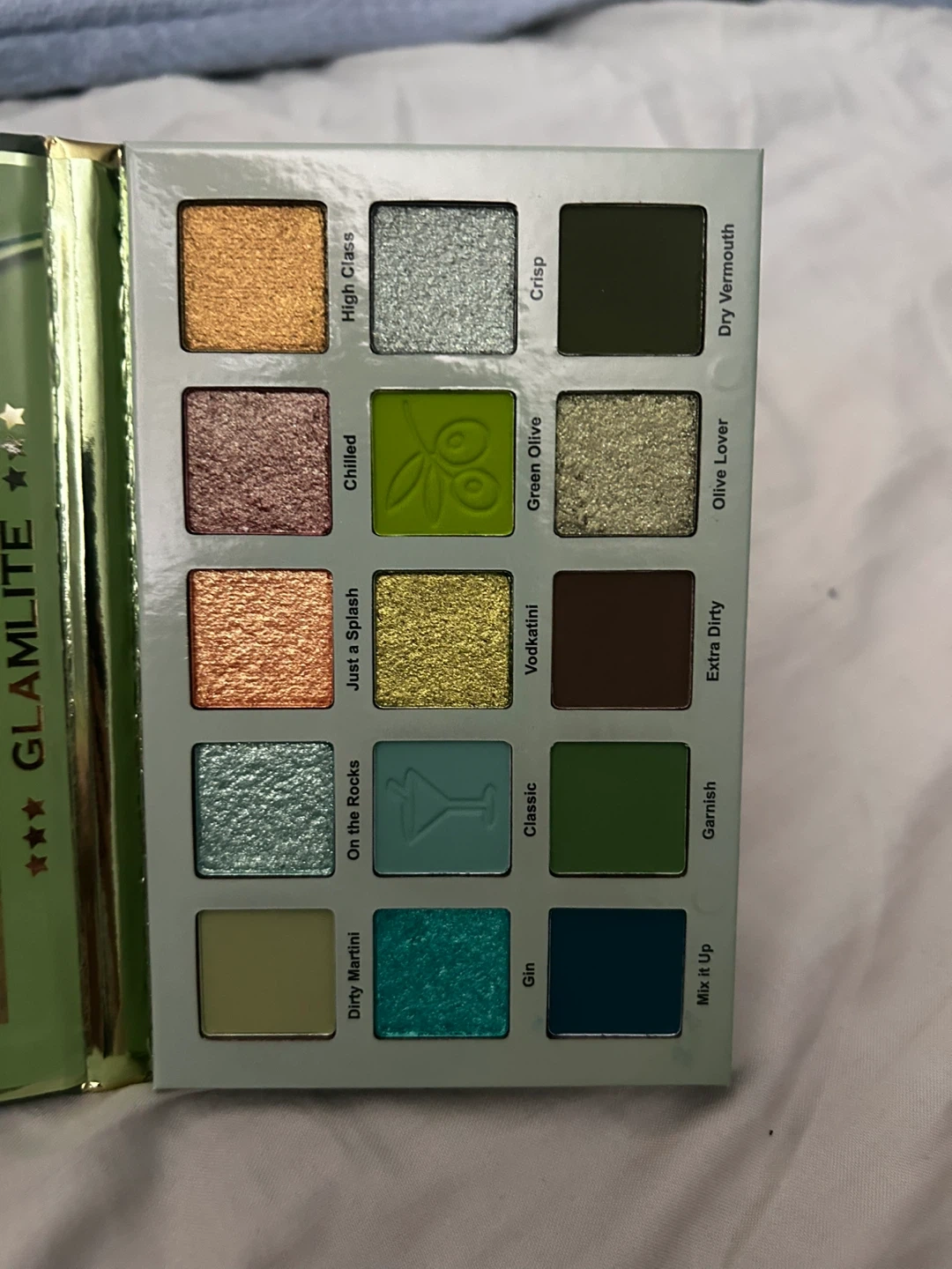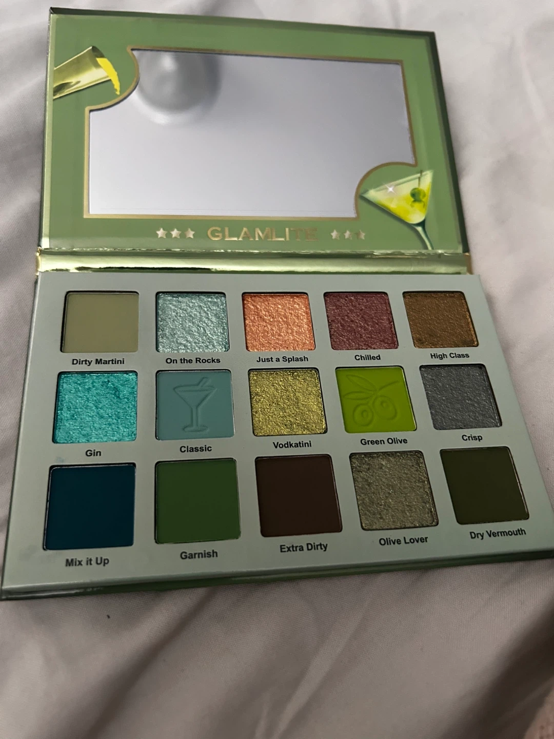 This is the Glamlite Dirty Martini eyeshadow palette. It features 16 shades with a mix of matte and shimmer finishes. The palette has a built-in mirror and a compact, portable design.