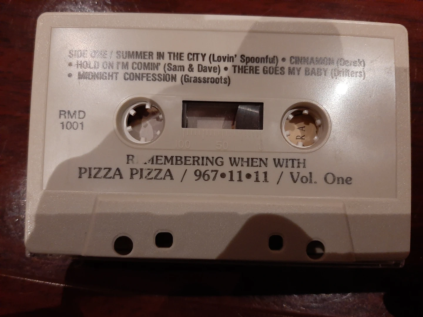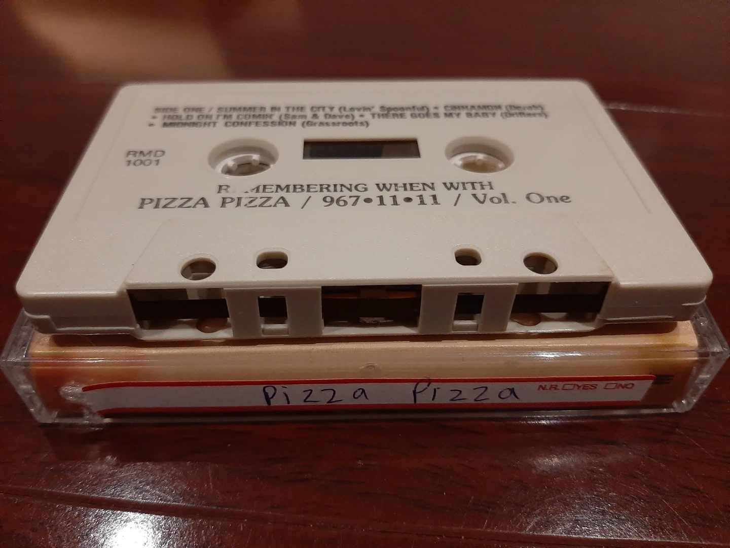 This is a cassette tape titled "Remembering When With Pizza Pizza / 967-11-11 / Vol. One".