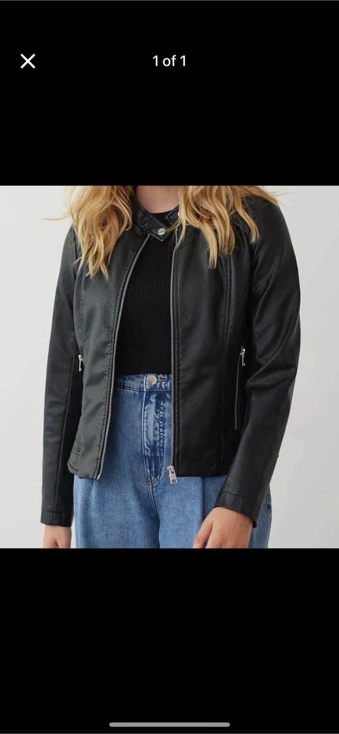 Here's a stylish black faux leather jacket! It's a sleek and versatile piece that can be dressed up or down. Perfect for adding a bit of edge to any outfit!