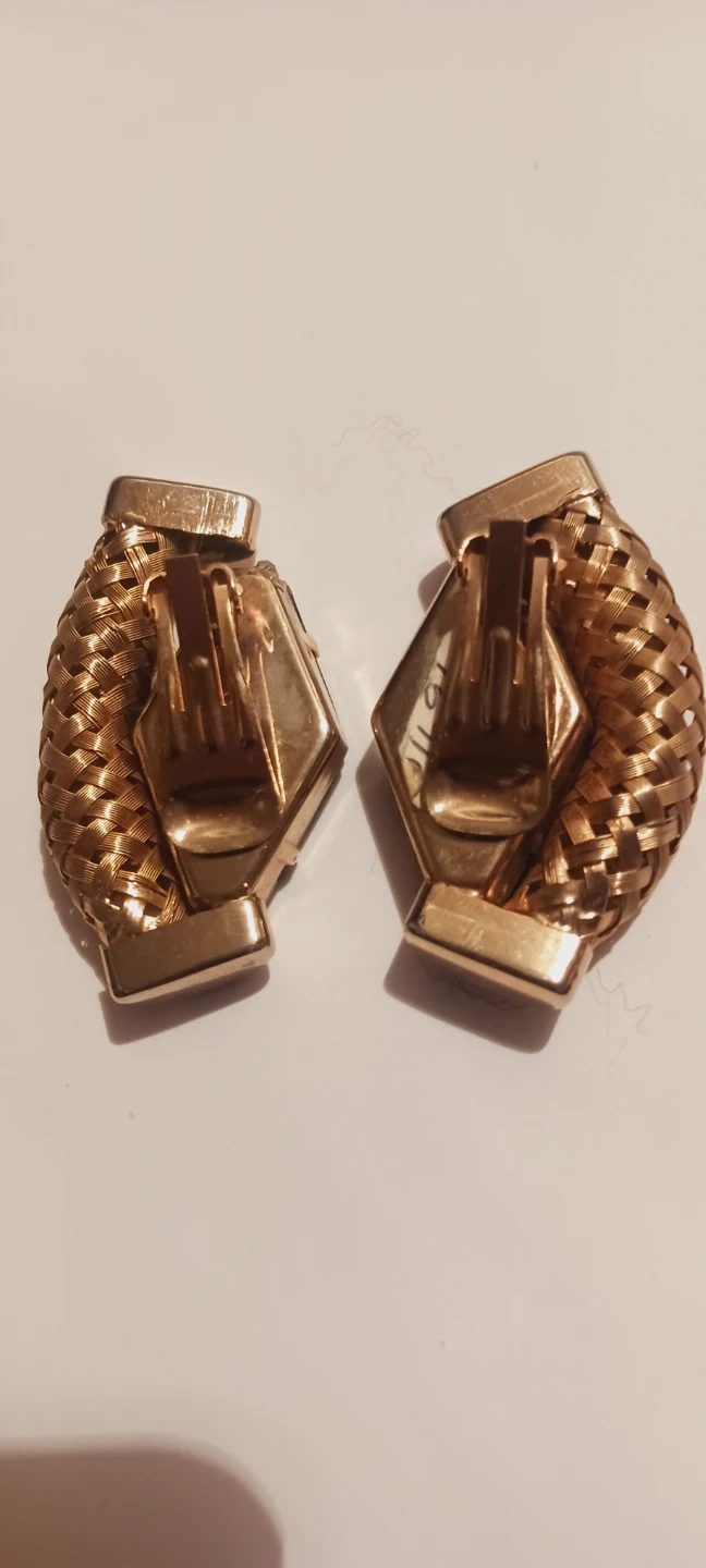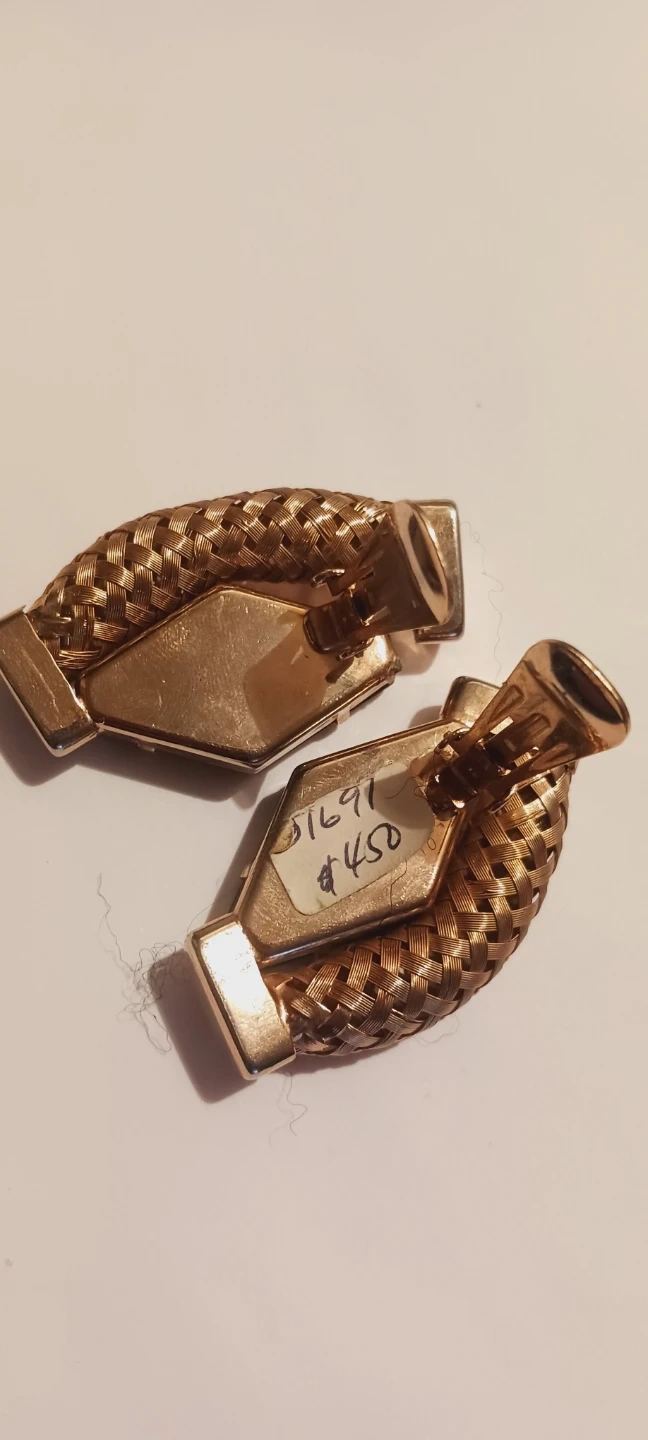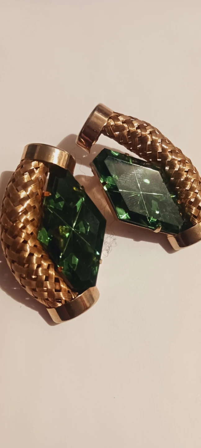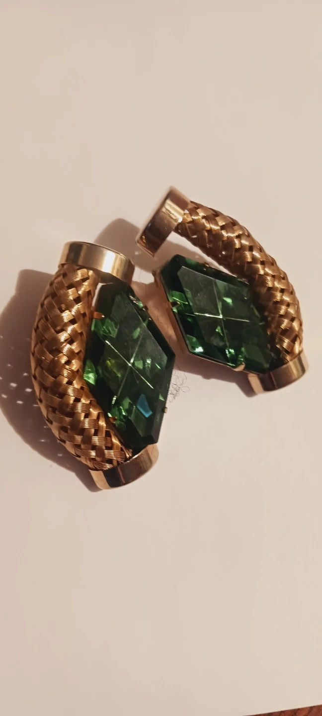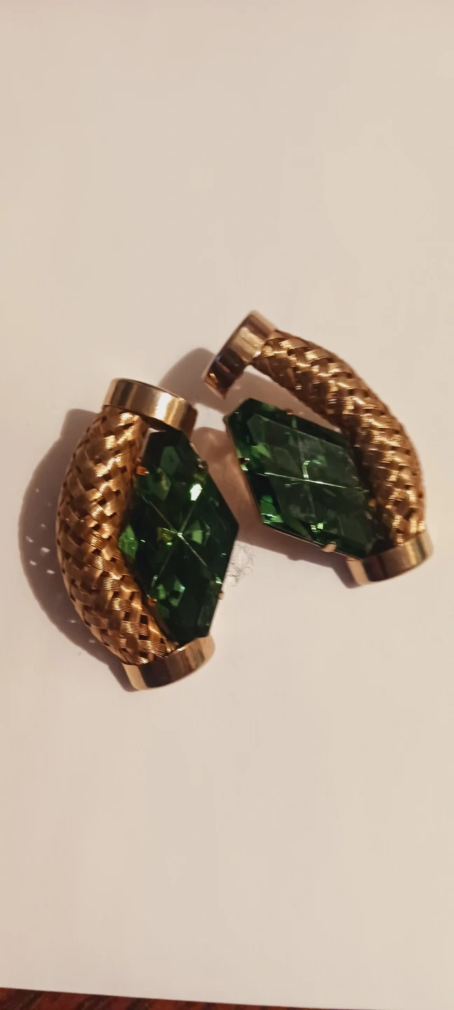 Gorgeous Rare Vintage Glamorous gold-tone clip on earrings featuring woven design with large, faceted green cabochons gemstones. They're perfect for adding a touch of vintage glamour to any outfit! 2"×1.5". Excellent condition. ALL MY PRICES ARE NEGOTIABLE
