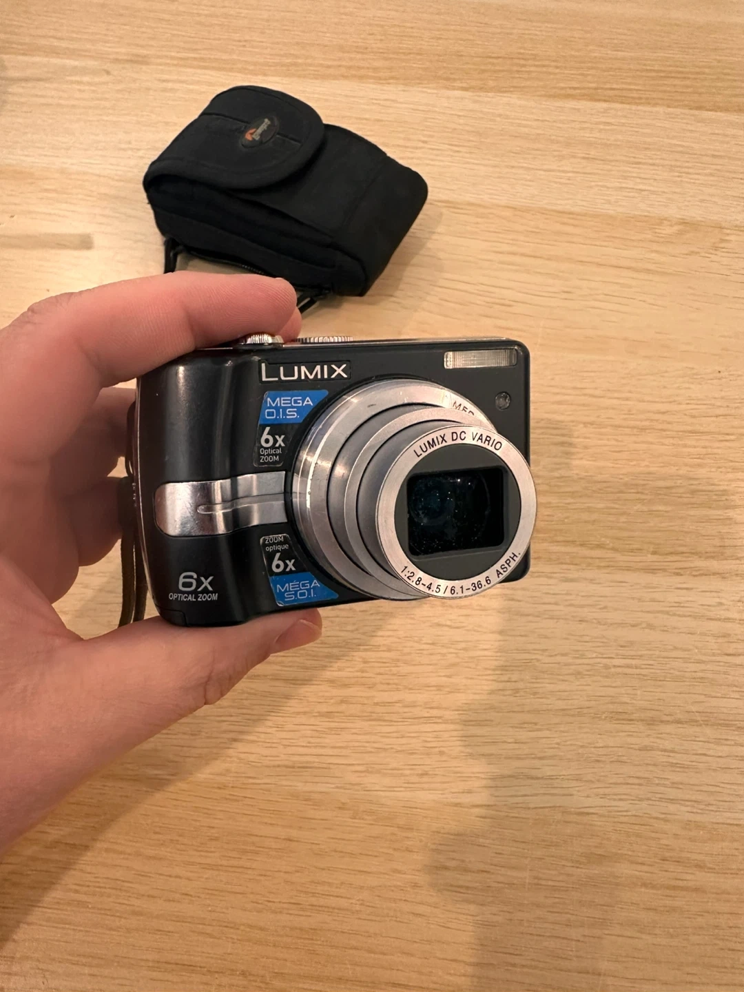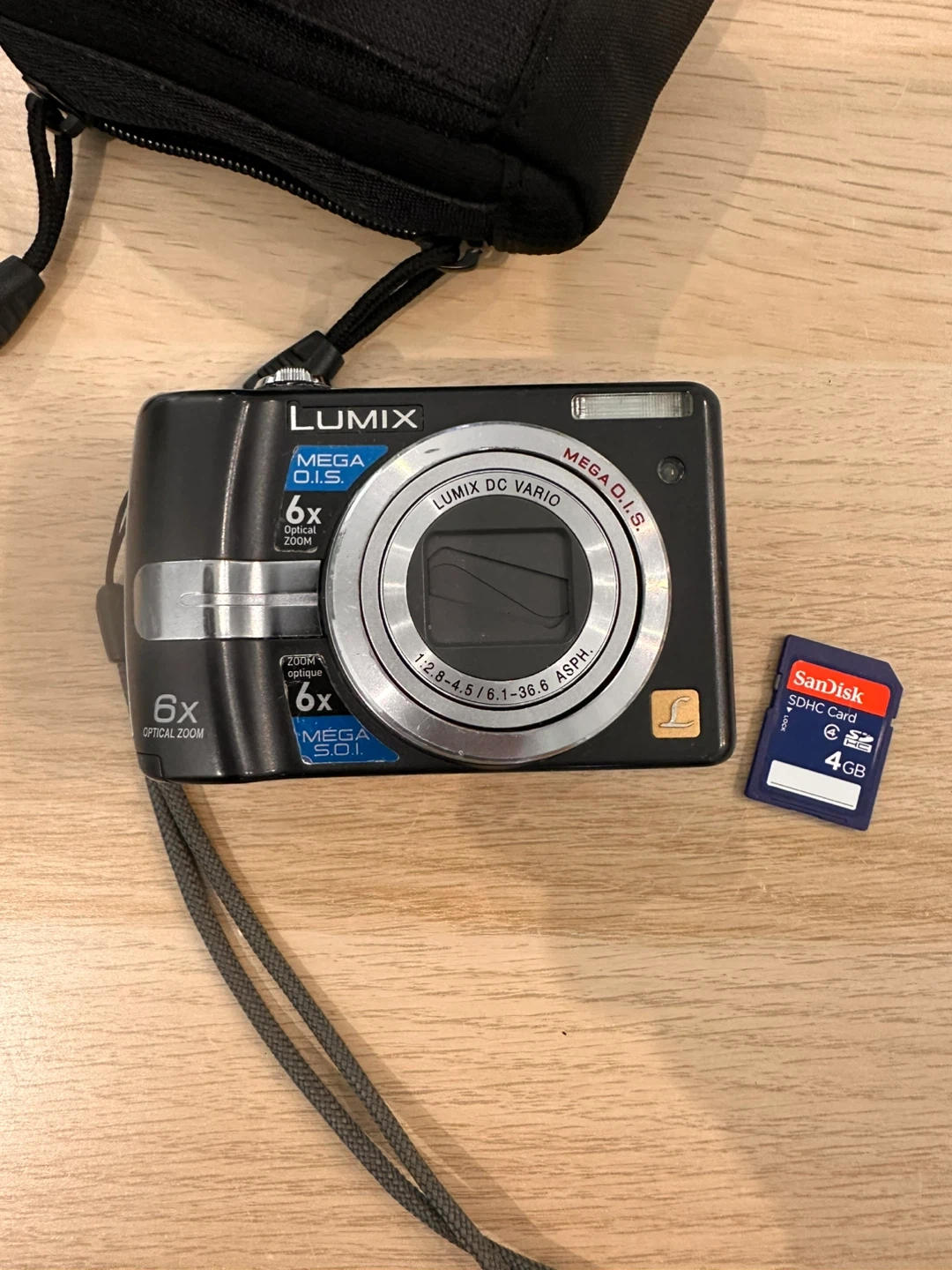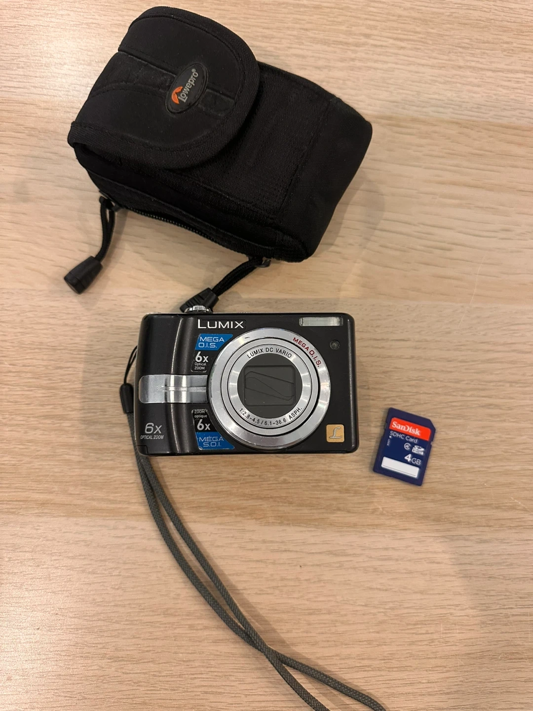 Panasonic Lumix DMC-FS10 digital camera with 6x optical zoom. Includes a LowePro camera case and a SanDisk 4GB SD card. This compact camera is perfect for everyday photos.