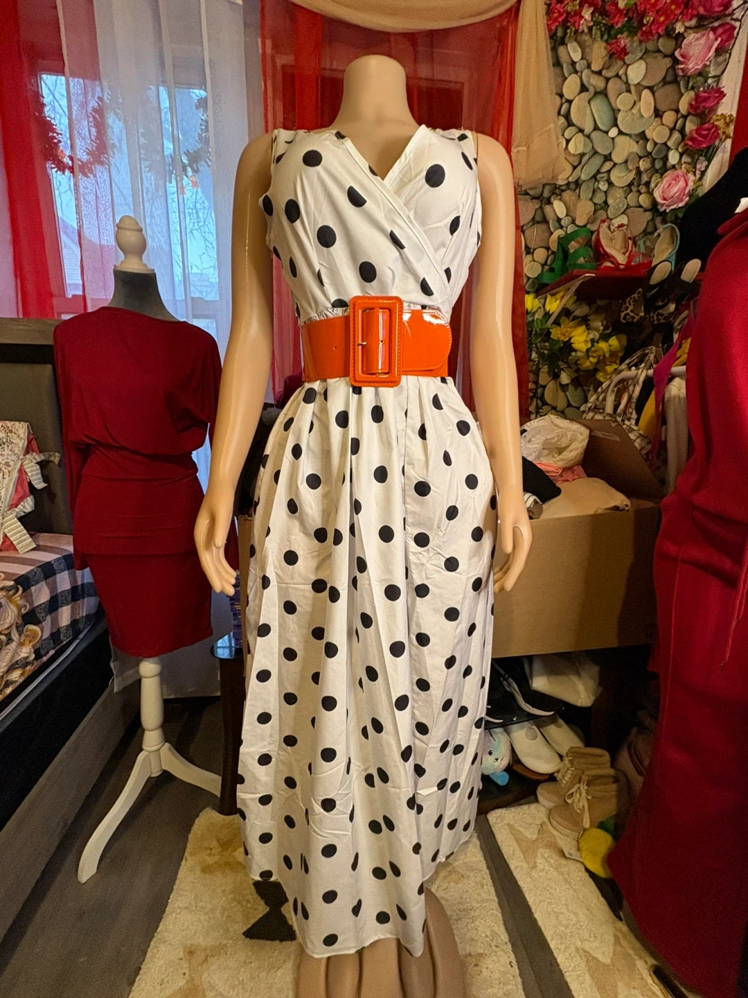 153Cute polka dot dress with a bright orange belt! It's in great condition and ready for a new home. Perfect for a fun, retro look!