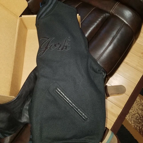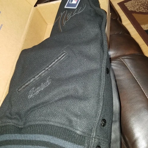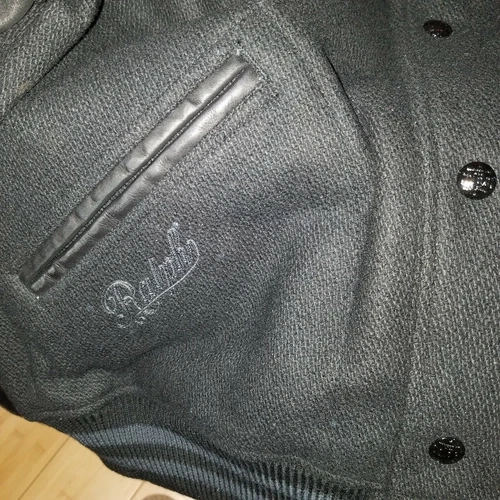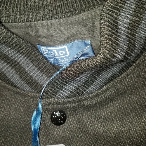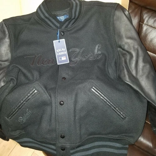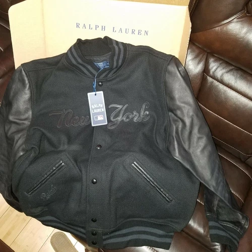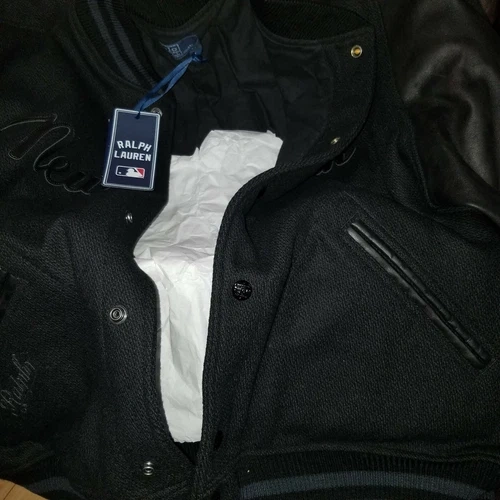 Polo Ralph Lauren NY Yankees MLB Black Ltd Ed Leather Bomber Jacket NWT MEN SZ L Size medium has a 26½” front body length, a 26¼” back body length, a 19" shoulder, a 45” chest, and a 35½” sleeve length. Sleeve length changes 1” between sizes. Striped ribbed baseball collar. Snapped placket. Long leather sleeves with striped ribbed cuffs. Leather New York Yankees™ logo patch at the chest. Two front waist angled pockets. “Ralph” script embroidered at the right pocket. Interior left chest pocket. Leather patches spelling out “Ralph Lauren” and a leather New York Yankees™ logo patch at the center back. Striped ribbed hem. Fully lined. Shell: wool, polyester. Sleeves: leather. Ribbed trim: acrylic, wool. Body lining: cotton. Sleeve lining: polyester. Dry clean by a leather specialist. Imported. Due to the natural characteristics of this material, the coloring may rub off onto fabrics and upholstery.