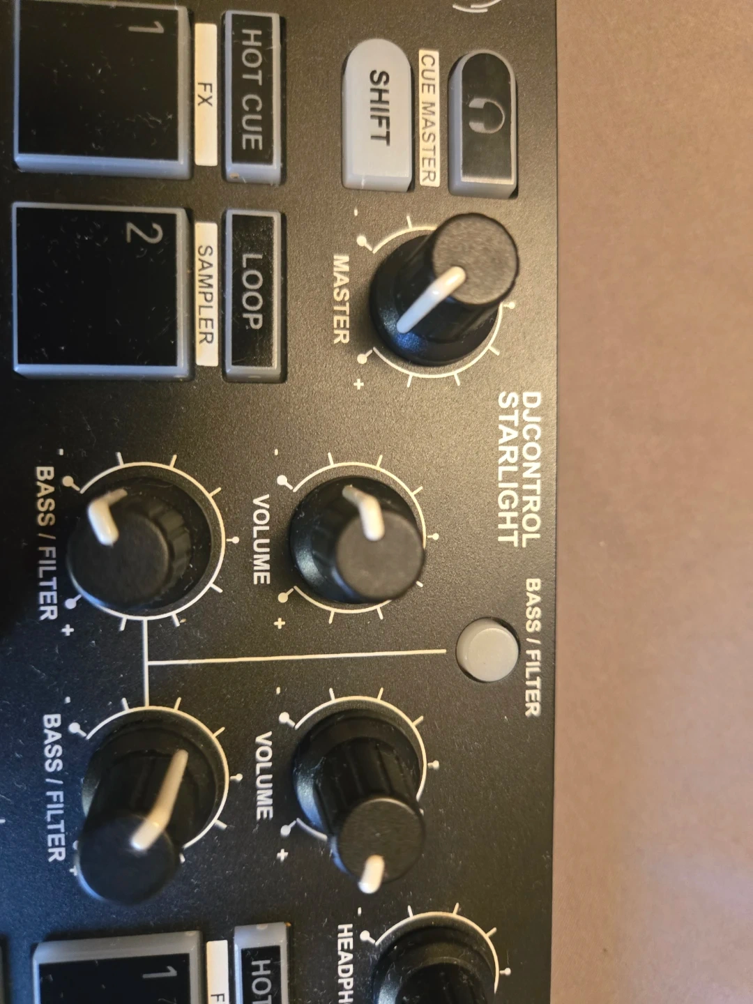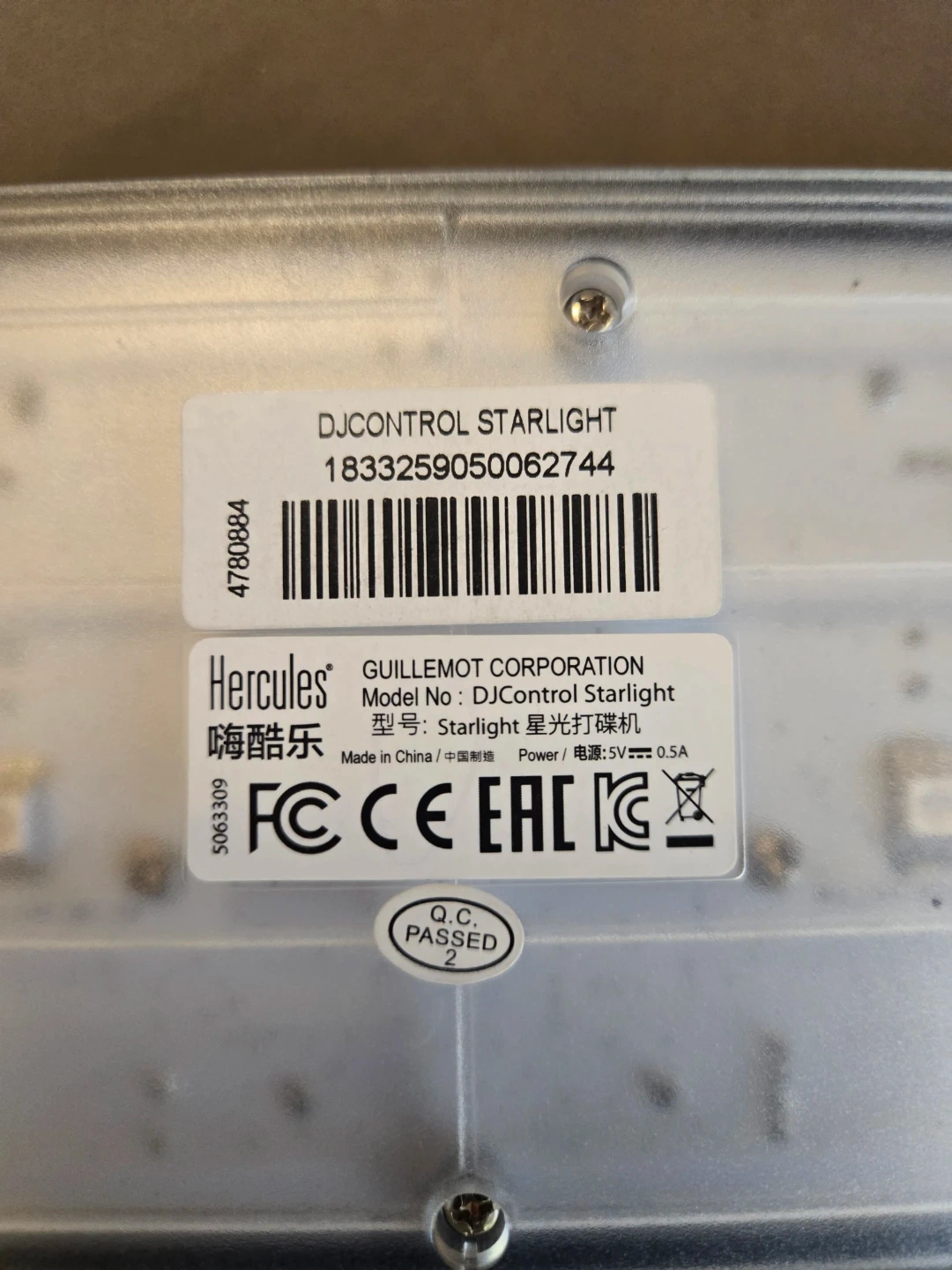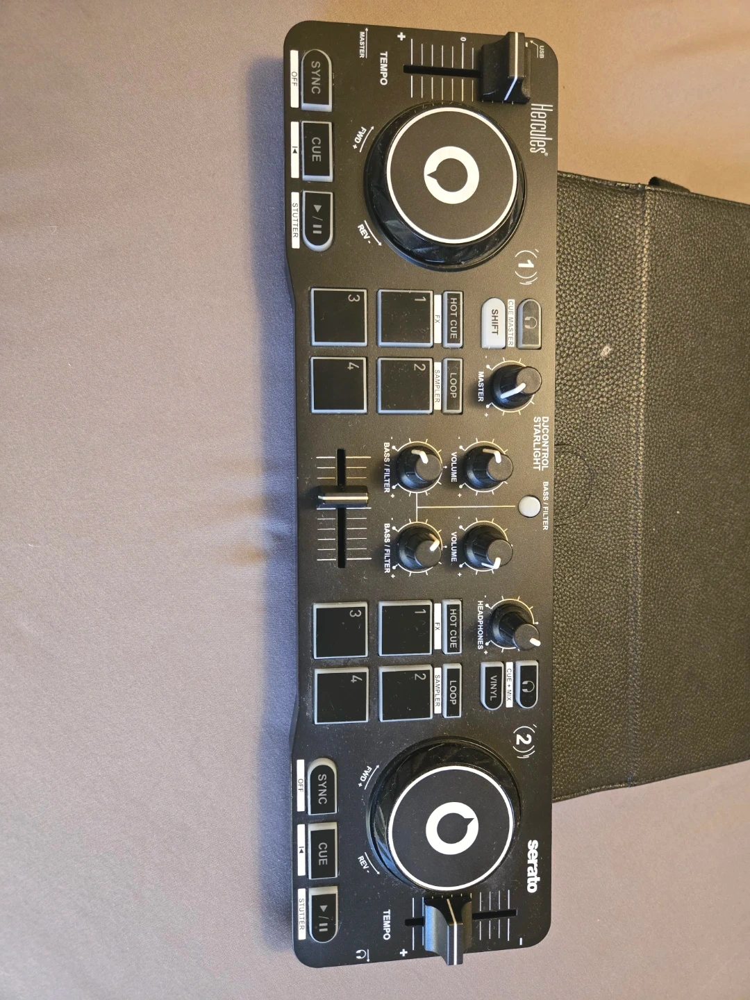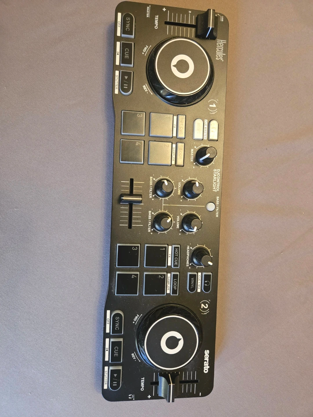 Hercules DJControl Starlight DJ controller. Comes with Serato DJ Lite. Built-in audio interface and headphones output. Crossfader and jog wheels for mixing. Four pads per deck for cues and samples.