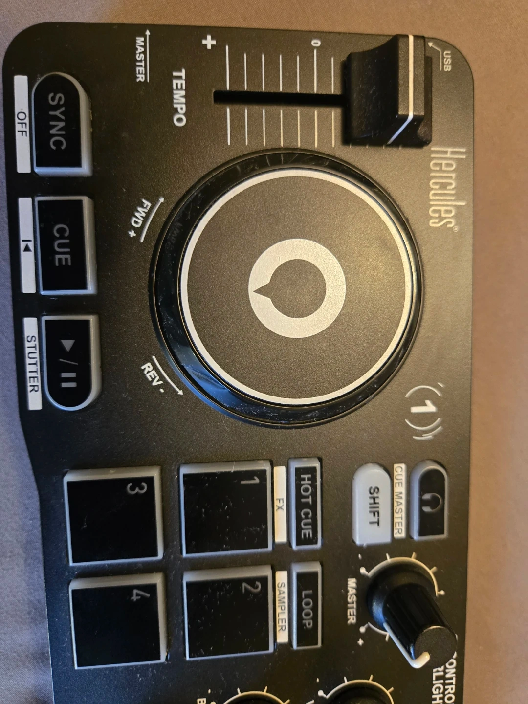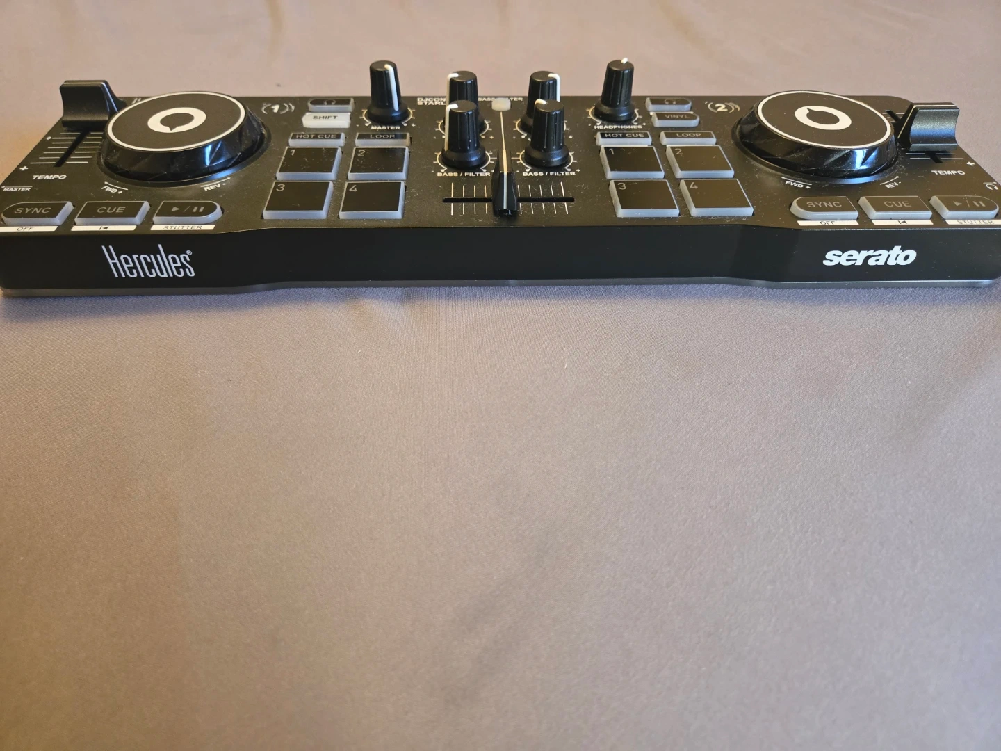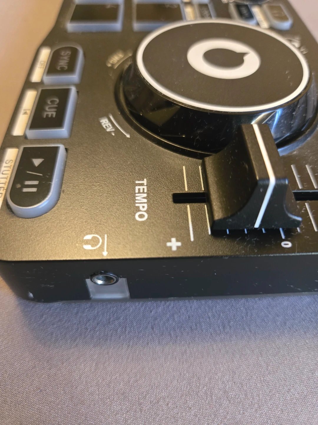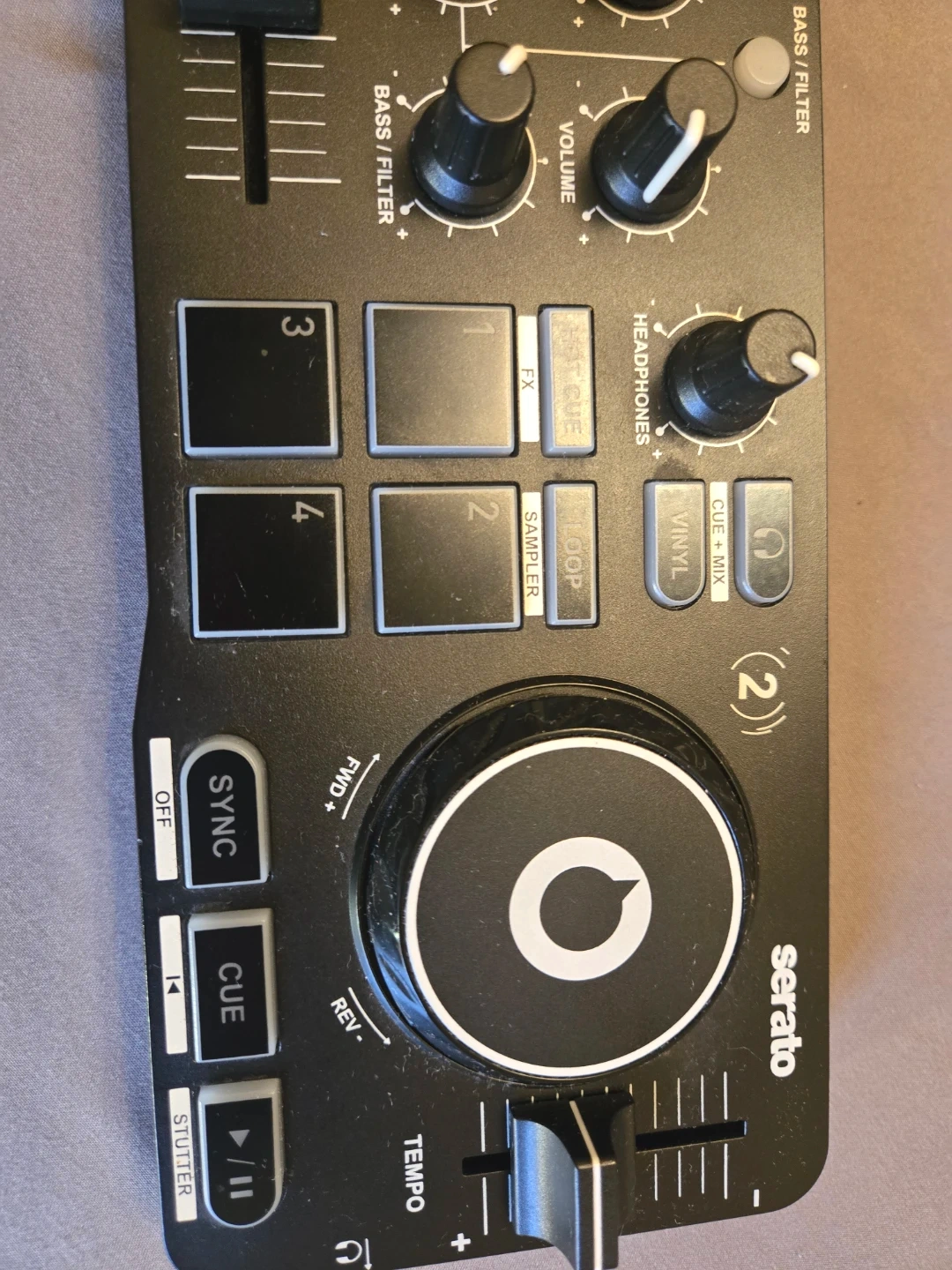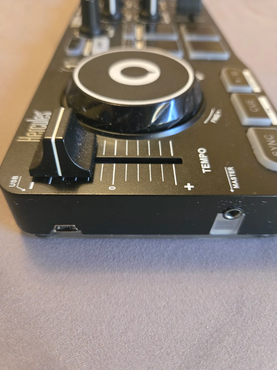 Hercules DJControl Starlight DJ controller. Comes with Serato DJ Lite. Built-in audio interface and headphones output. Crossfader and jog wheels for mixing. Four pads per deck for cues and samples.