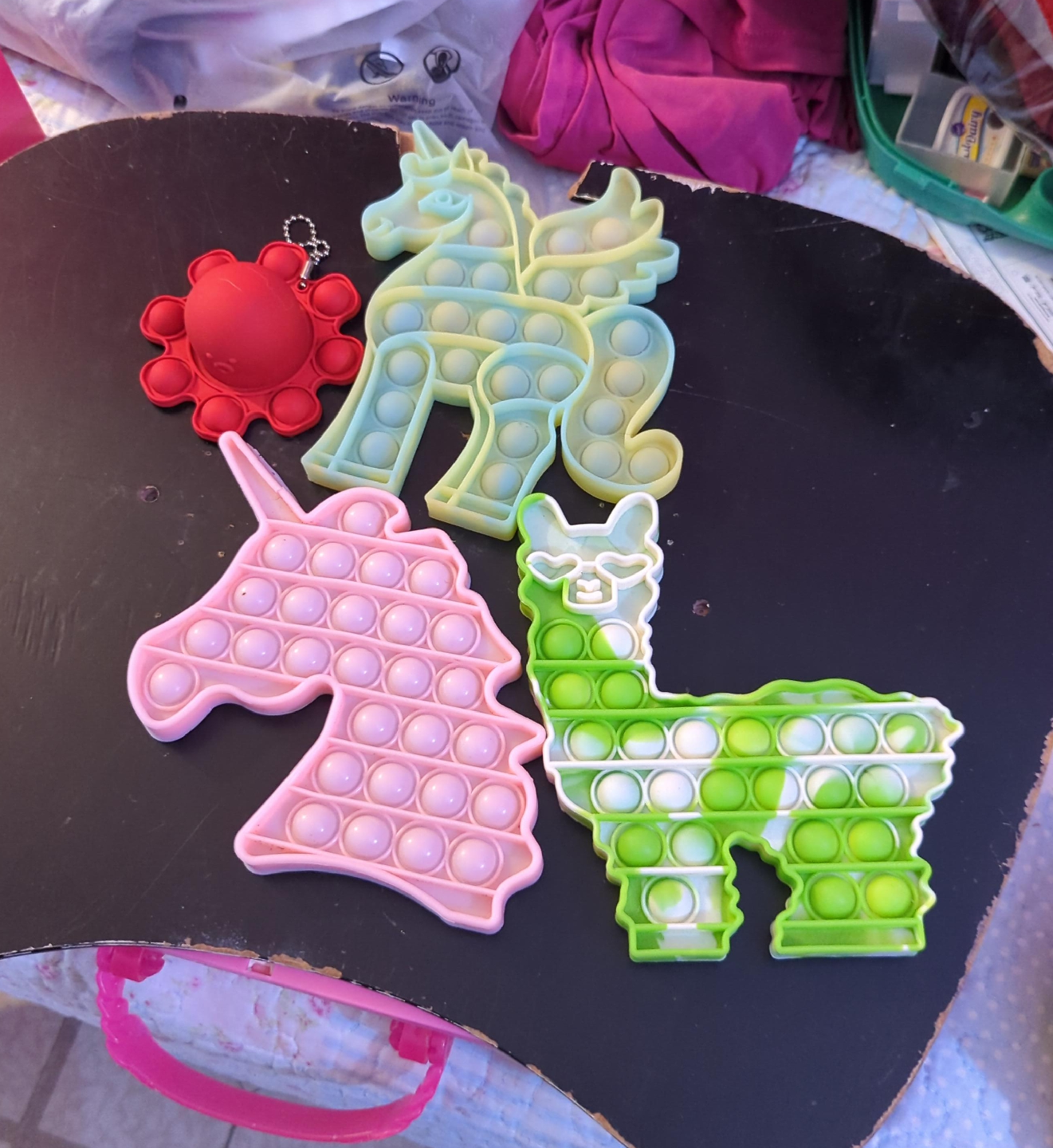 Selling a set of fun Pop It fidget toys! Included are a pink unicorn, a green llama, and a red octopus shape. These are great for stress relief and sensory play. Perfect for kids and adults alike! included 4 pieces