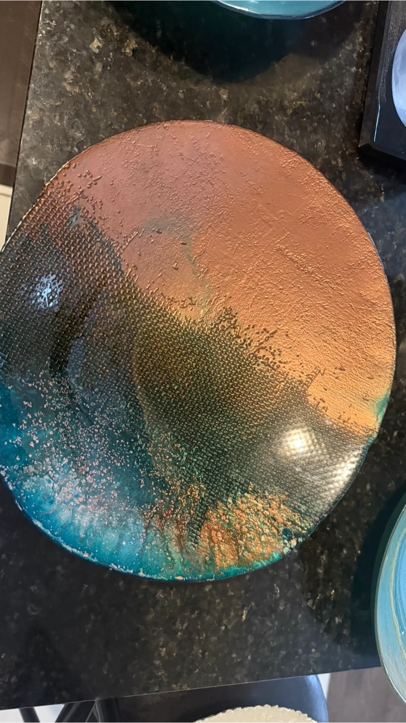 This is a decorative round plate with a textured surface and a blend of copper and blue colours. It would make a nice accent piece for any room