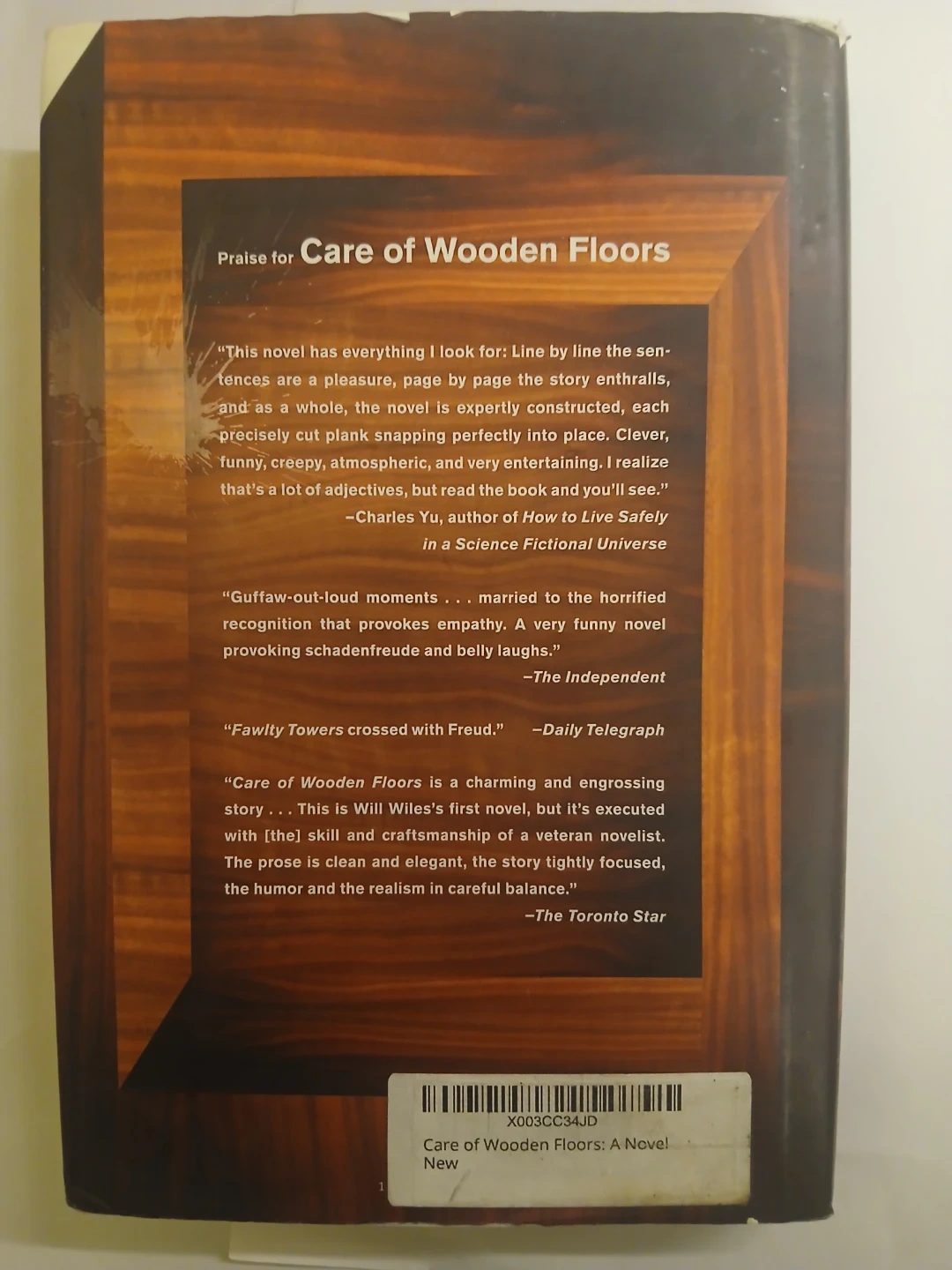 This is the novel "Care of Wooden Floors" by Will Wiles. It's a story praised for its engaging prose and clever construction. The book's physical dimensions are standard for a novel.