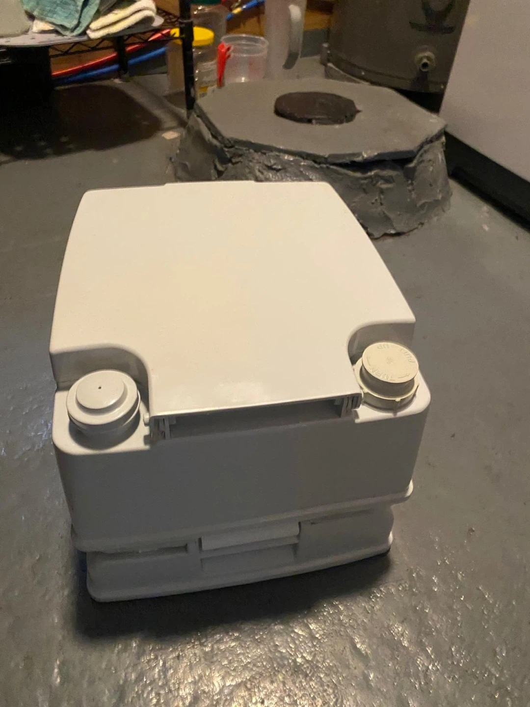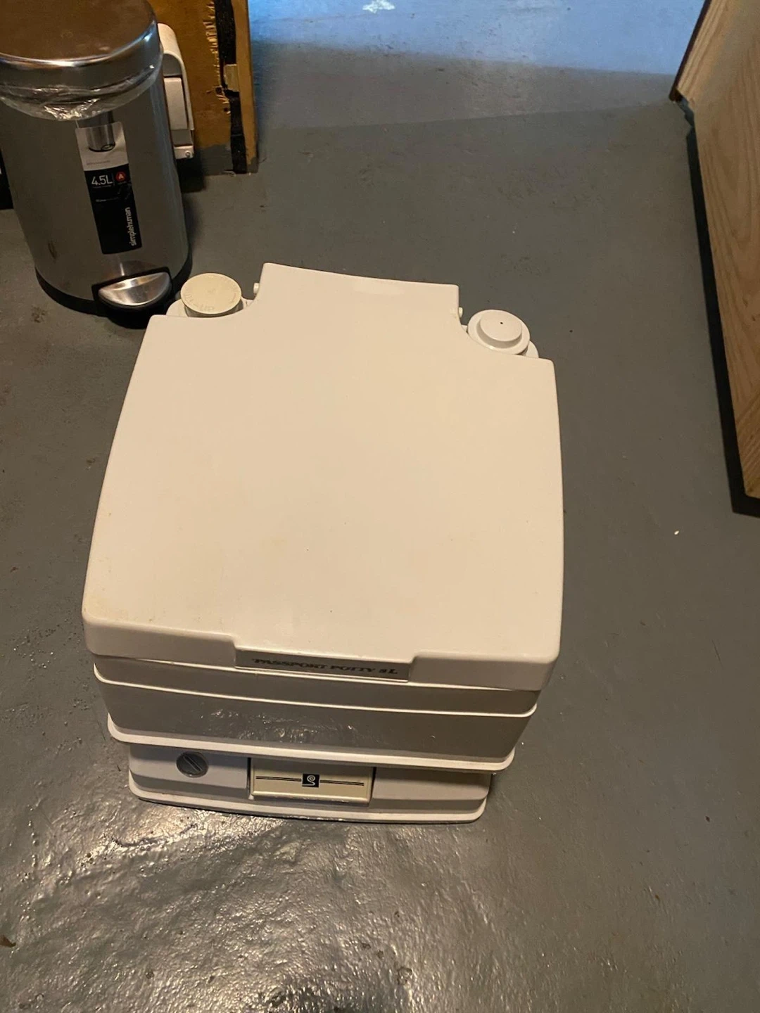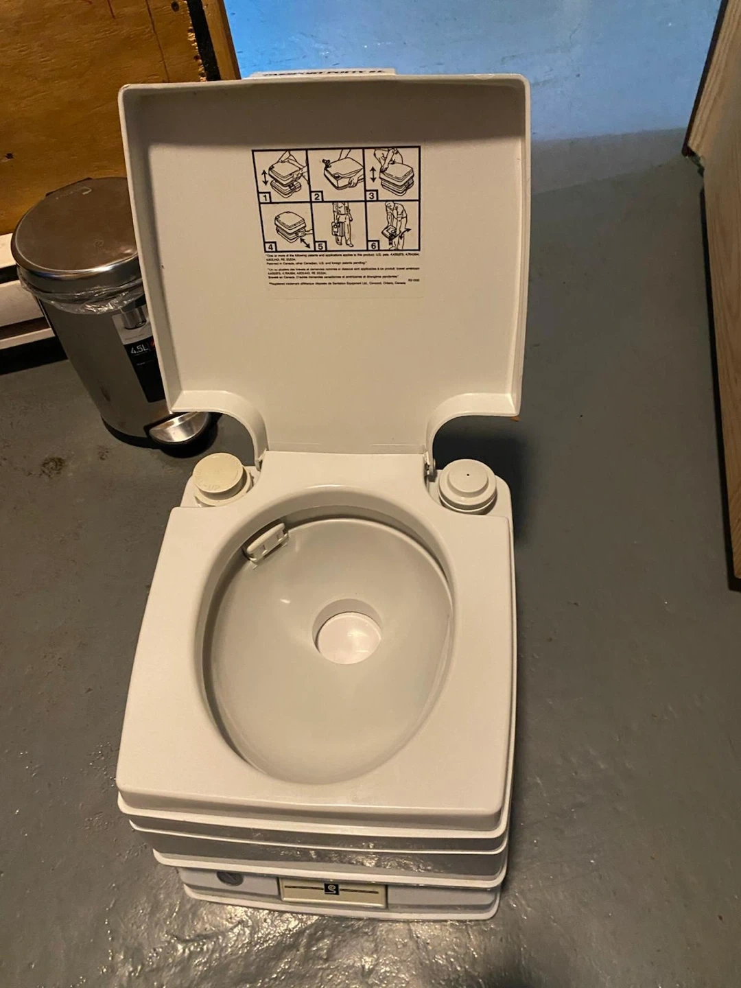 Selling a portable camping toilet in excellent condition! It's super convenient for camping trips or any outdoor adventures where you need a reliable toilet solution Full size with lid comfortable for adults and kids.