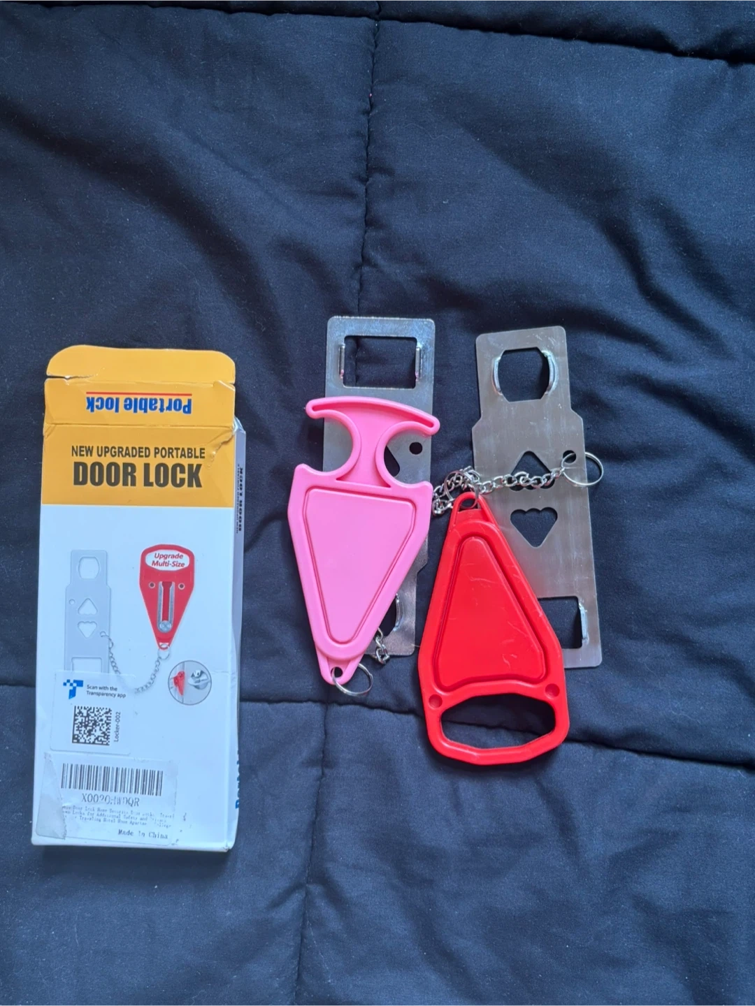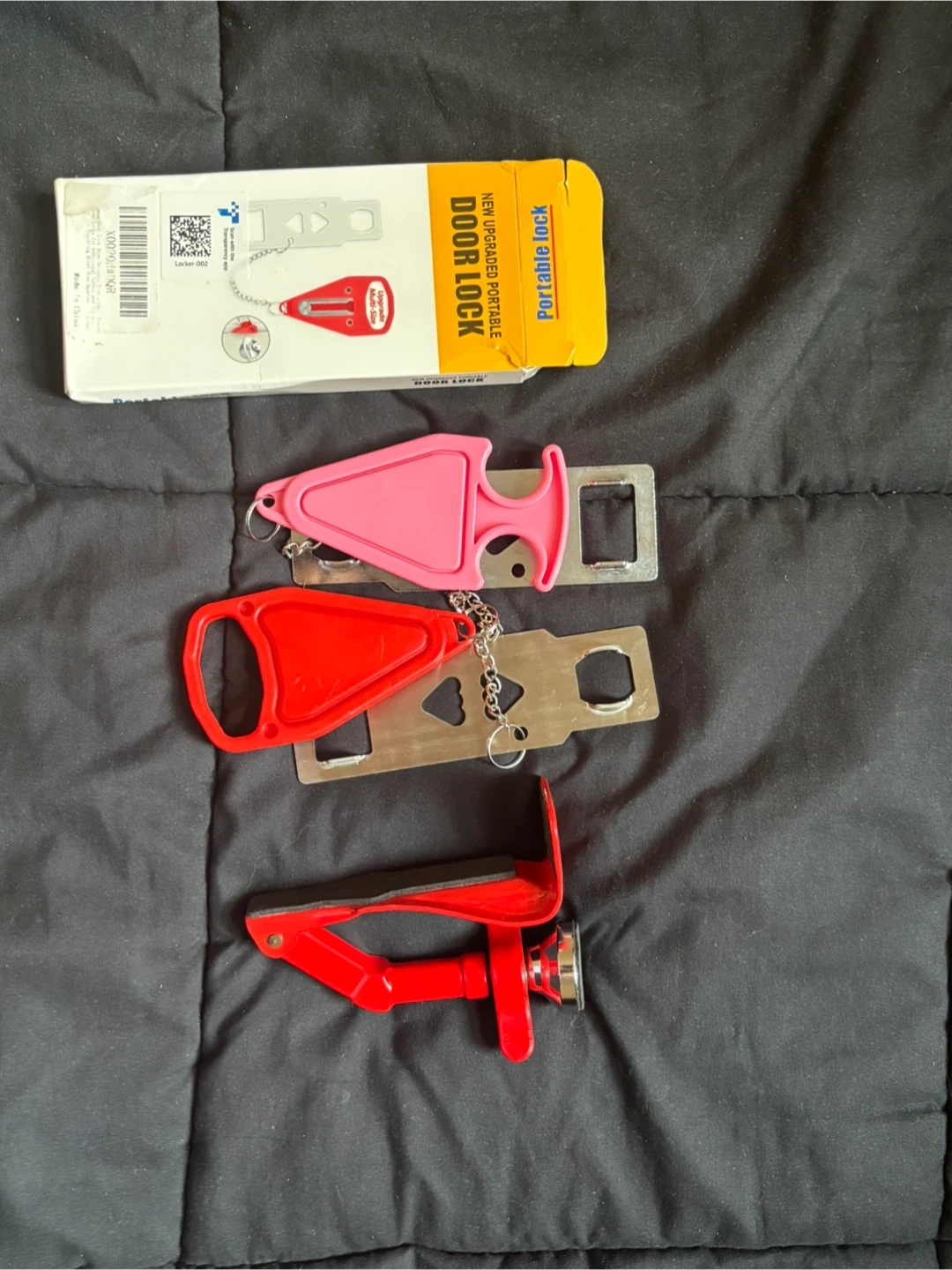 I have a portable door lock for sale. It's a new, upgraded version. The lock is lightweight and portable, making it easy to take with you when you travel. Includes the box. All are new never used