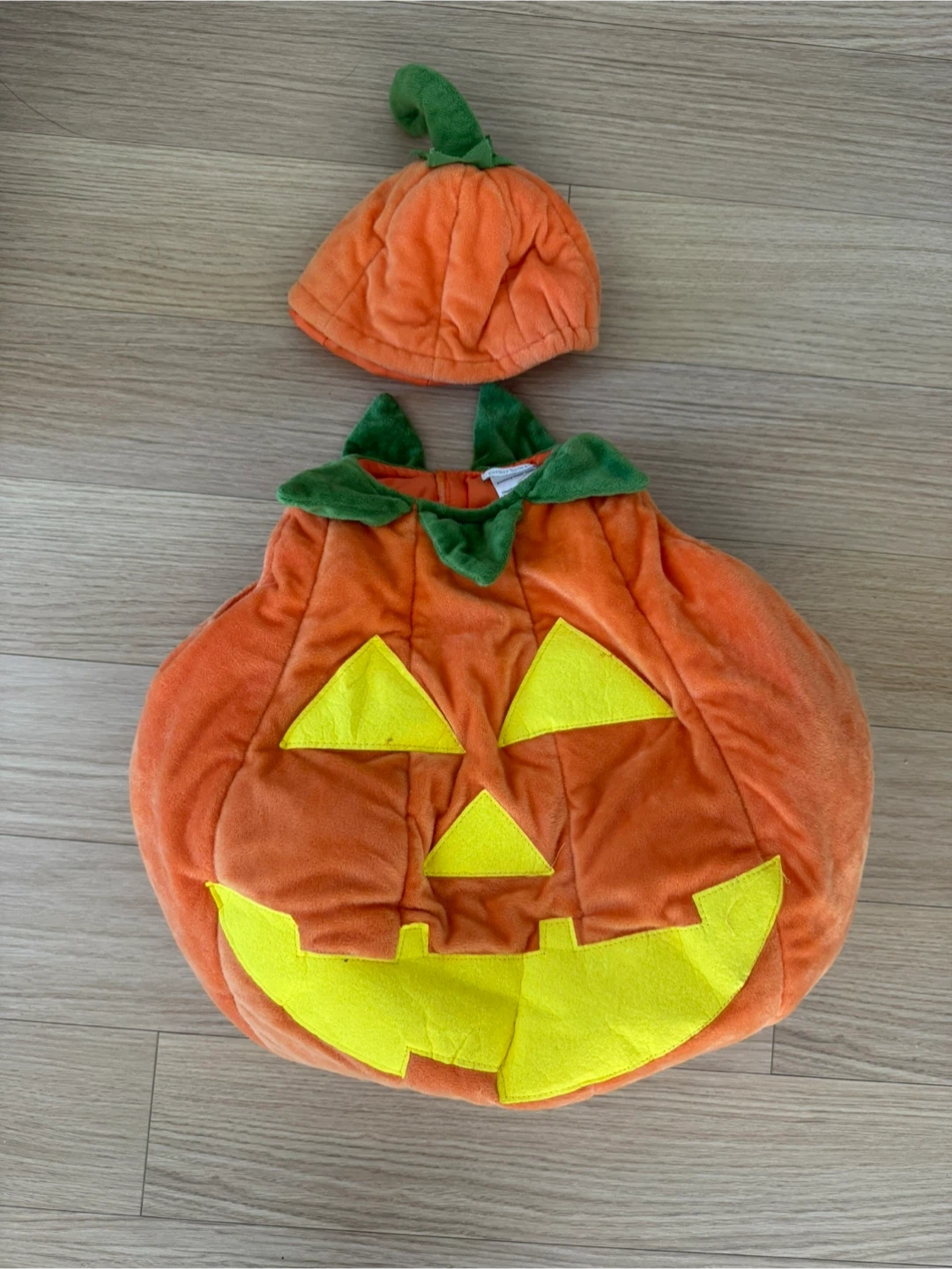 I'm selling a Pottery Barn Kids pumpkin costume in size 2T. It's in great condition and ready for Halloween! The set includes the pumpkin body, a pumpkin hat, and a black hoodie with pumpkin pants