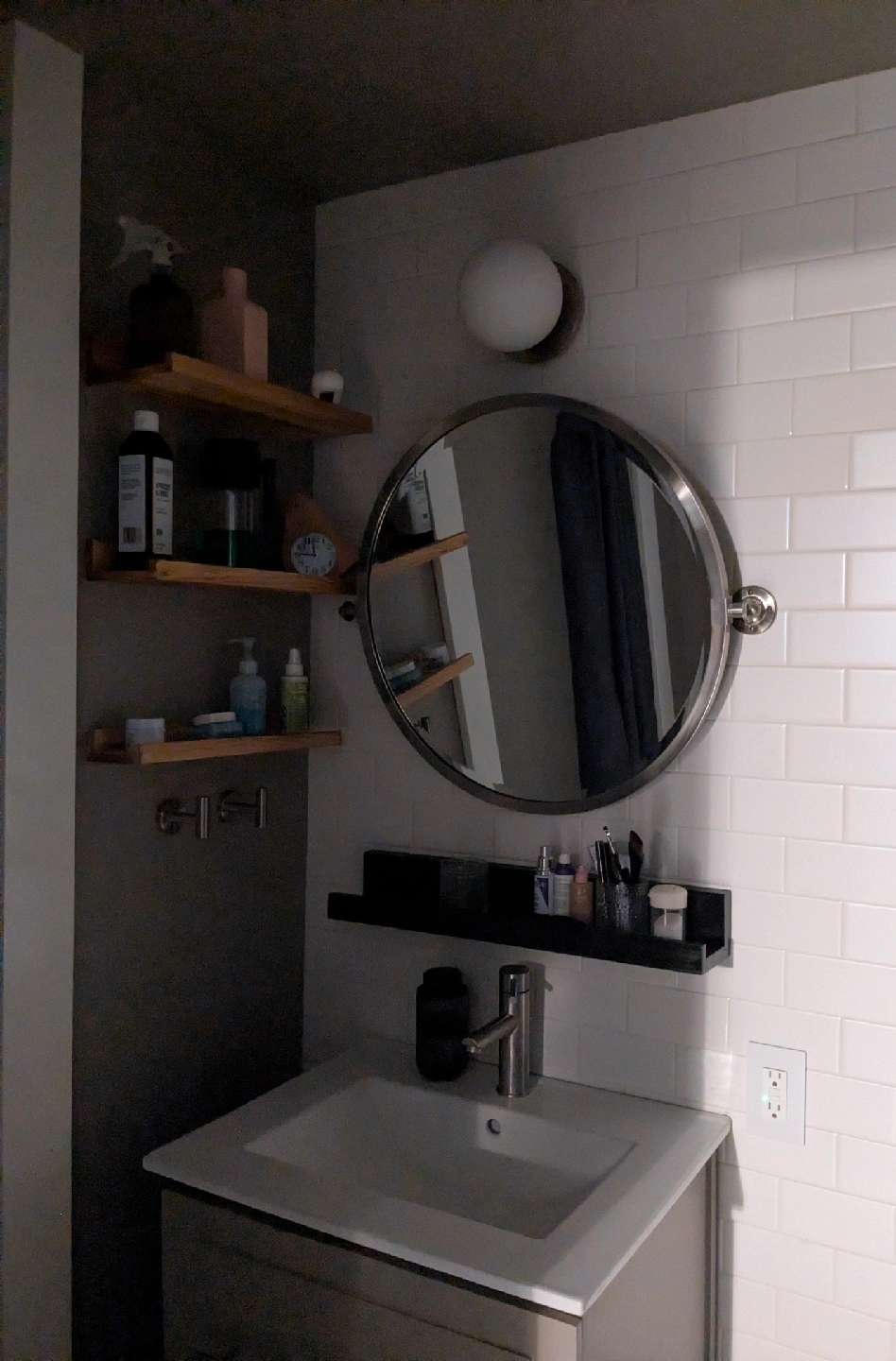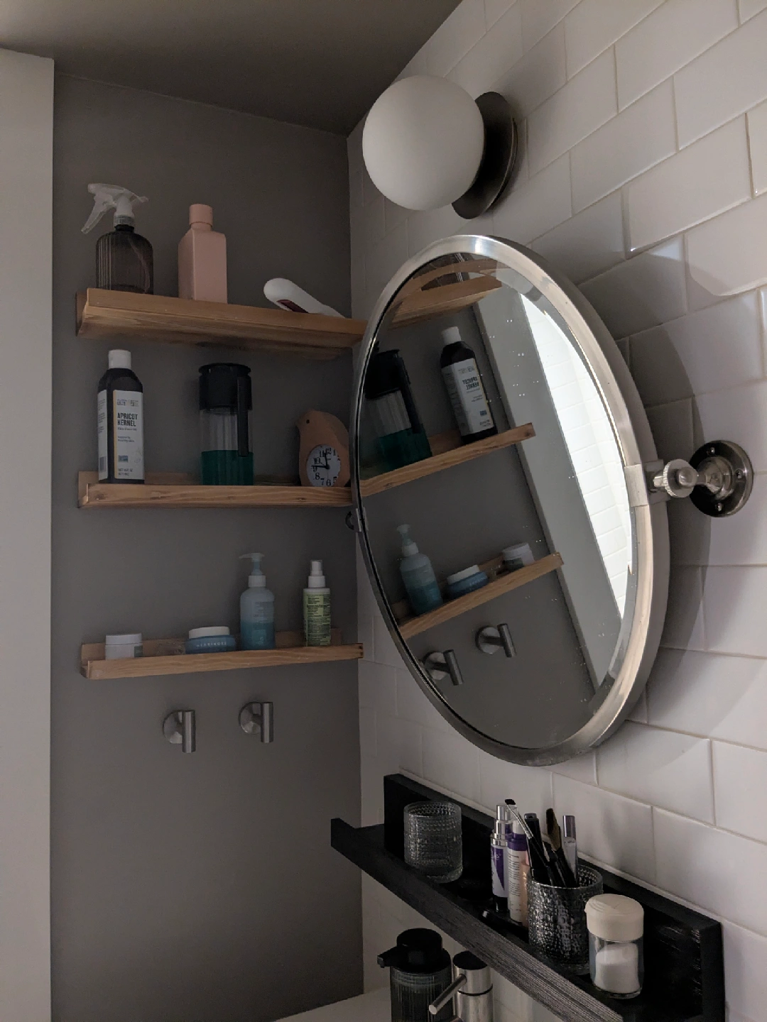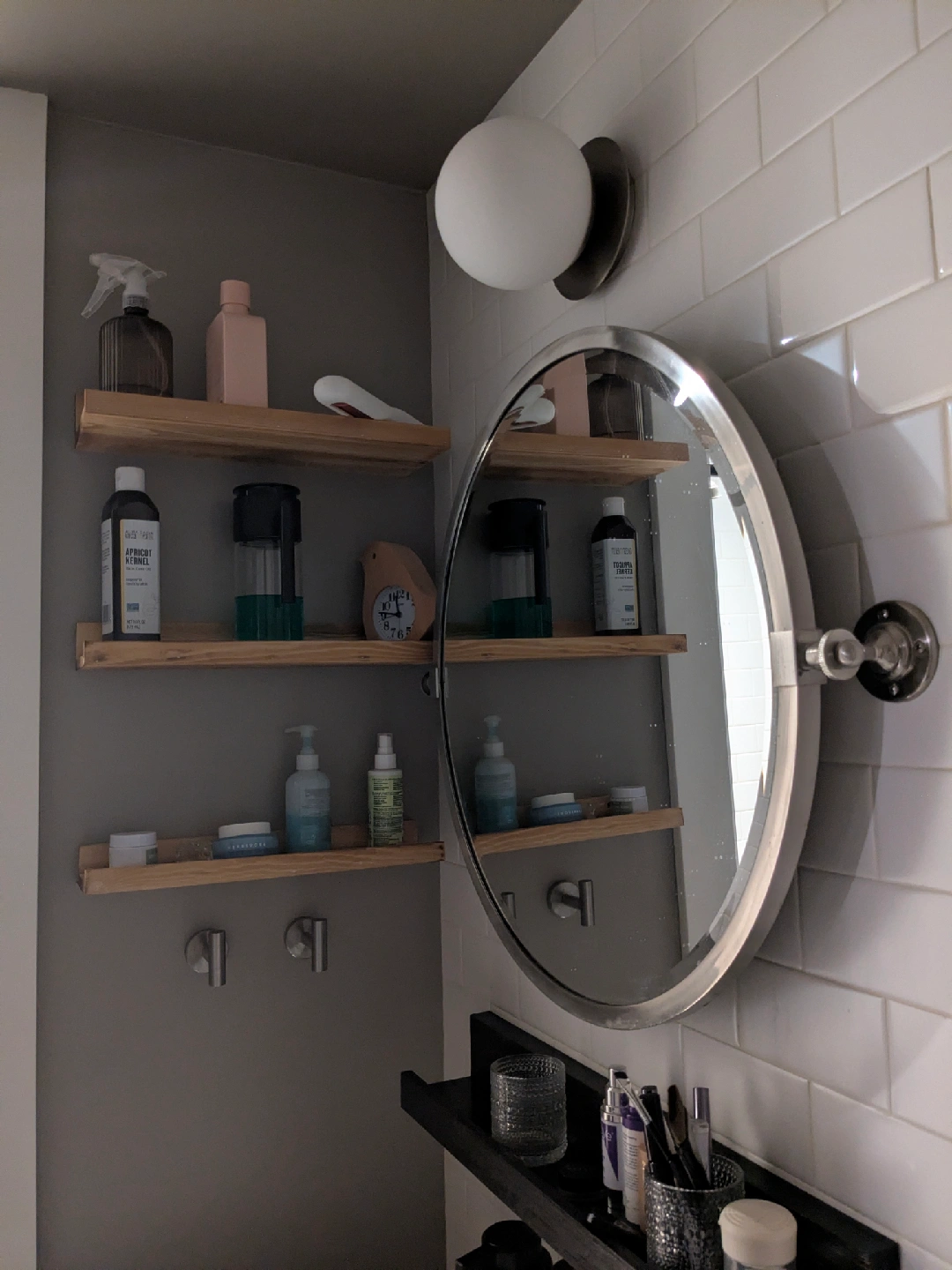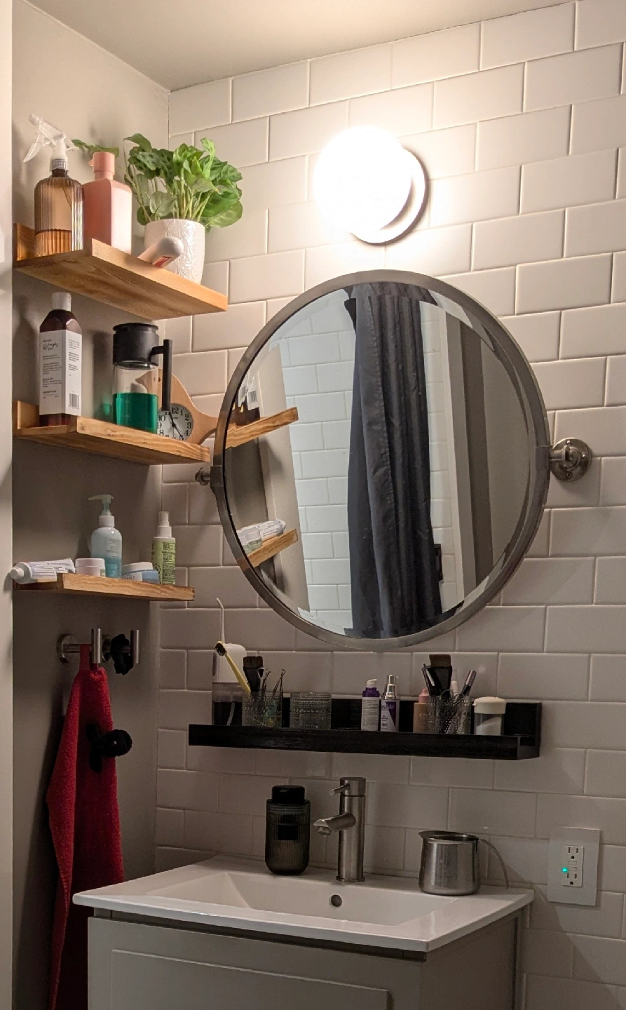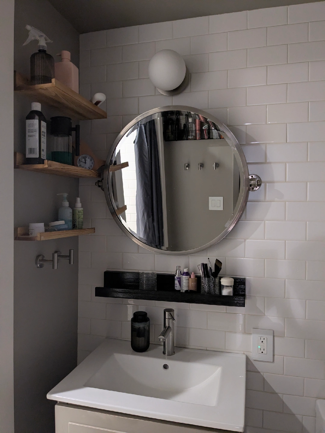Retail $500 24" "POTTERY BARN" Linden Round Pivot Mirror in Nickel finish + flowing black stained wood shelf (original color: light brown): https://www.potterybarn.com/products/linden-round-pivot-mirror/ 24" POTTERY BARN Holman Handmade Floating Ledge in stained Black (original color was seadrift): https://www.potterybarn.com/products/holman-ledge/?subGroupId=holman-ledge-SPAF-color-neutral-color&cm_sp=ossa-18678_bestseller_variant 3 Pine Wood Shelves Shades of Light globe light in Satin Nickel: 6"H x 7.75"D: https://www.shadesoflight.com/products/modern-milky-globe-vanity-light-2-light