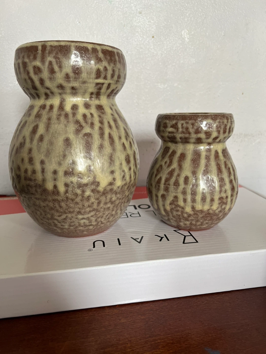 Selling a set of two pottery vases .They have a unique brown and cream colored glaze. These vases are perfect for adding a touch of rustic charm to your home decor