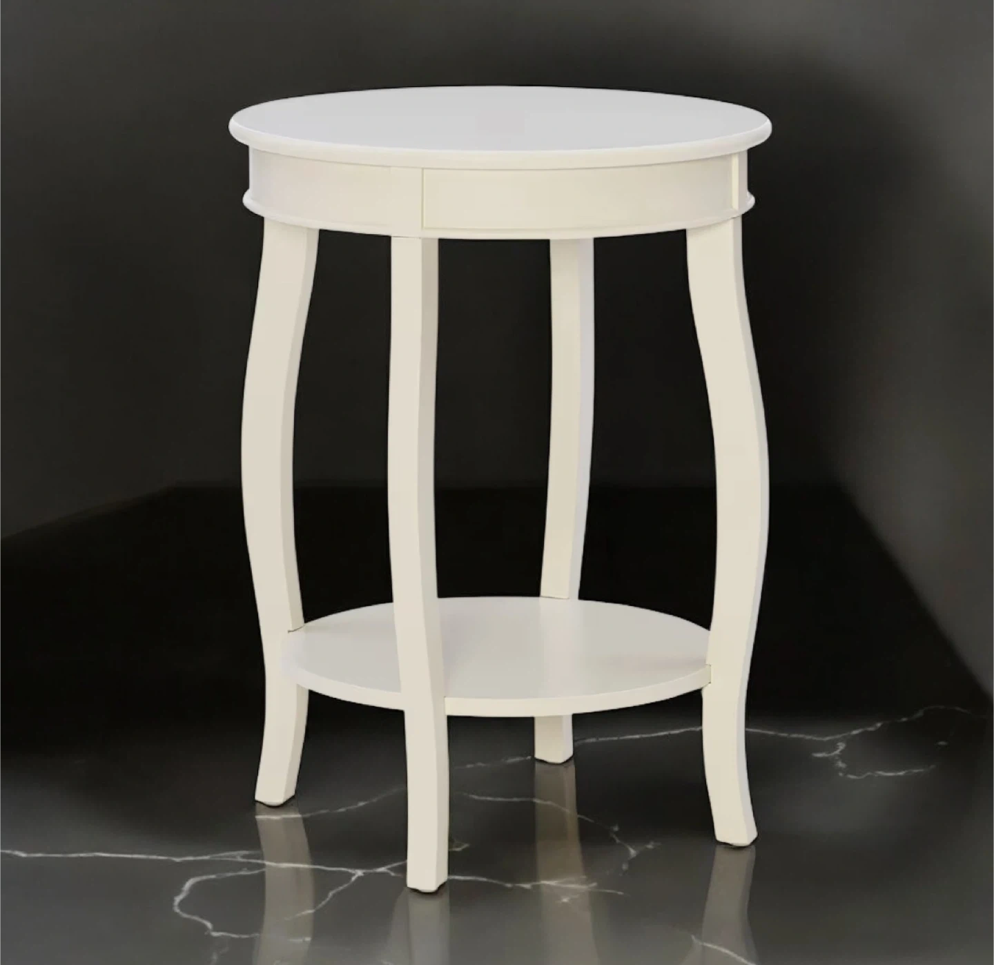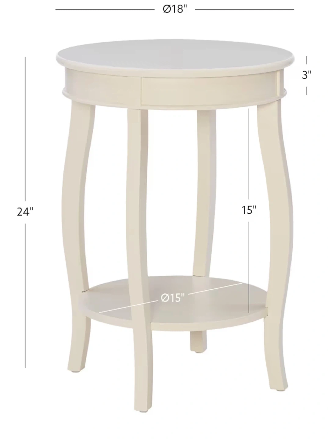 25Beautiful round accent table, still in the box. The table is white, making it easy to match with any decor. The dimensions are: - Height: 24 inches - Top Diameter: 18 inches - Bottom Shelf Diameter: 15 inches