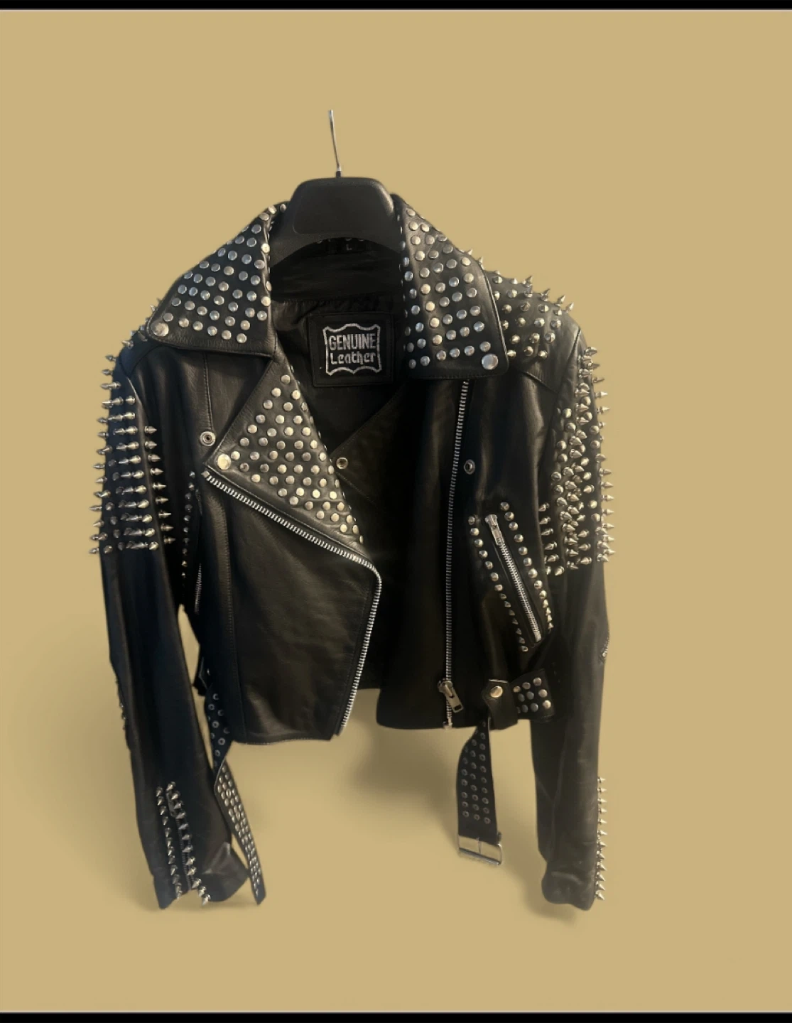 This black biker jacket is made of genuine leather and fully covered in silver spikes and studs. It's a classic moto jacket style with a zippered front and lapels. This jacket will make a statement!
