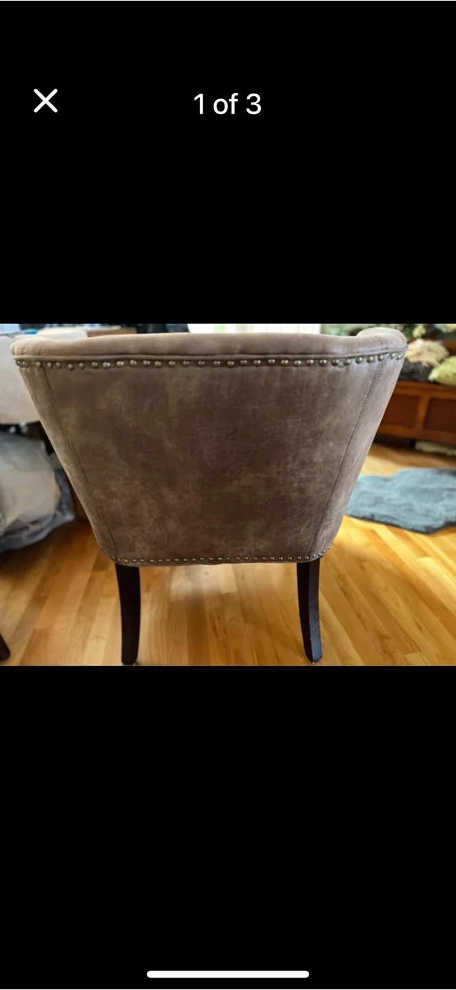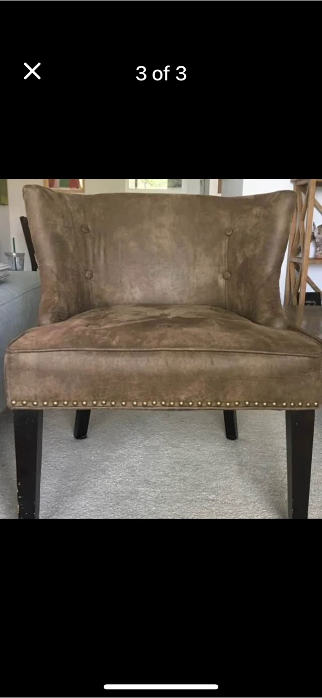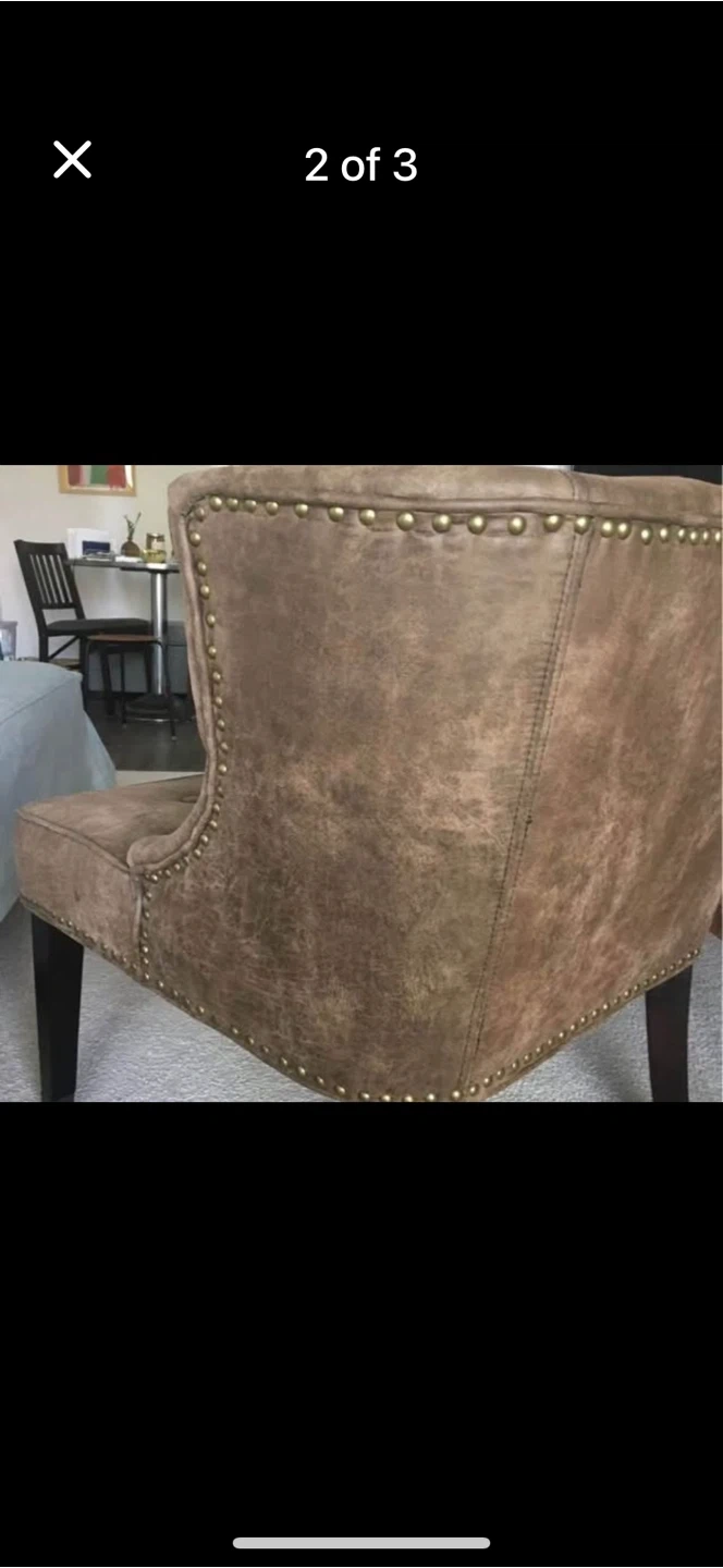 This accent chair features a comfortable tufted seat and back, accented with decorative nailhead trim. It's upholstered in a durable, distressed brown faux leather. The sturdy wooden legs offer reliable support. This chair's classic design works well in a living room or bedroom.
