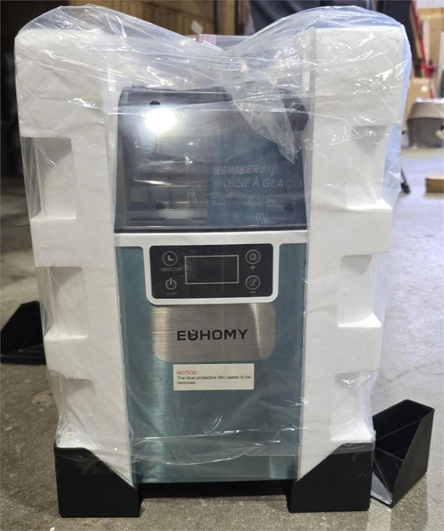 Brand new and complete in an open box. Pickup is near Kipling and Evans. 2 Ways to Add Water - Bottle Not Included. The countertop ice maker machine holds up to 3.2 liters of water, minimizing how often you need to refill it. You can also put in buckets of water less than 2 inches in diameter. AUTOMATIC CLEANING FUNCTION - Press the "TIMER" button for more than 5 seconds to enter the automatic cleaning function. Please clean your ice machine regularly. High-Quality Ice Cubes & Reservation - Euhomy’s countertop ice maker machine can produce 24 crystal clear ice cubes per cycle (every 12 to 18 minutes), making up to 44 pounds of ice cubes every 24 hours. You can adjust the thickness of the ice cubes. Ice Making Reservation - You can set an appointment to make ice cubes by pressing the "TIMER" button once and setting the reservation time. LCD & Digital Display - Euhomy ice machine has an easy-to-read LCD display and push-button digital design. Timer with up to 8-hour delay. Offers on-time ice production. The indicator will light up when there is not enough water or when the ice bucket is full. Food-Safe & Super Quiet & Save Money - The material is Food-Safe and anti-corrosion. Around 45db sound level won’t disturb you. Save money by making ice at home instead of buying it from the convenience store.