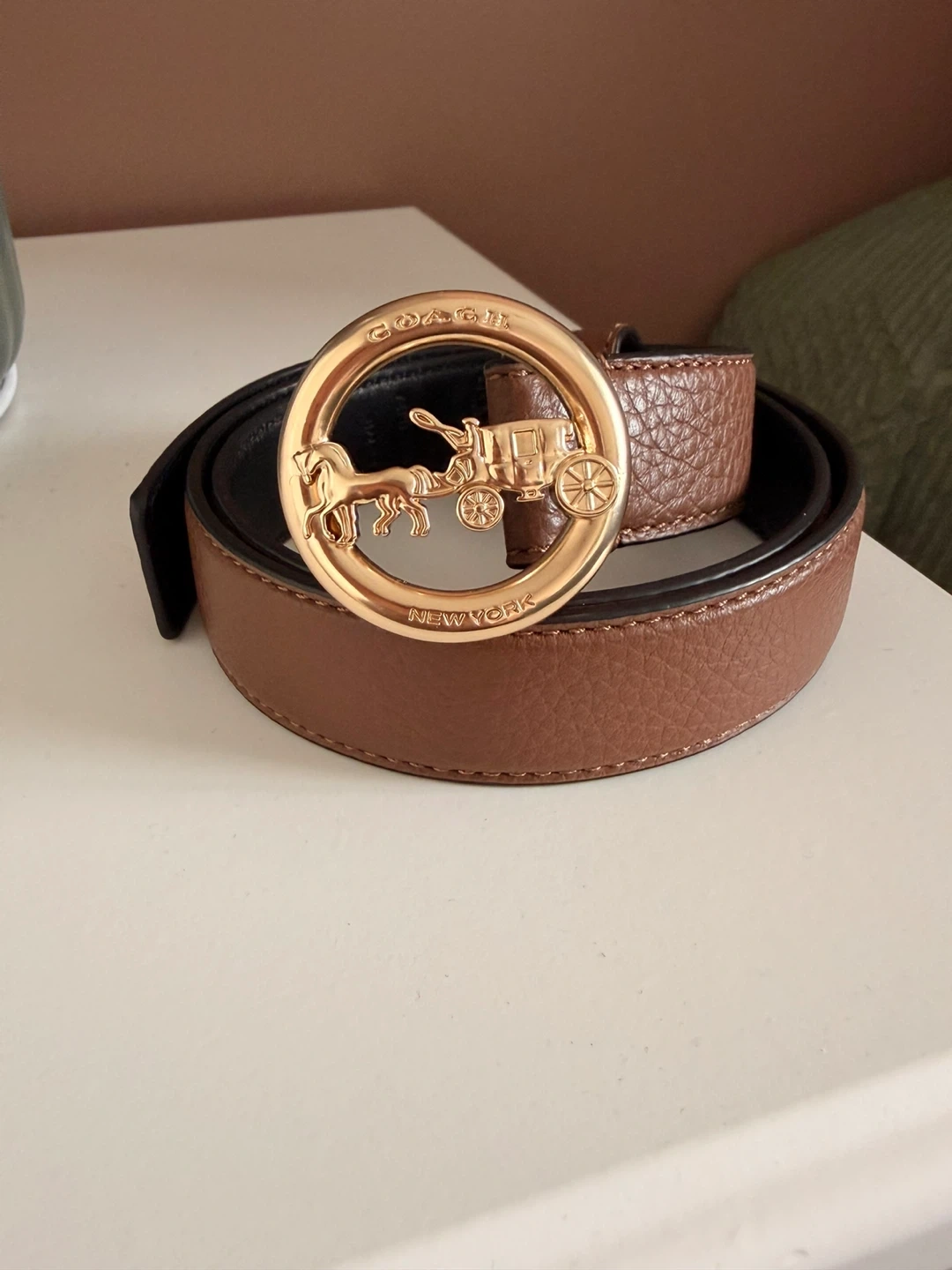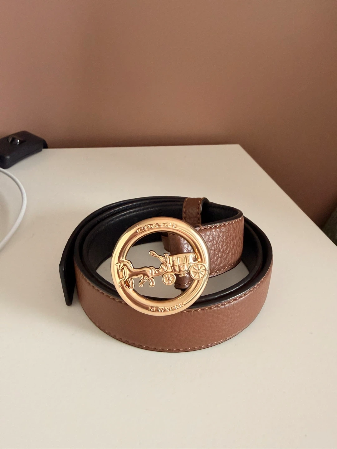 This is a stylish Coach belt in Mint condition! It features a brown leather strap and a distinctive gold-tone buckle with the iconic Coach horse and carriage logo. Perfect for adding a touch of elegance to any outfit!