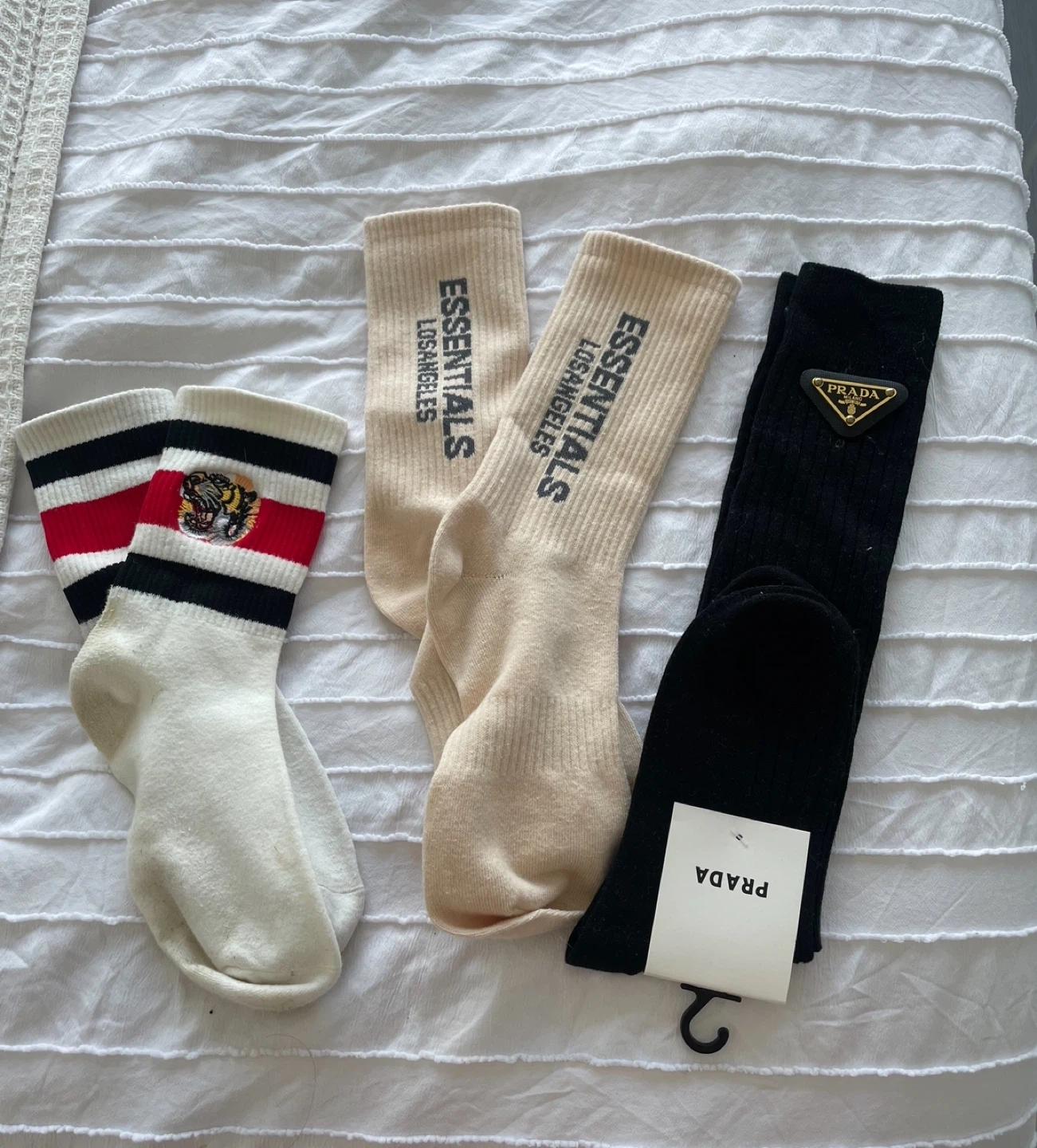 Selling a bundle of socks which includes Prada and Essentials. - Prada socks are black - Essentials socks are beige