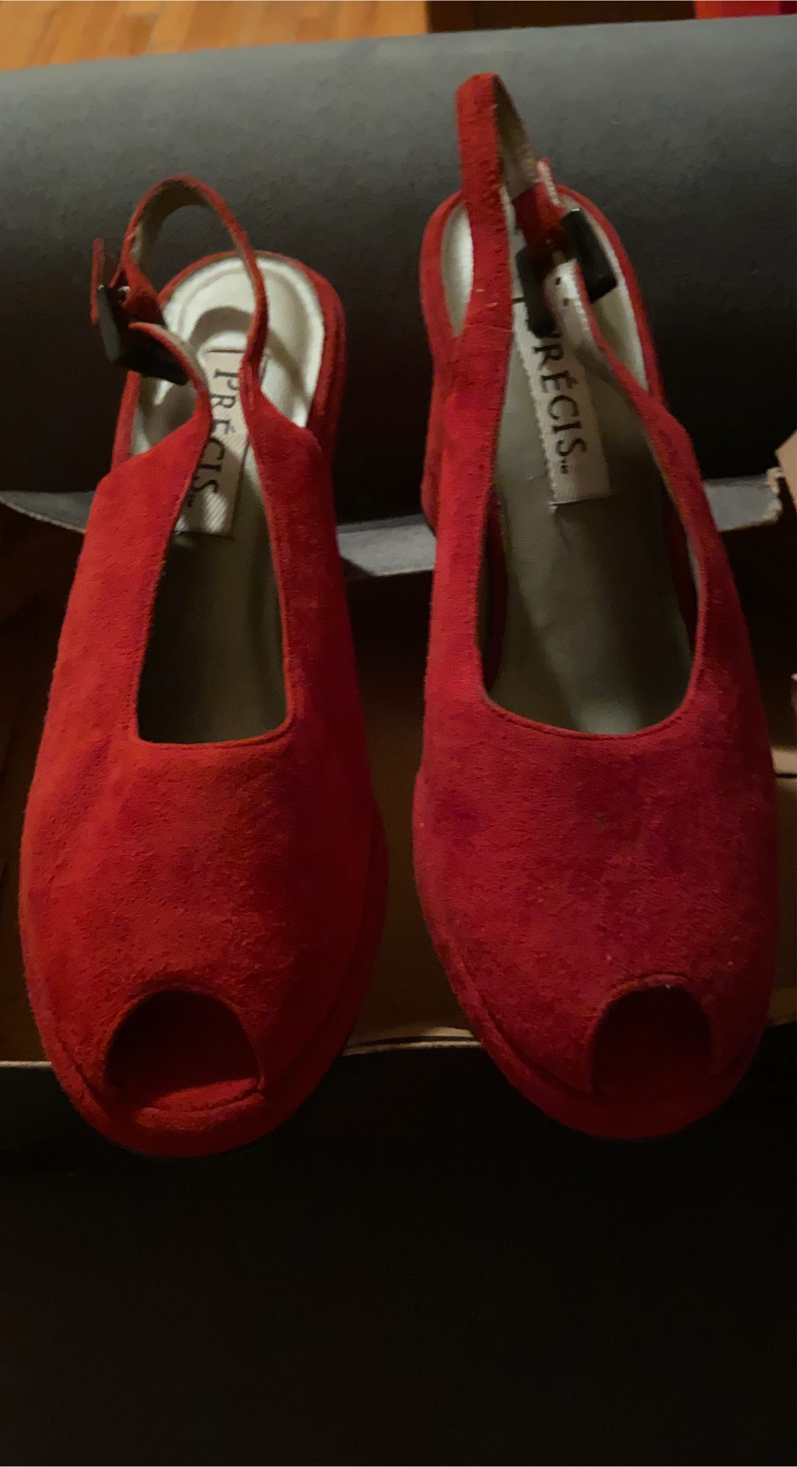 Selling a pair of PRECIS red suede peep toe slingback heels! They are new and come in their original box. These heels are perfect for adding a pop of color to any outfit