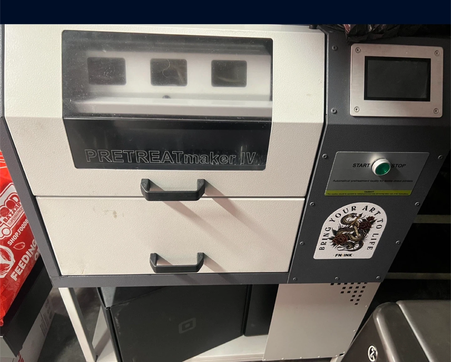 10Selling a PRETREATmaker IV, an automatic pretreatment facility for textile direct printers. It has a START/STOP button and is labeled with 'BRING YOUR ART TO LIFE'