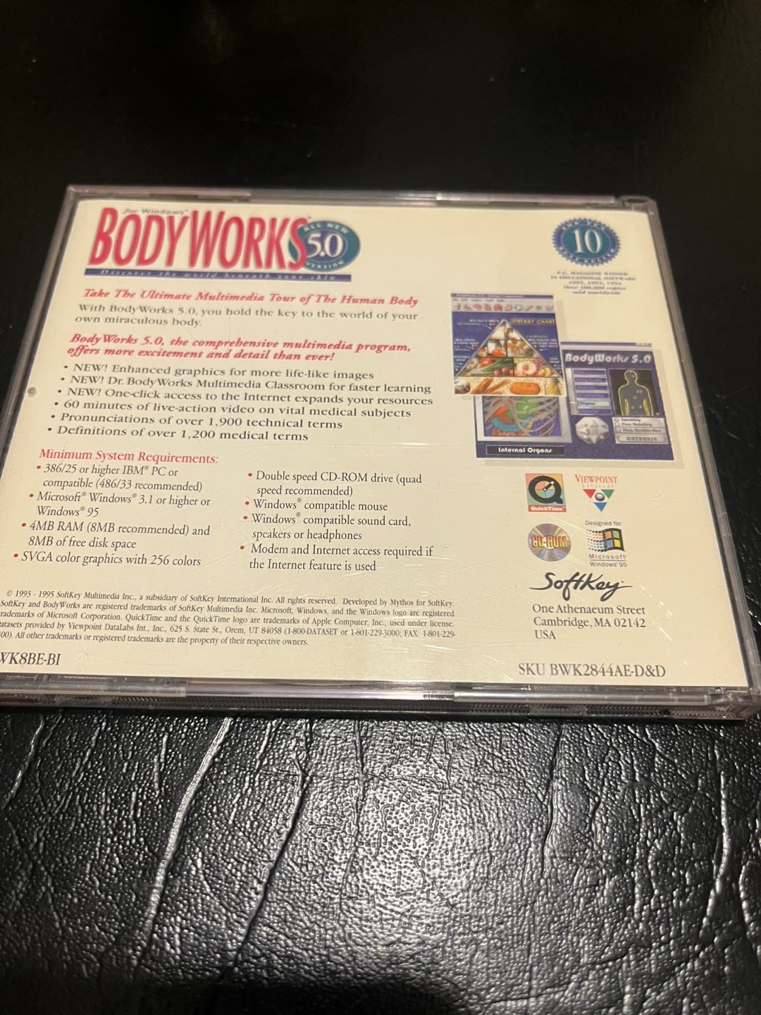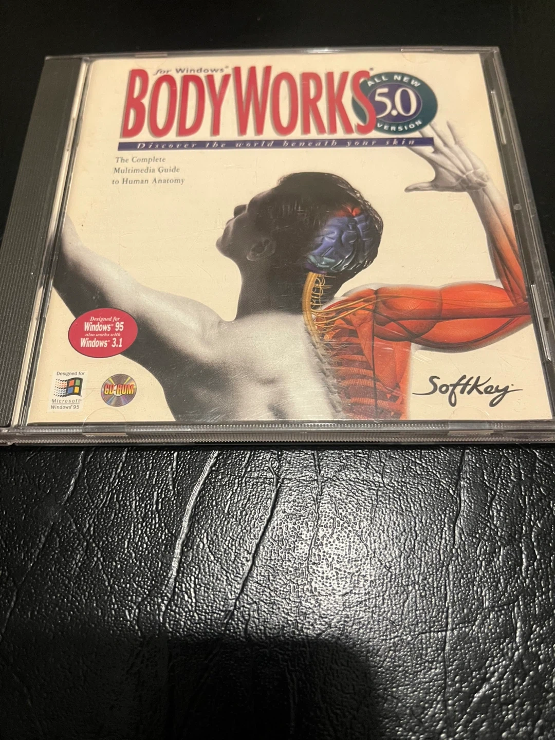 This is the Body Works 5.0 CD-ROM, a complete multimedia guide to human anatomy. It includes 60 minutes of live-action video and over 1,900 definitions. Minimum system requirements include a 386 or faster PC and Windows 3.1 or higher.