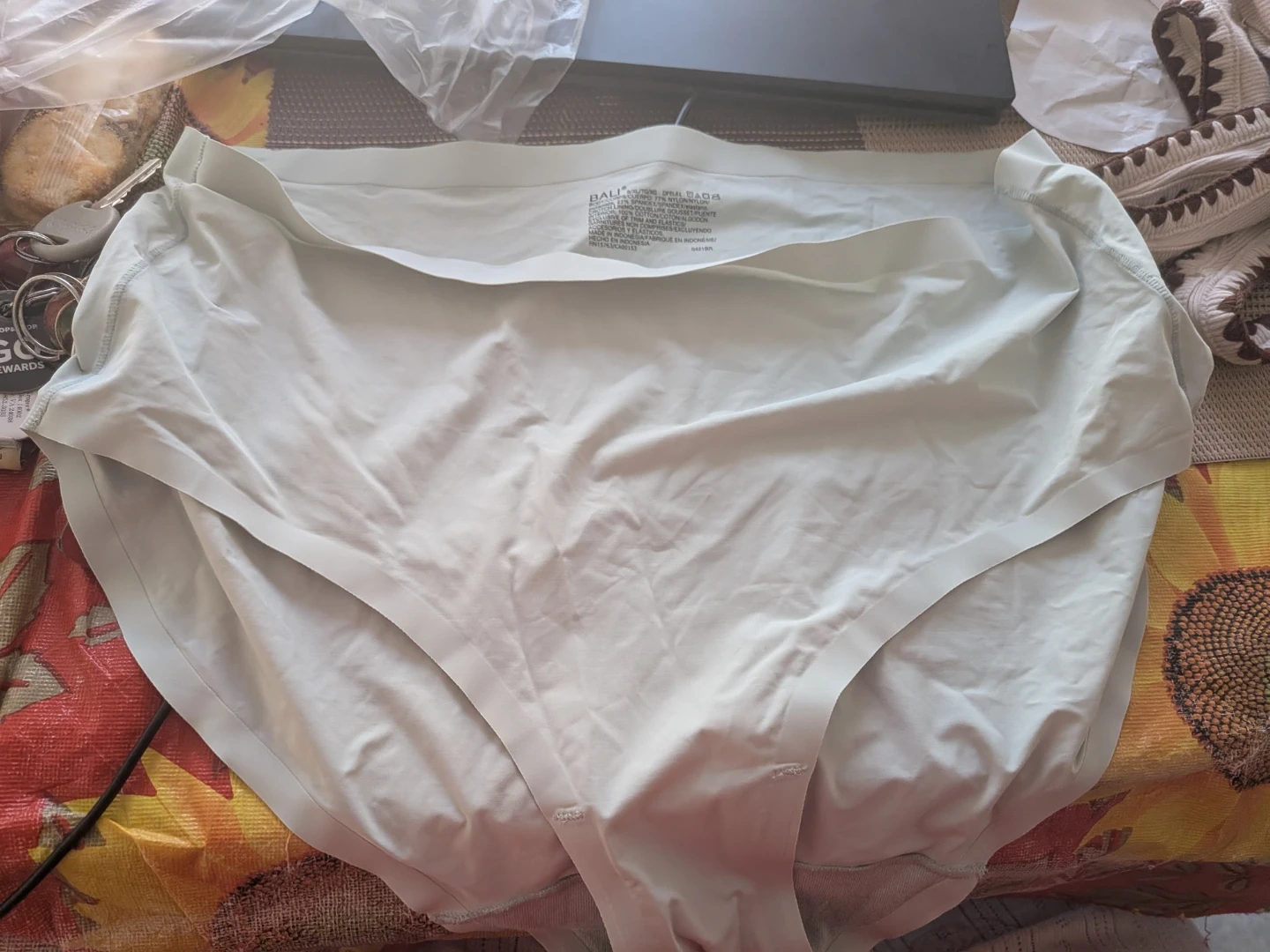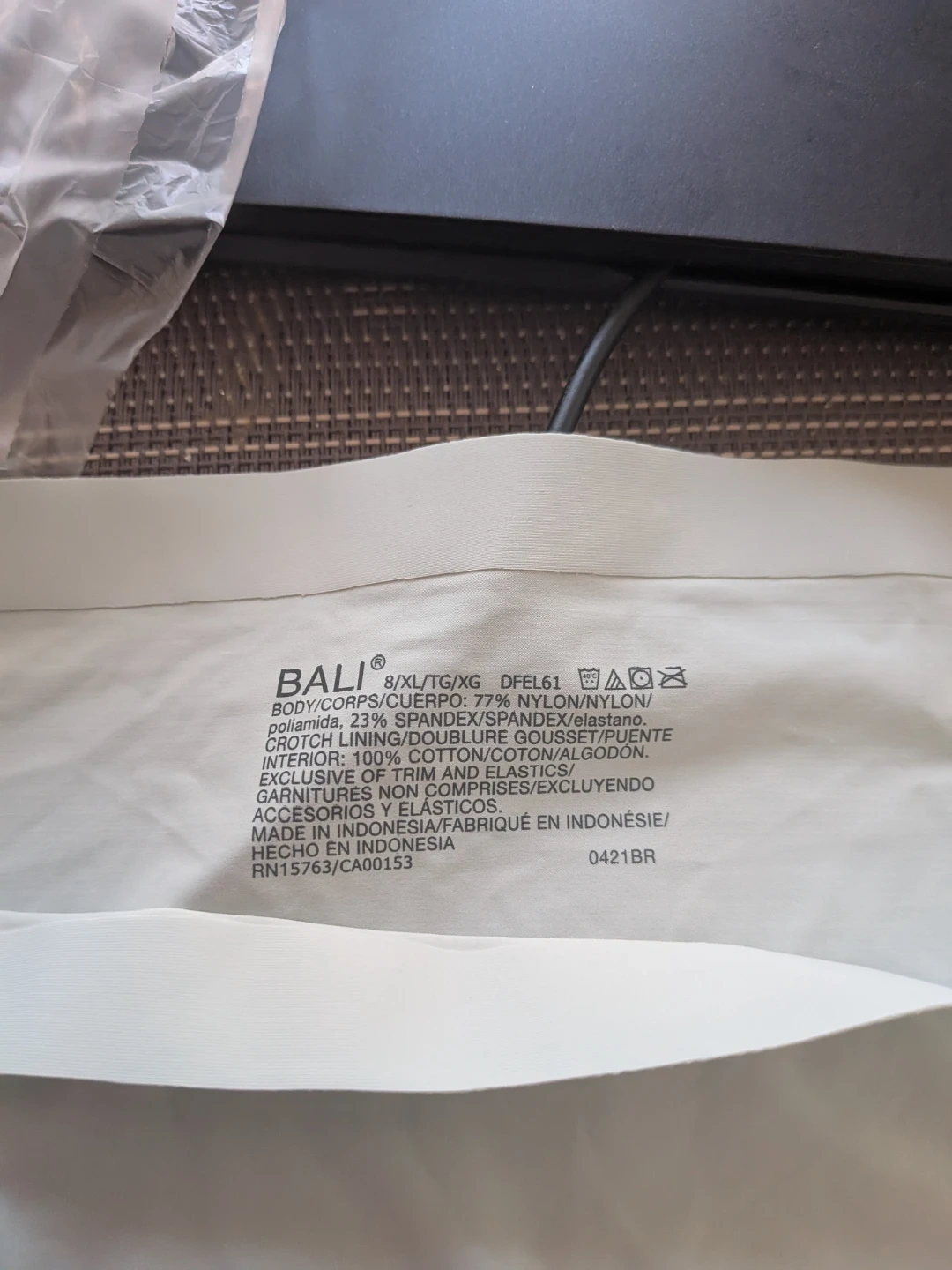 Bali women's briefs. Body: 77% Nylon, 23% Spandex. Exclusive of trim and elastics. Exclusive of accessories and elastics. Made in Indonesia. Brand new. Tried on and didn't like it. Washed and packed away.