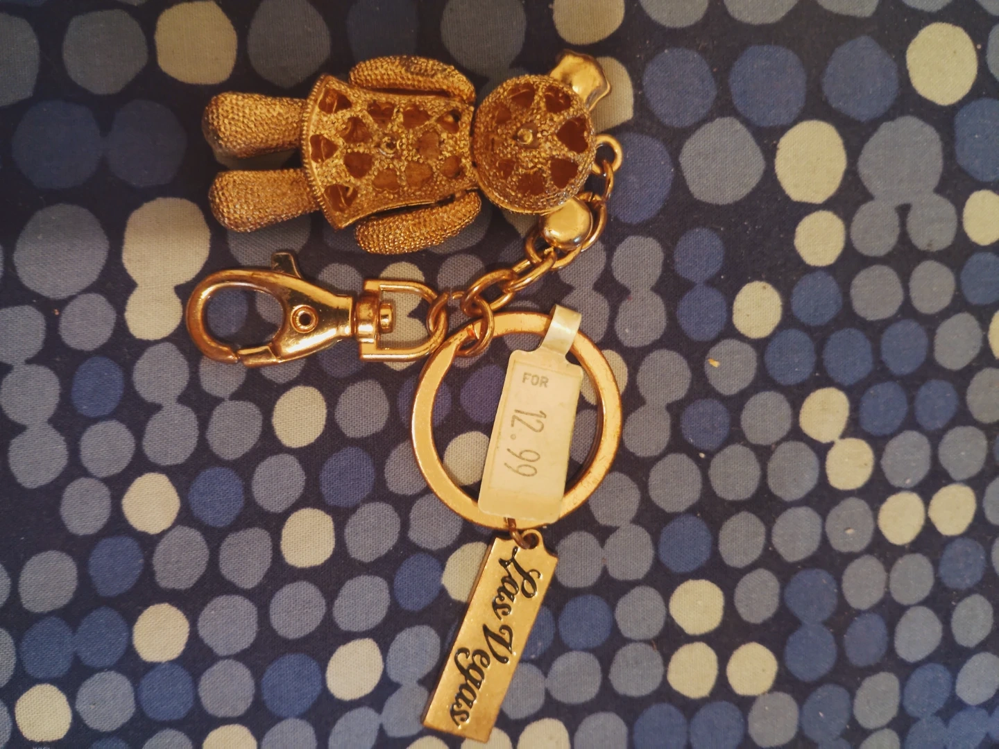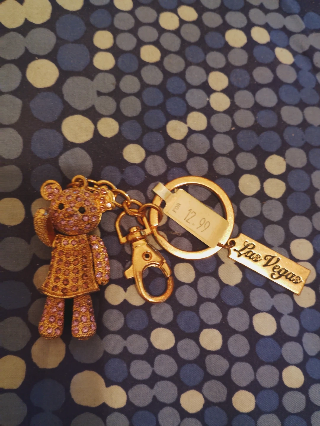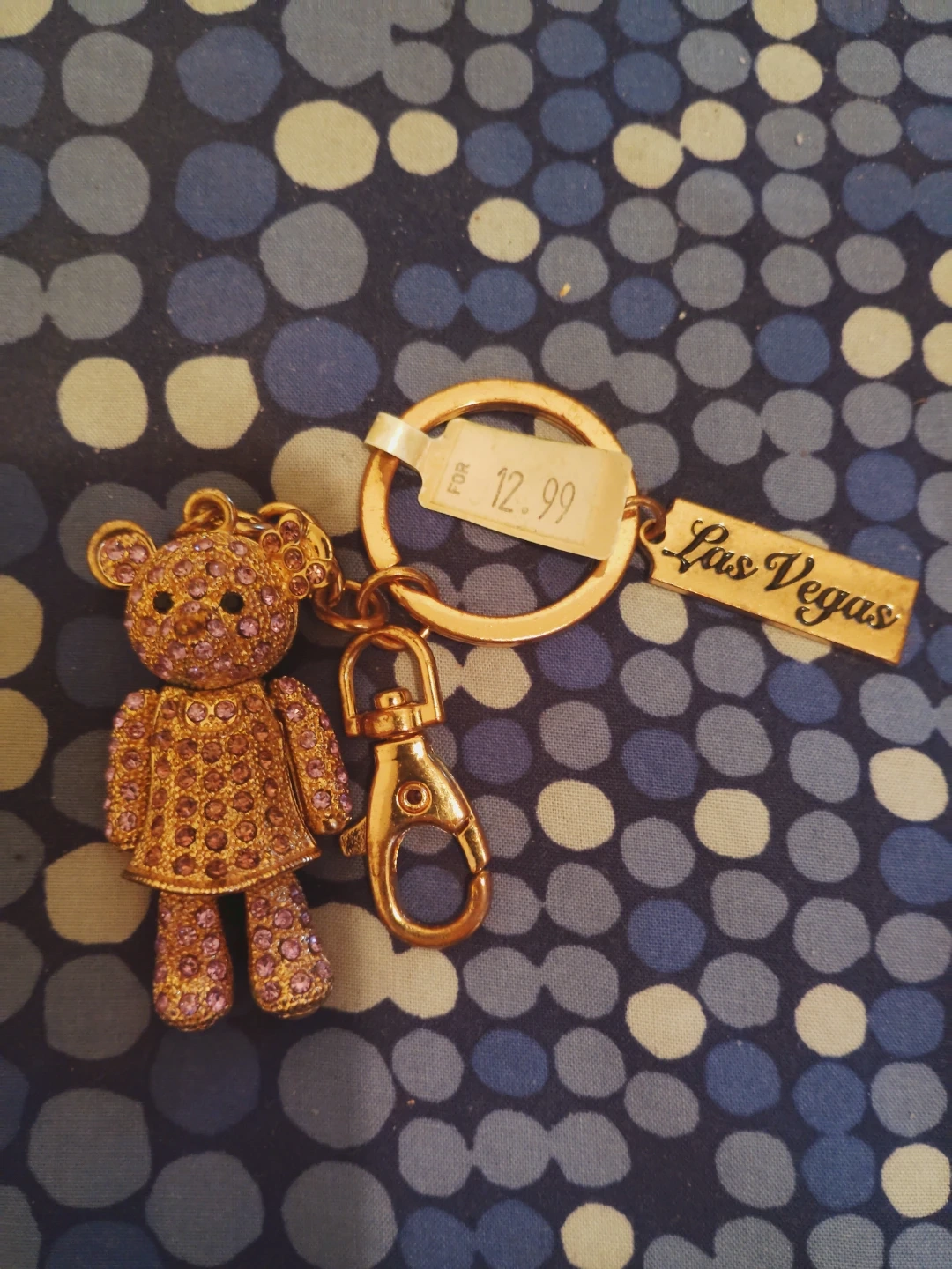 This keychain features a cute teddy bear charm covered in purple rhinestones. It also has a "Las Vegas" charm attached. Gold-tone metal. Great for adding some sparkle to your keys!