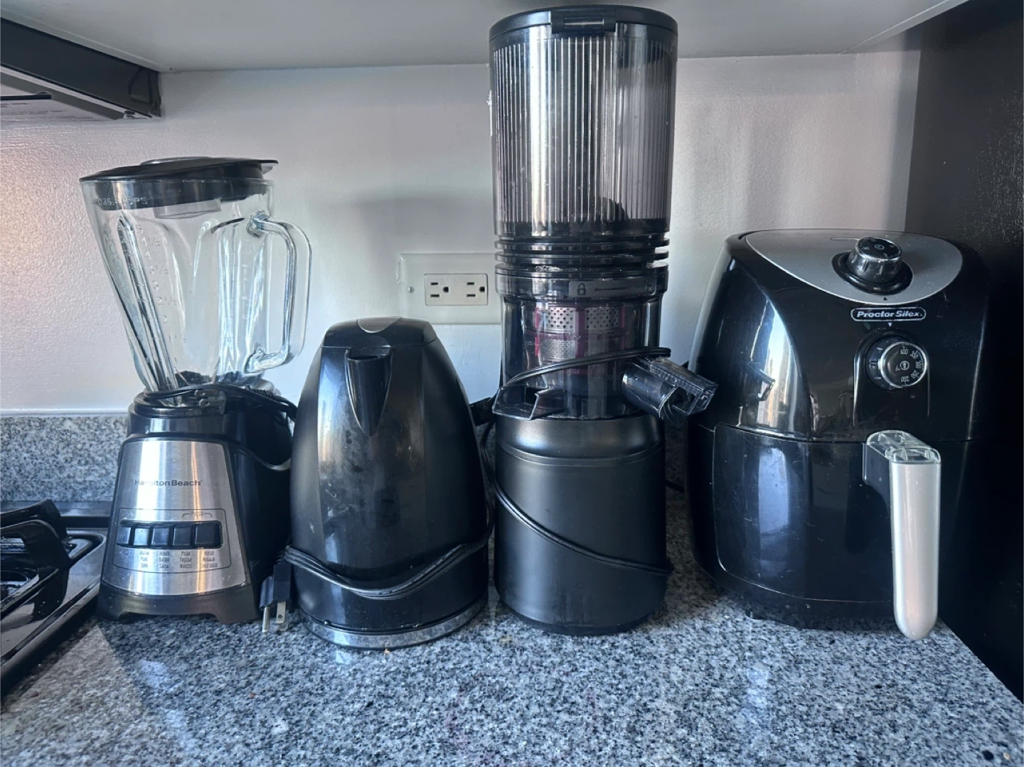 Includes a Hamilton Beach blender, a Proctor Silex air fryer, an electric kettle, and a juicer. All appliances are black. Juicer is upright with a clear container. Air fryer has a silver handle.