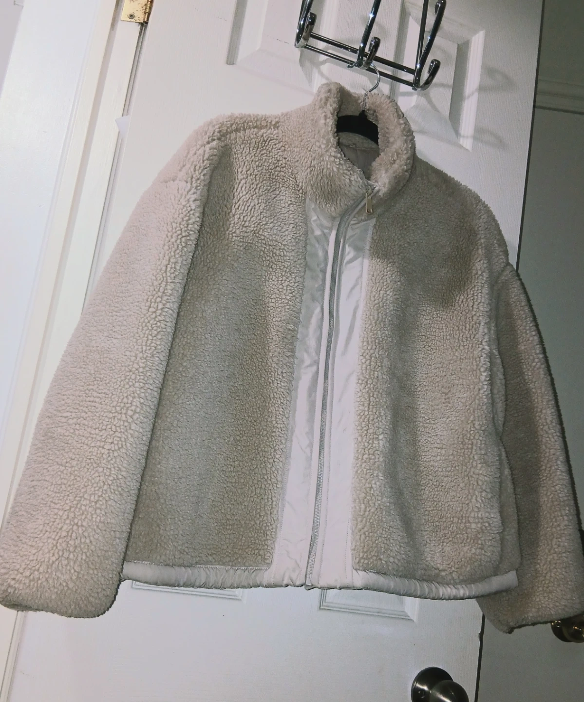This cozy relaxed sherpa jacket has is perfect for the cool weather; It's soft and warm!