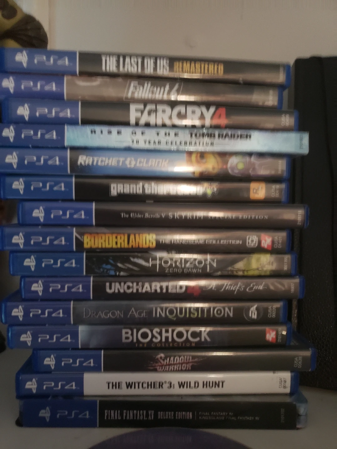 Selling a collection of PS4 games! Titles include: - The Last of Us Remastered - Fallout 4 - Far Cry 4 - Rise of the Tomb Raider 20 Year Celebration - Ratchet & Clank - Grand Theft Auto - The Elder Scrolls V Skyrim Special Edition - Borderlands The Handsome Collection - Horizon Zero Dawn - Uncharted 4 A Thief's End - Dragon Age Inquisition - Bioshock The Collection - Shadow Warrior - The Witcher 3: Wild Hunt - Final Fantasy XV Deluxe Edition