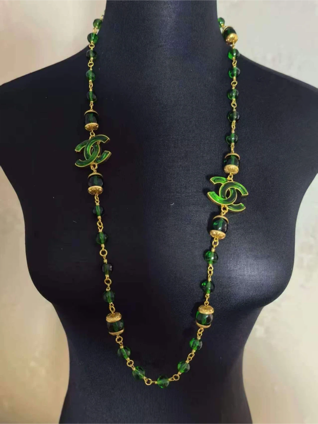 This is a long Chanel necklace with green beads and gold-tone accents. It features the iconic CC logo throughout the chain. The beads are a deep, translucent green.