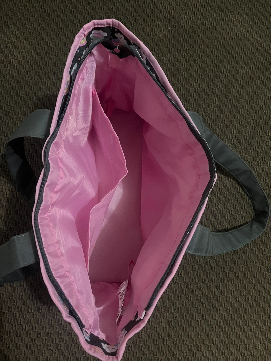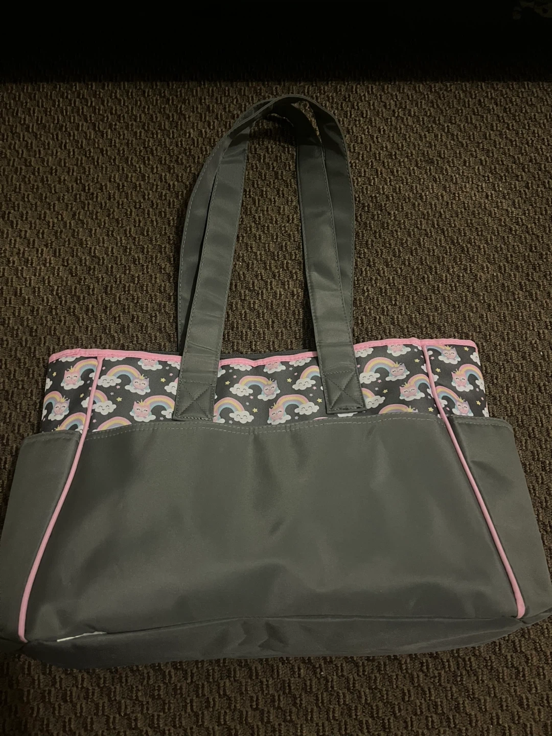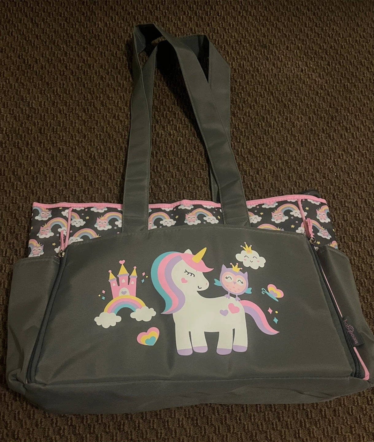 This grey diaper bag tote features a cute unicorn, castle, and rainbow design with pink trim. It has multiple interior pockets for organization. Great for carrying baby essentials!