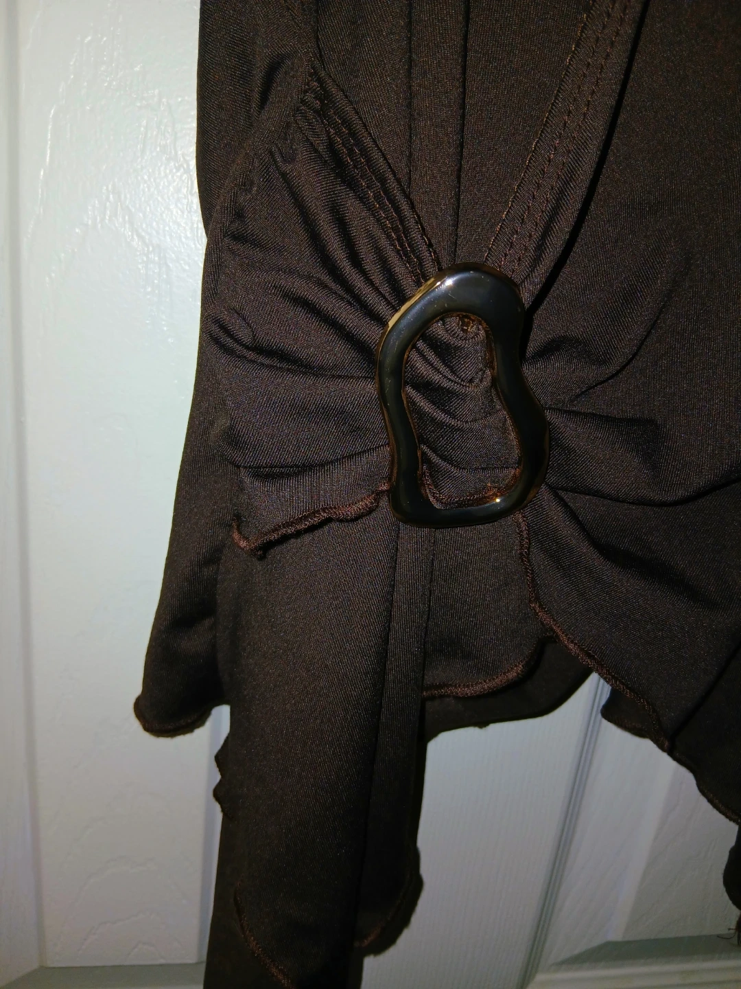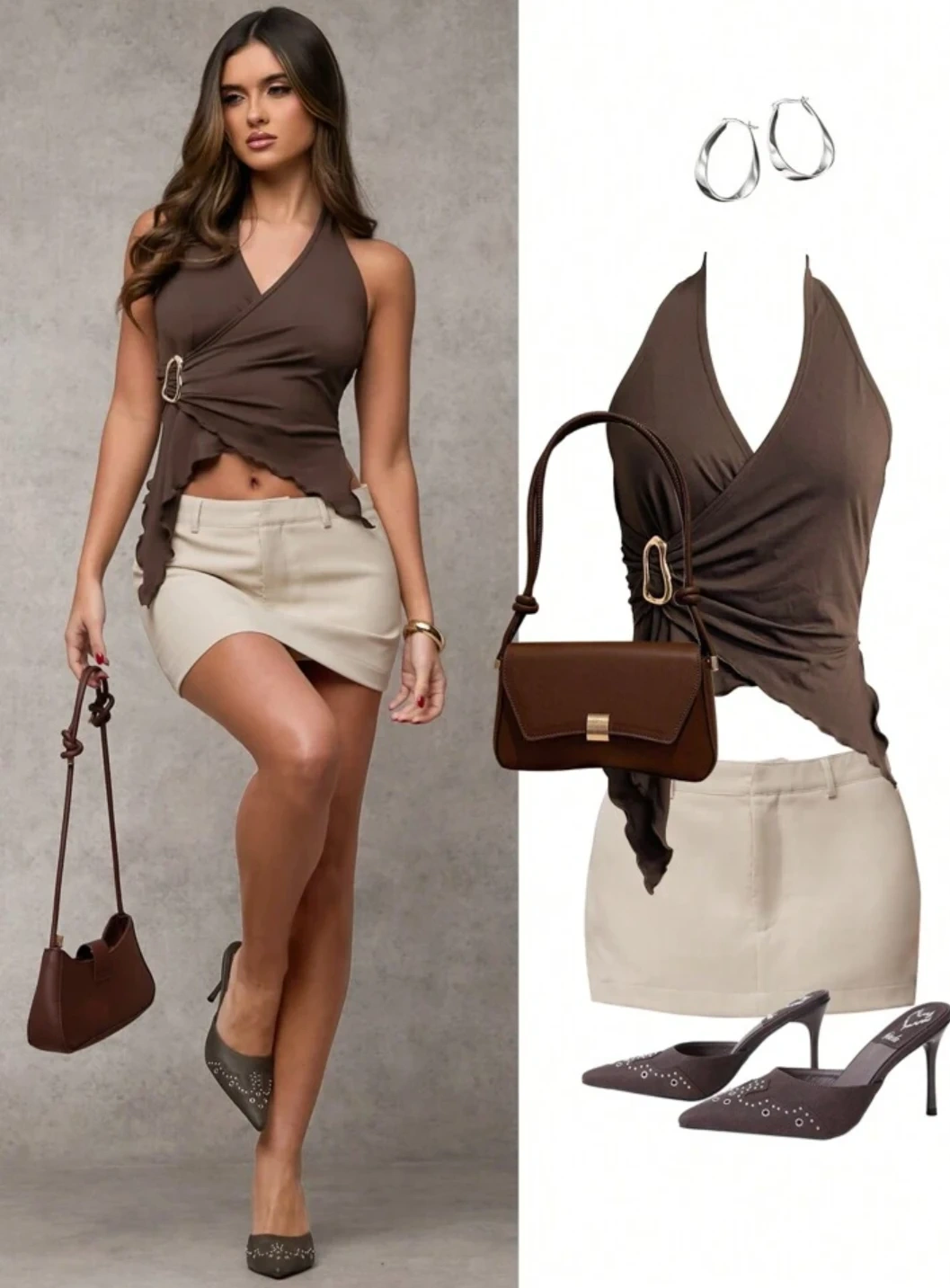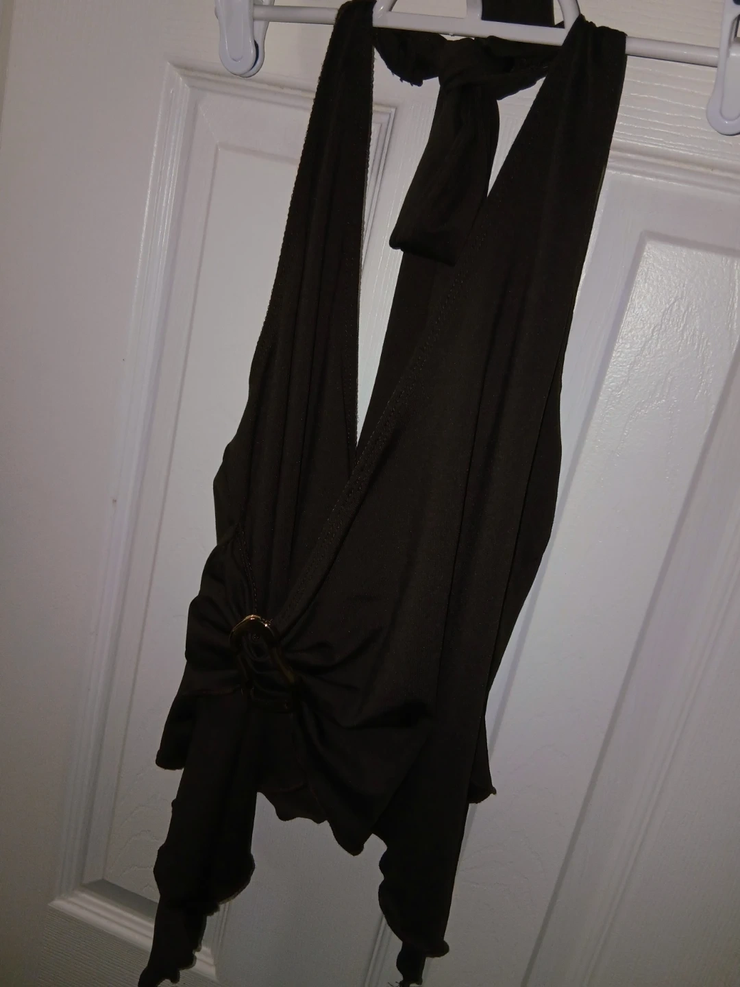 This brown halter neck top features a unique design with a decorative buckle detail. It's made from a soft, stretchy fabric & the hem has a ruffled, asymmetrical finish.