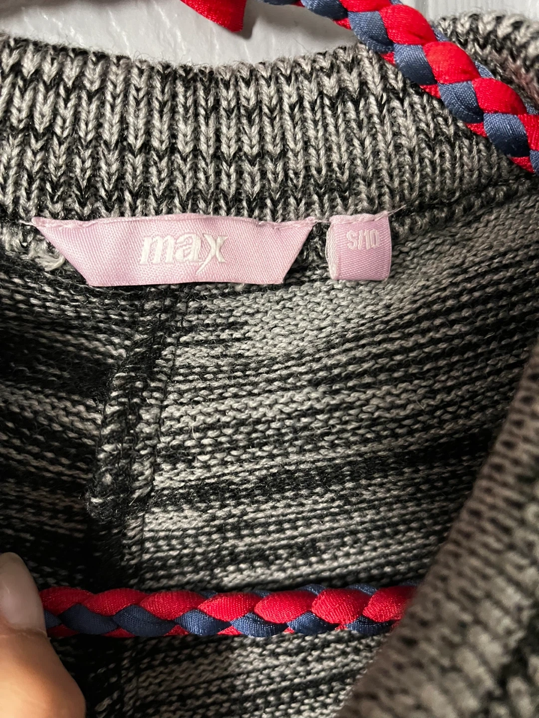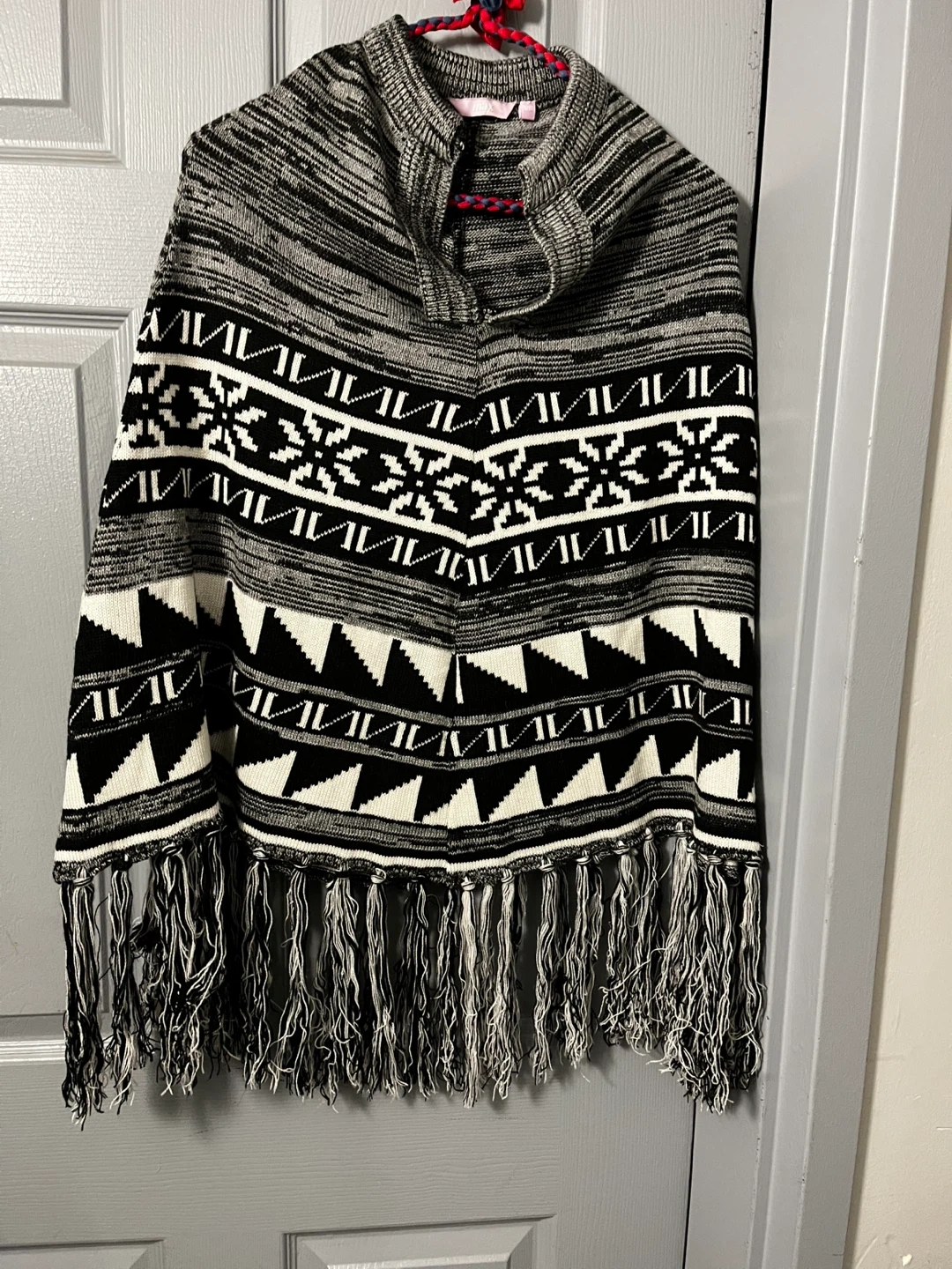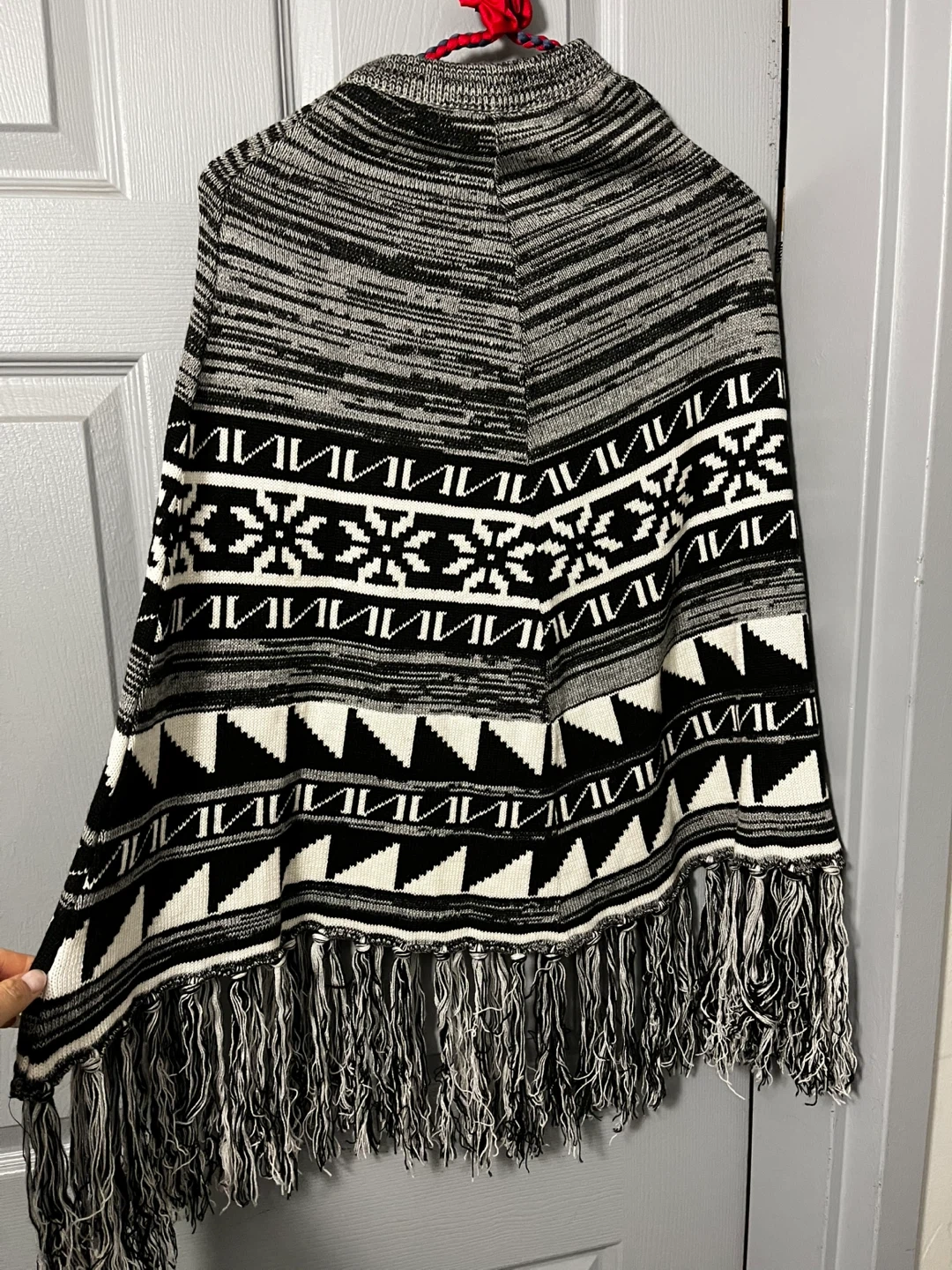 This M Max poncho comes in a size S/M. It features a black, white, and grey patterned knit with fringe detailing. Adds a cozy layer to any outfit!